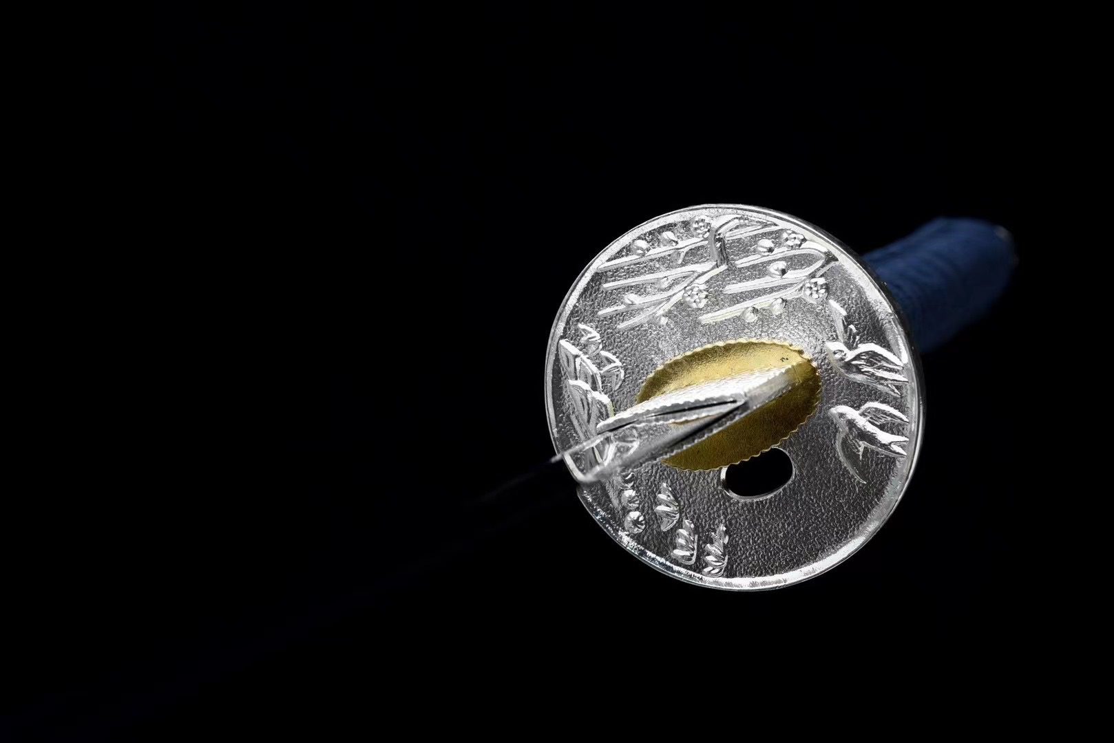 Su hoja de acero T10 presenta un tono azul intenso que recuerda a las nubes de tormenta, mientras que el bo-hi aligera la estructura y crea un característico silbido cuando se mueve. La tsuba redonda de aleación de plata presenta delicados grabados de juncos doblados por el viento y pájaros en vuelo, complementados con un kozuka-hitsu funcional. El mango combina la textura rugosa del falso samegawa blanco con el trenzado tsuka-ito azul en forma de rombos, creando un agarre firme y elegante. Los menuki representan un dragón de plata, que simboliza el dominio de los elementos, mientras que los fuchi y kashira a juego presentan delicados motivos florales. La saya de madera lacada presenta un sutil degradado de negro intenso a gris tormentoso, adornada con motivos azules que parecen bailar como el viento por su superficie.