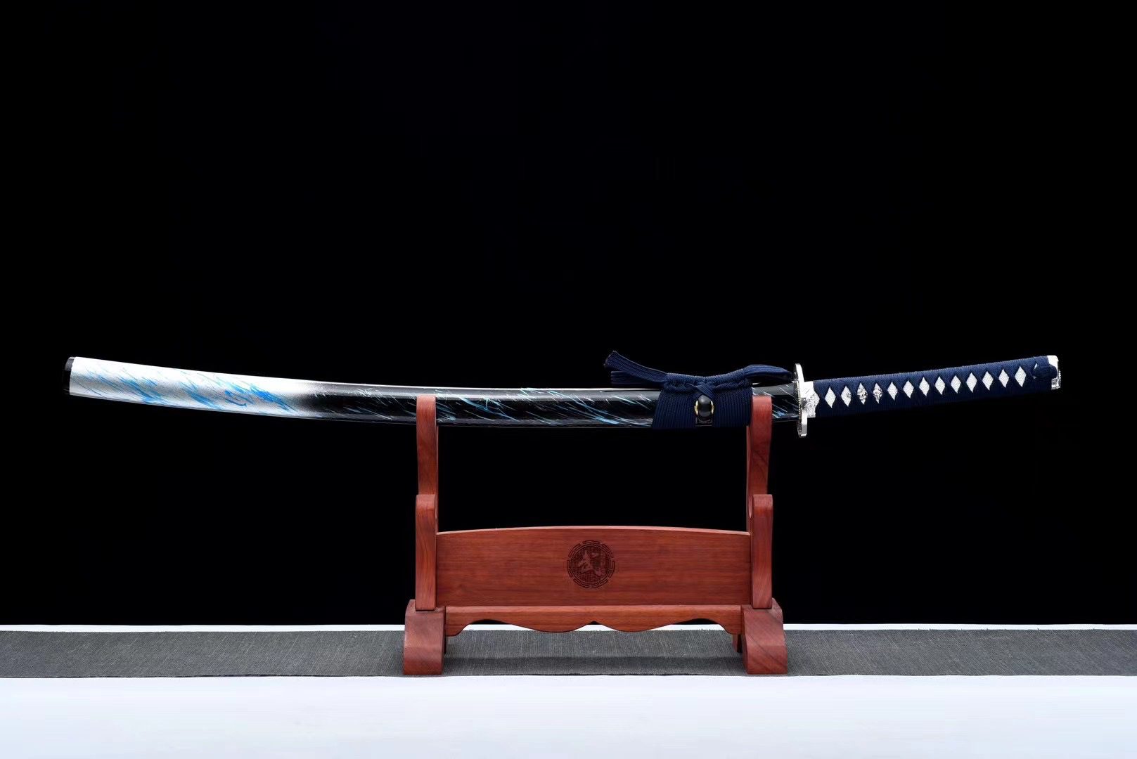 - Vaina (Saya 鞘): madera lacada con un degradado de negro a gris y motivos azules que evocan el viento, kojiri y koiguchi negros.