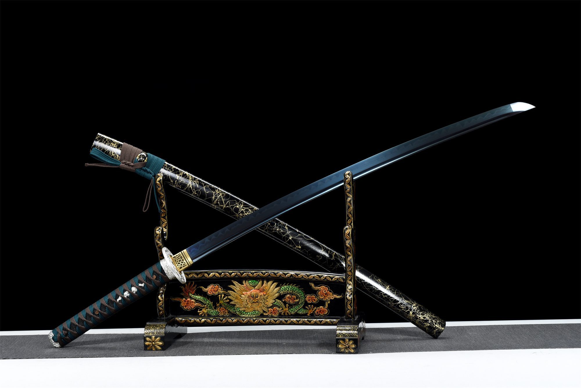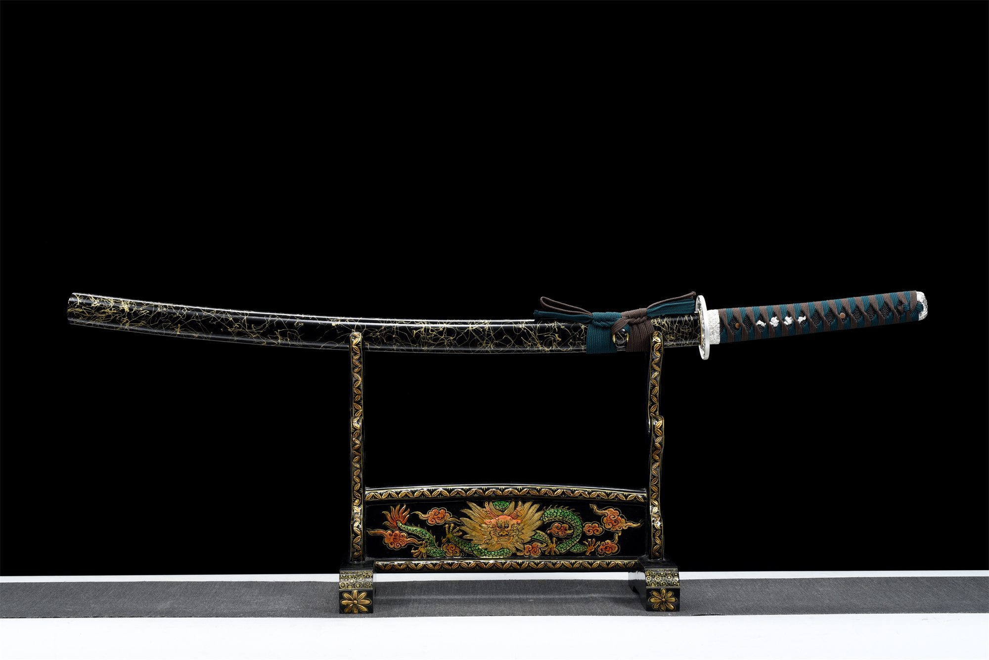 La hoja de acero T10 presenta un tono azul intenso que captura la luz como los reflejos de un lago al atardecer, mientras que el patrón tradicional Hamon crea sus características ondas a lo largo del filo. La tsuba redondeada de aleación de plata presenta un dragón finamente cincelado que parece cobrar vida bajo los cambios de luz y sombras. El mango revela una notable artesanía: la piel de raya negra proporciona un agarre firme y cómodo, cubierta con un trenzado tsuka-ito marrón y azul que forma perfectos rombos geométricos. Los menuki representan dragones blancos que contrastan elegantemente con los tonos oscuros del conjunto. La vaina de madera maciza lacada en negro está decorada con delicados motivos amarillos, creando un llamativo contraste, complementado con un sageo azul y marrón que armoniza con los colores del trenzado.