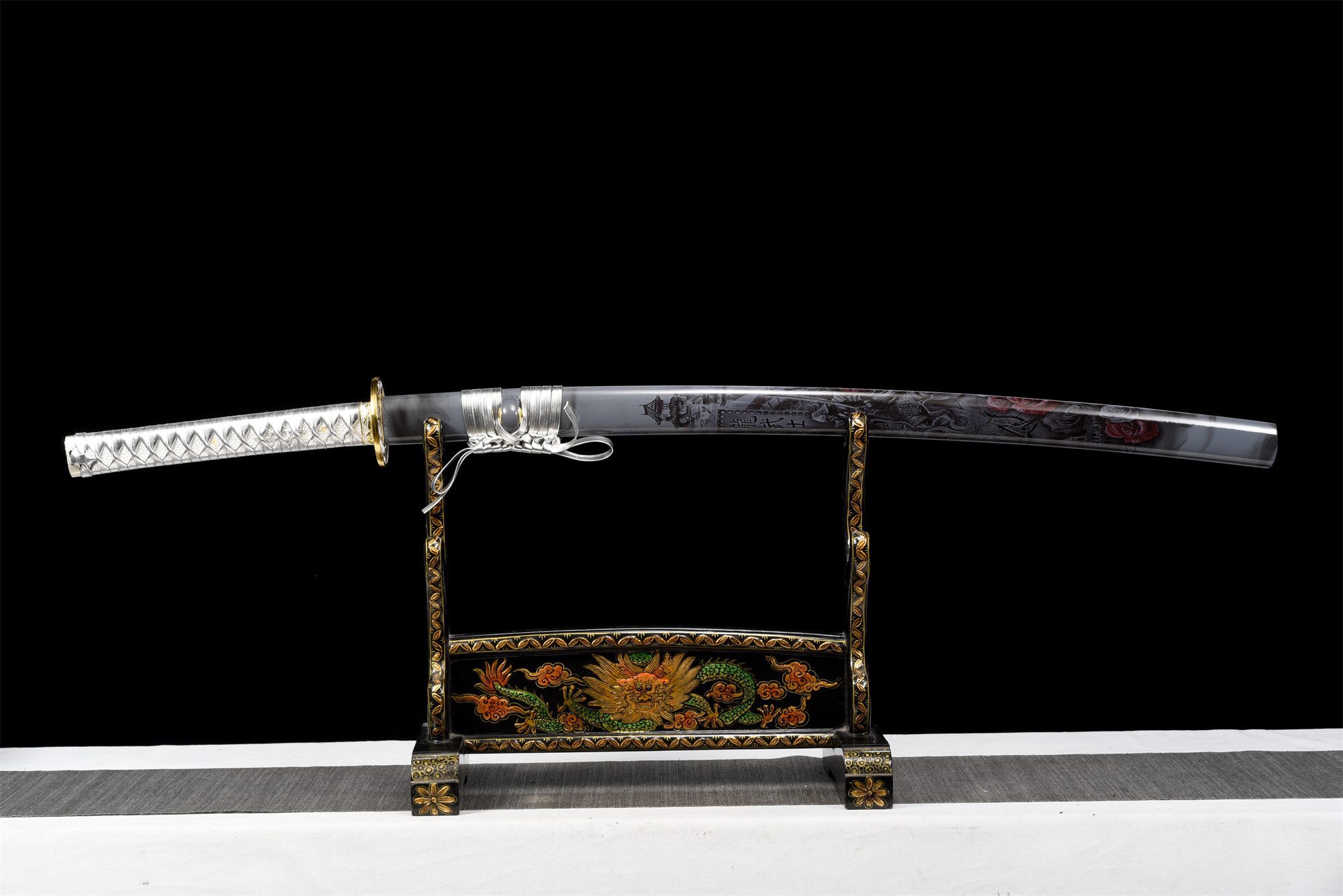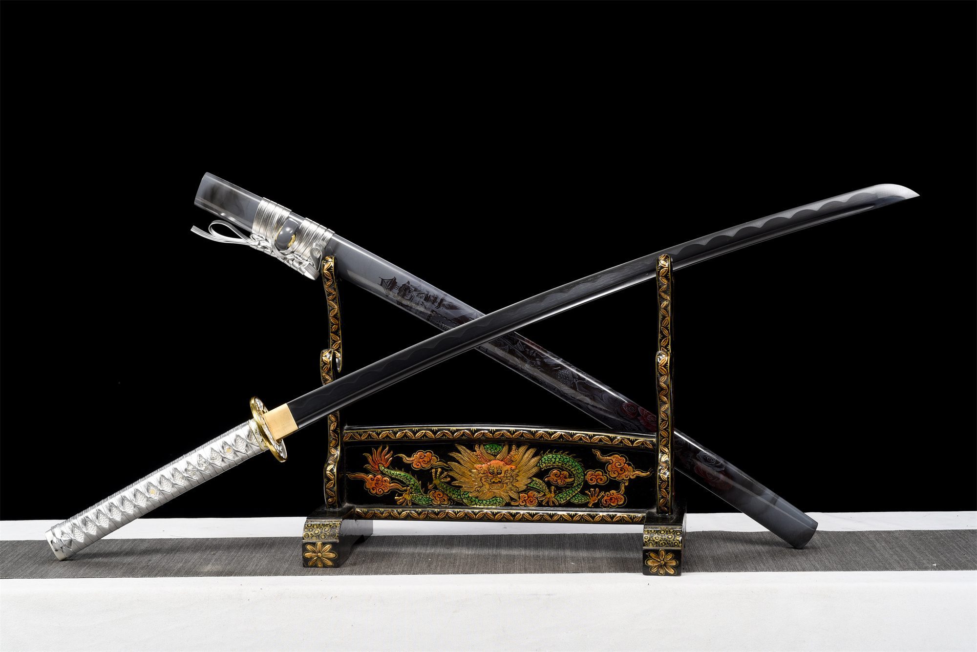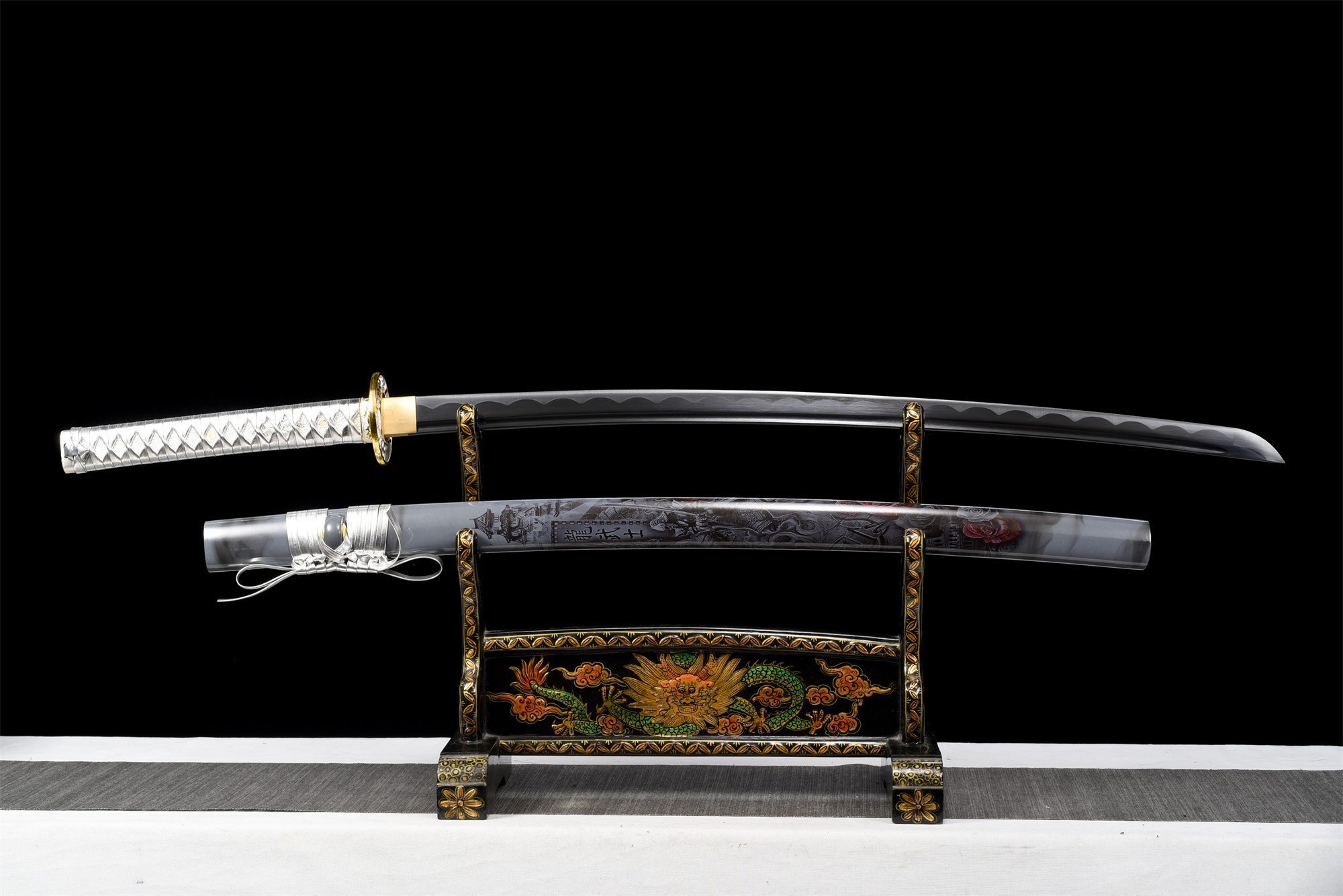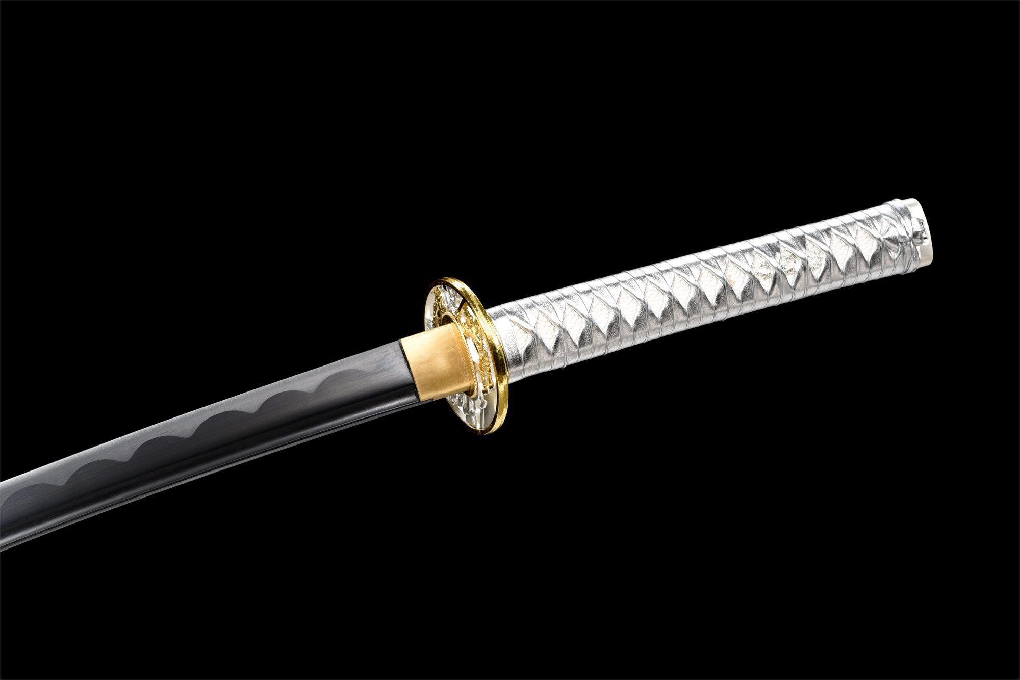 Su hoja de acero 1060 tiene un tono negro intenso que contrasta maravillosamente con el auténtico patrón hamon, obtenido mediante un templado diferencial utilizando técnicas tradicionales. Esta línea ondulada de templado es testimonio de la artesanía involucrada y le da a la hoja su excepcional equilibrio entre flexibilidad y dureza. El bo-hi grabado en la hoja aligera el diseño general y produce un característico silbido cuando se mueve la hoja. La tsuba redondeada, decorada con motivos samuráis finamente cincelados en una aleación de oro y plata, cuenta historias de valor y honor. La empuñadura, recubierta de piel sintética de raya blanca y envuelta en trenzado de cuero sintético plateado que forma rombos regulares, ofrece un agarre firme y elegante. Los menuki plateados completan armoniosamente el conjunto, mientras que la saya de madera lacada en negro y gris está decorada con escenas que representan a samuráis y una ciudad tradicional japonesa, creando un verdadero cuadro narrativo.