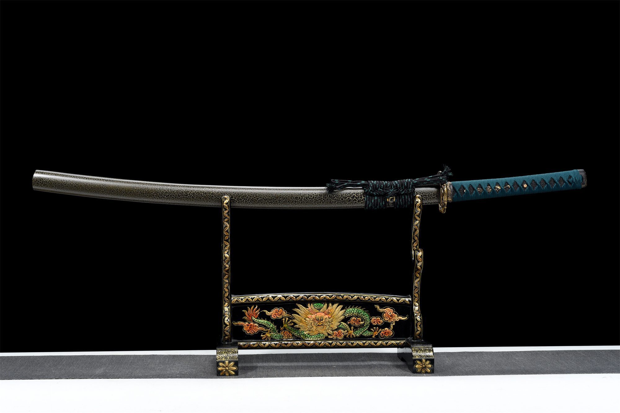Su hoja de acero damasco dorado revela hipnóticas ondas que recuerdan a las escamas de una serpiente, mientras que su acabado dorado captura y refleja la luz con una intensidad mística. La tsuba redondeada de cobre presenta una serpiente finamente cincelada enroscada alrededor de la guarda, creando una notable protección simbólica y estética. La empuñadura de madera maciza recubierta de imitación de piel de mantarraya negra ofrece un agarre firme y cómodo, realzado por un cordón tsuka-ito azul con motivos de rombos que evocan las escamas de un reptil. Los menuki dorados representan dragones, creando un diálogo entre criaturas míticas orientales, mientras que el fuchi de cobre dorado grabado con un dragón completa este tema draconiano. La vaina de madera maciza lacada presenta motivos de panteras pintadas, añadiendo una dimensión felina a esta sinfonía animal, y está rematada con un sageo negro que enfatiza la elegancia discreta del conjunto.