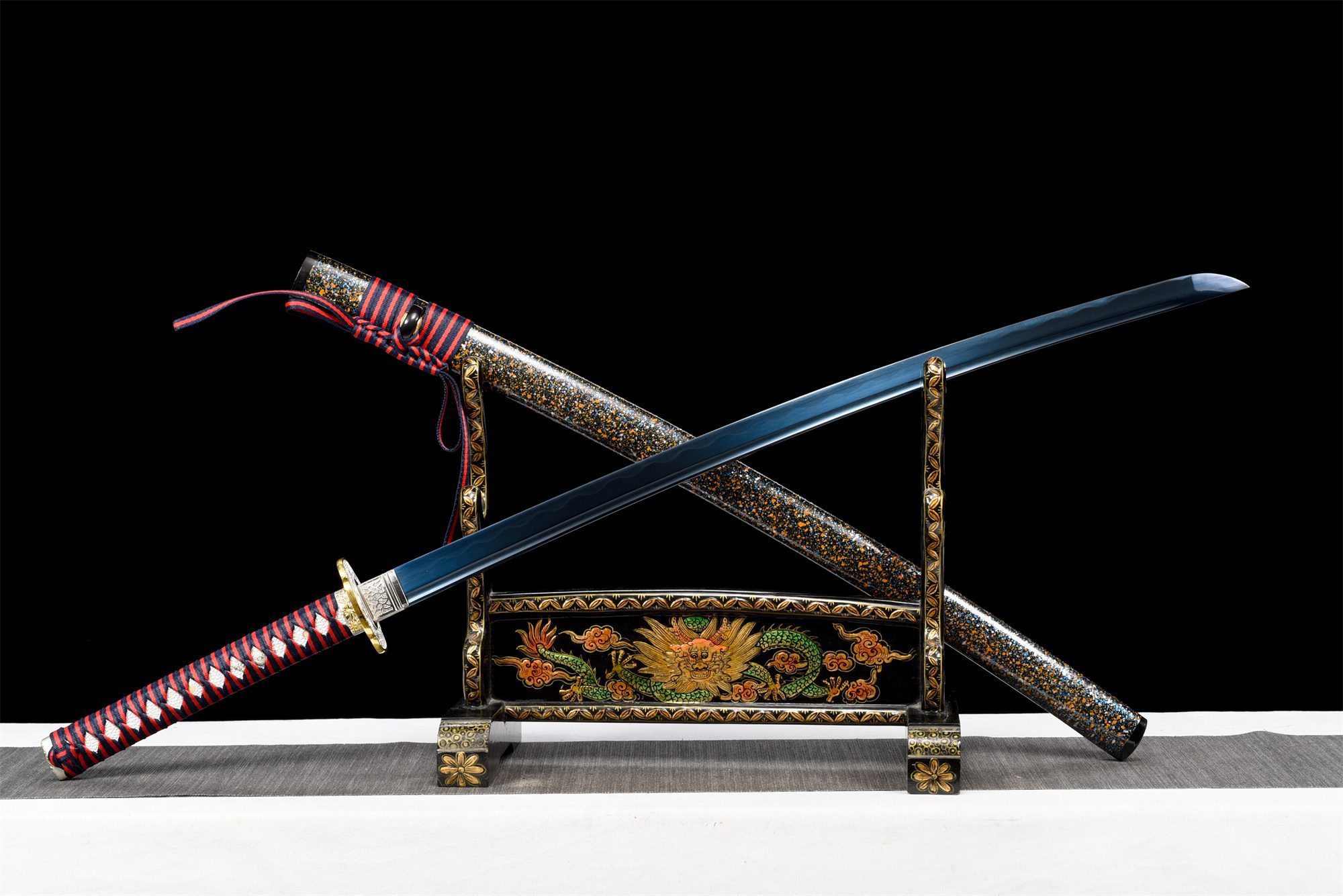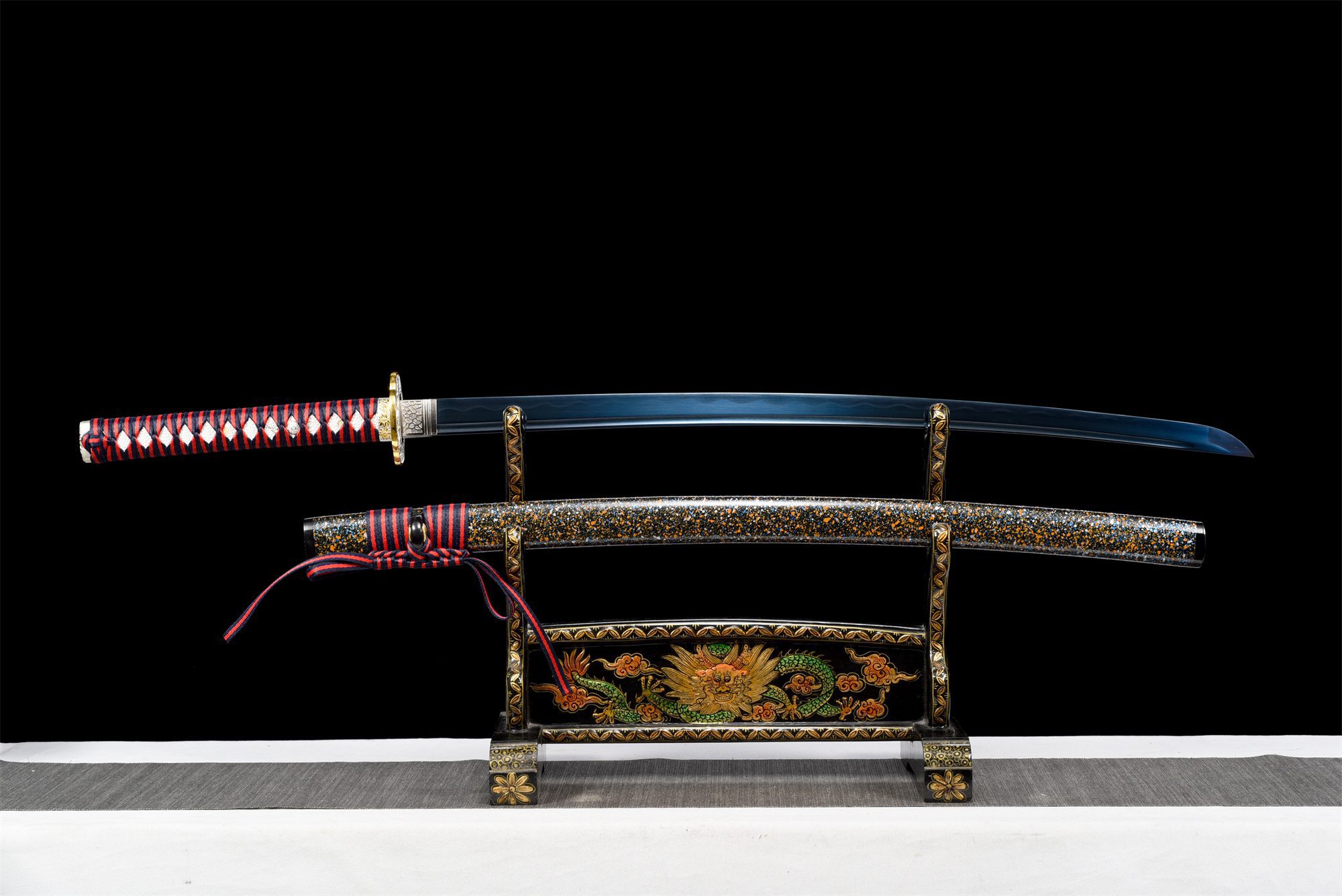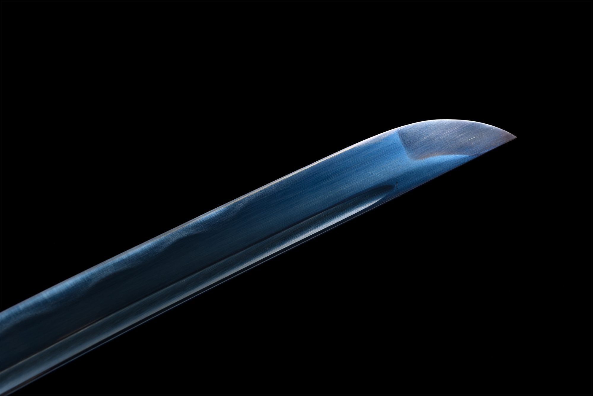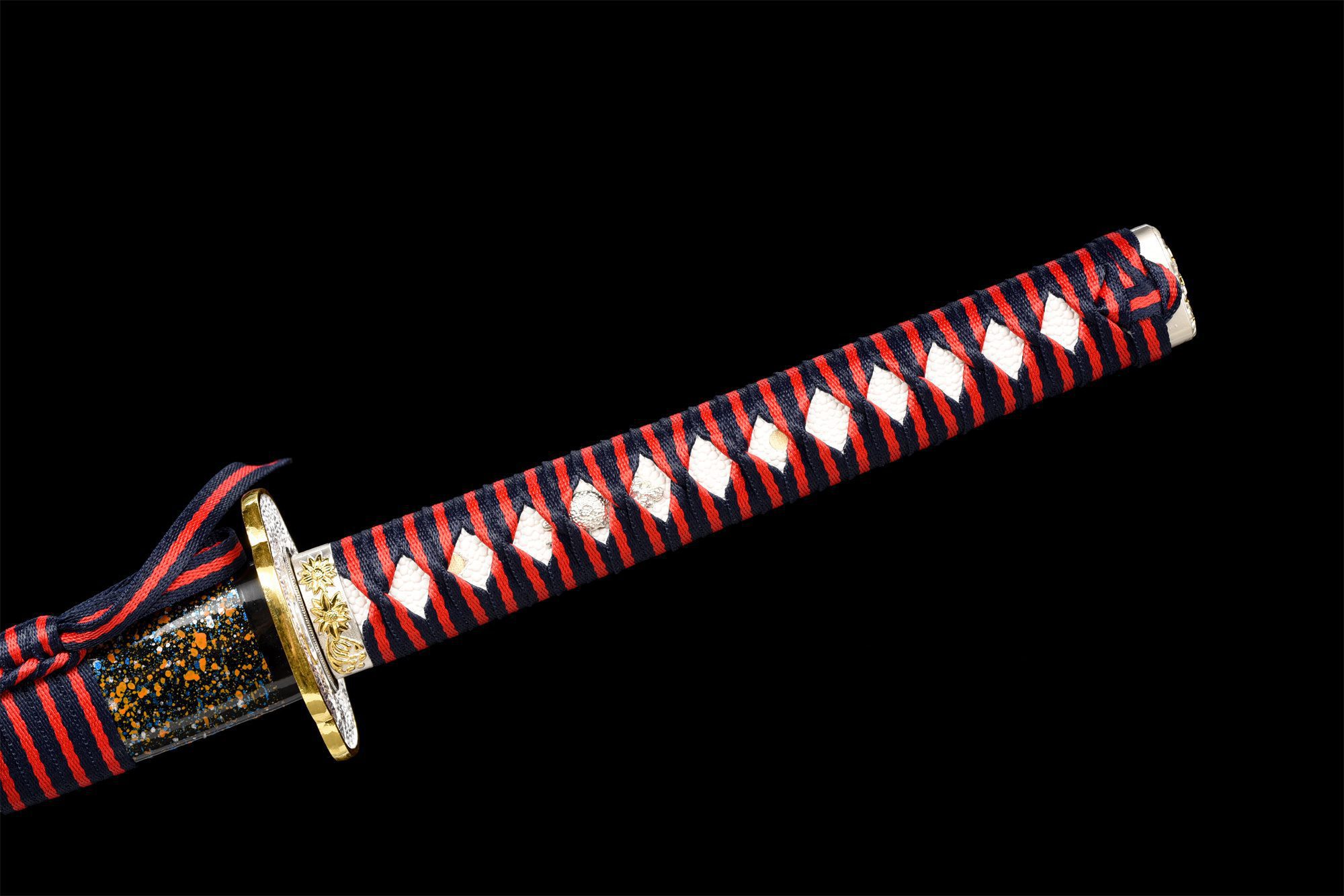 Su hoja de acero 1060 tiene un tono azul intenso que contrasta maravillosamente con el auténtico notare hamon creado por el templado diferencial. El bo-hi aligera la estructura y produce ese característico silbido al cortar. La tsuba dorada en forma de cruz redondeada presenta una multitud de crisantemos plateados grabados con notable precisión, creando un juego de contrastes entre los metales preciosos. El mango combina la textura de la piel de raya blanca sintética con el trenzado tsuka-ito rojo y azul, formando elegantes rombos geométricos. Los menuki de plata se integran armoniosamente en esta composición cromática, mientras que el fuchi y el kashira, en aleación de plata y oro, se hacen eco de los motivos florales de la guarda. La vaina de madera lacada tiene un acabado granulado en tonos naranjas, negros y azules que evoca las puestas de sol sobre los jardines japoneses.