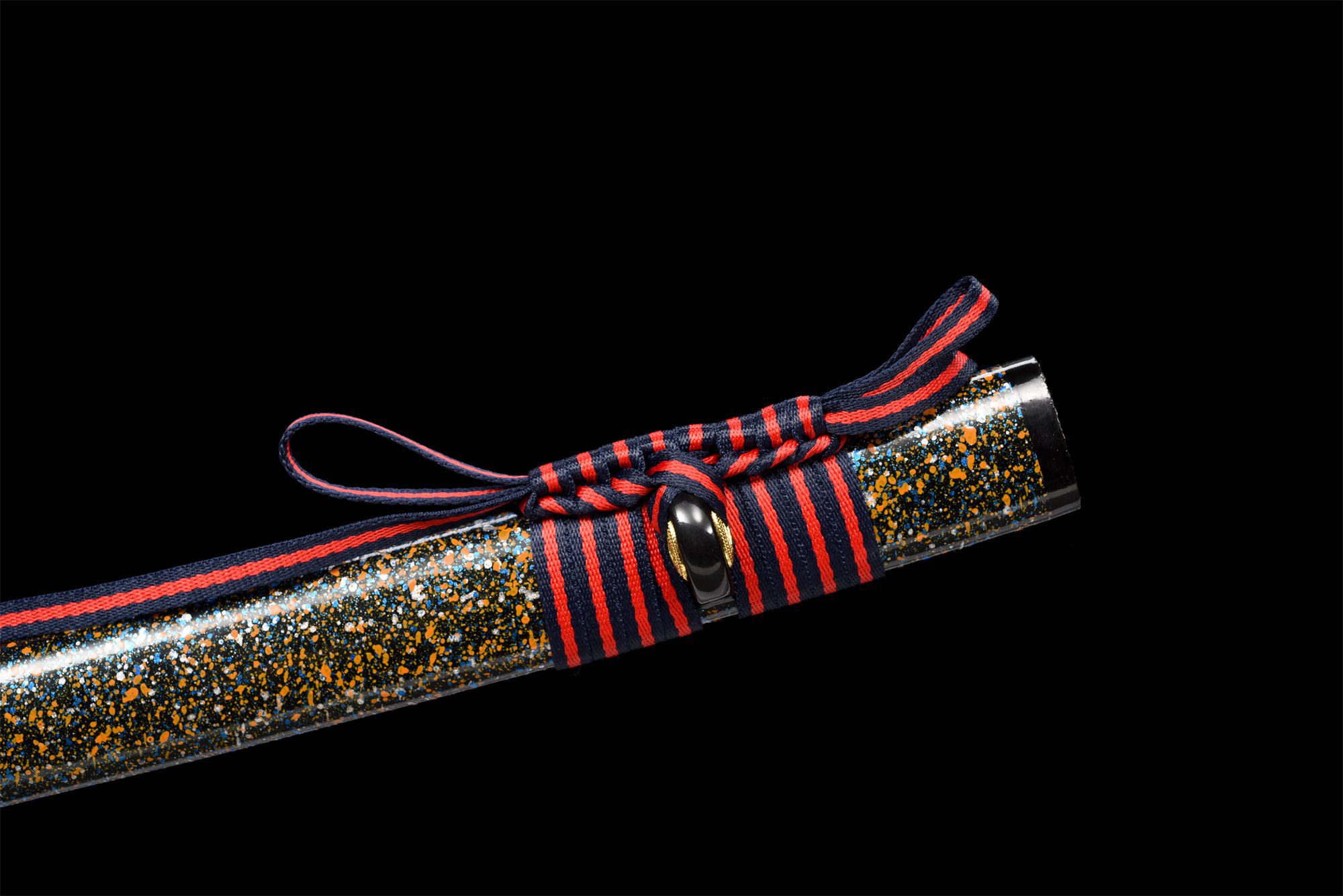 - Vaina (Saya 鞘): Madera lacada con pintura granulada naranja, negra y azul, puntas negras.