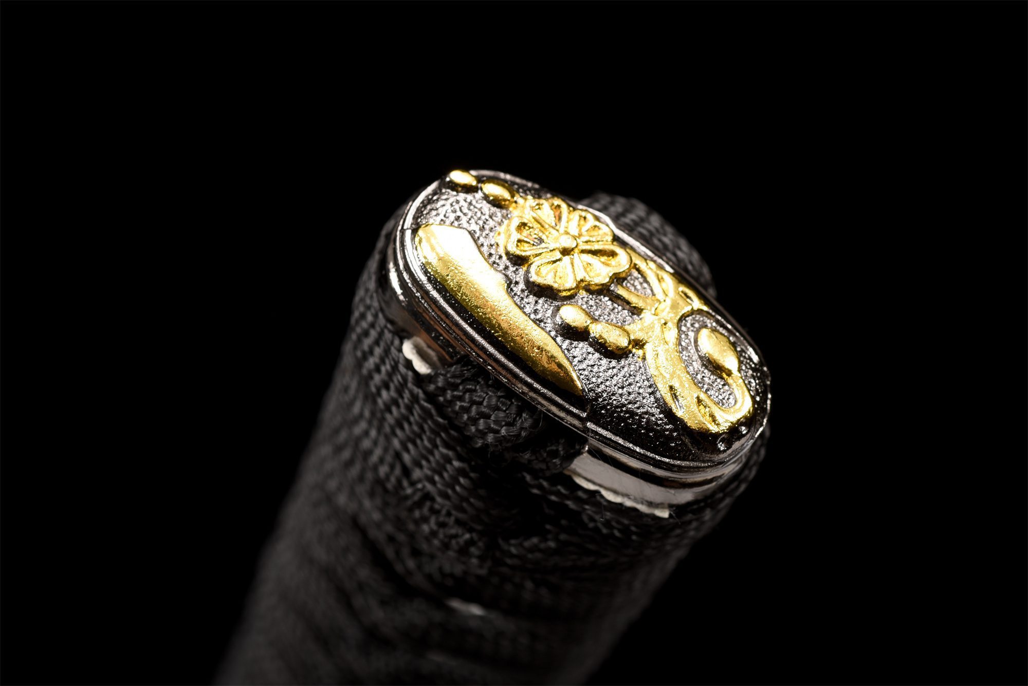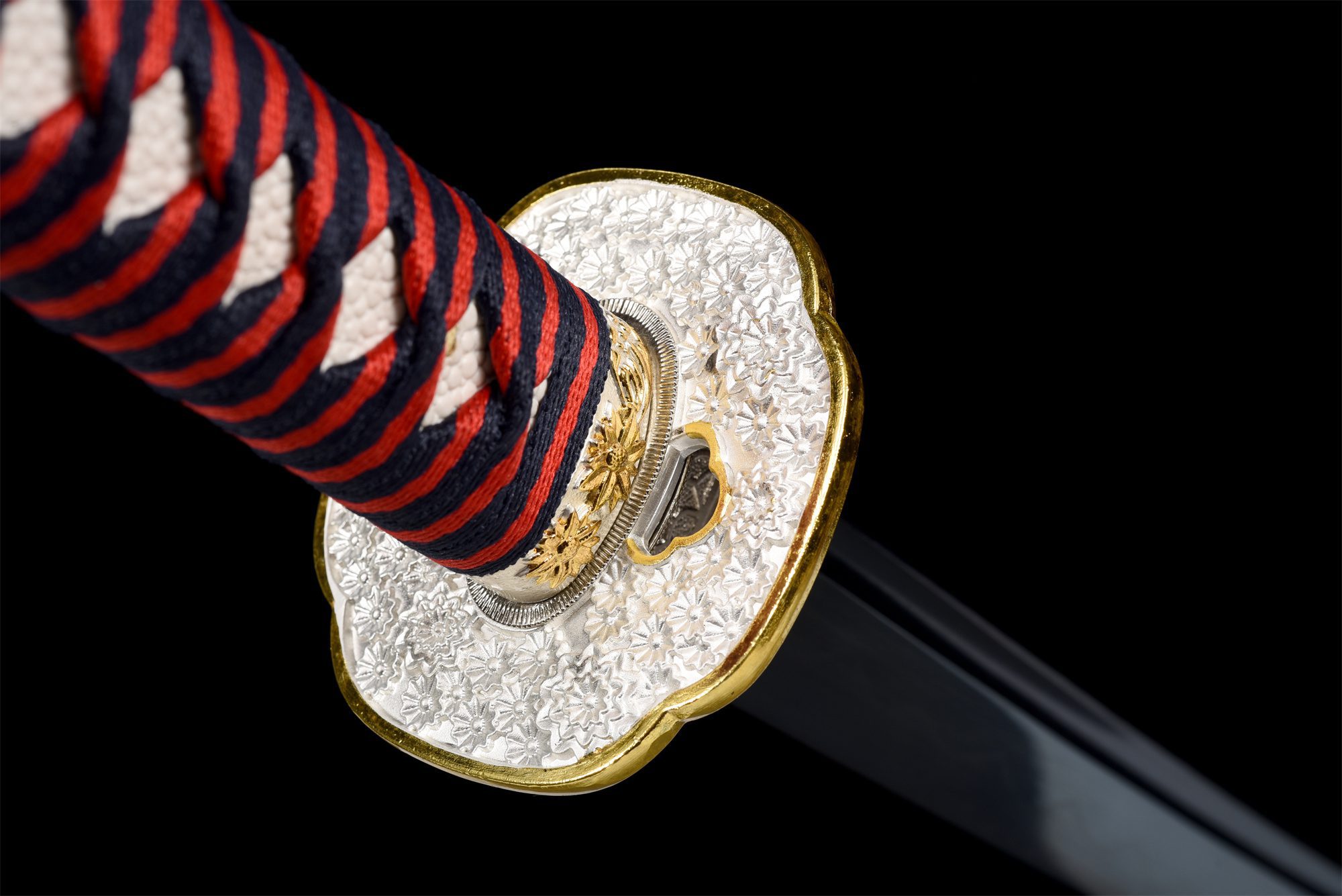 - Guarda (Tsuba 鍔): Forma de cruz redondeada dorada con crisantemos de plata grabados.