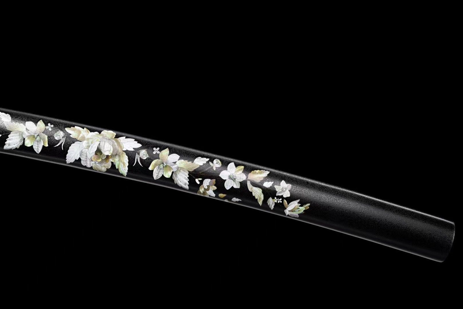 - Vaina (Saya 鞘): madera lacada decorada con flores pintadas, con Kojiri y Koiguchi negros.