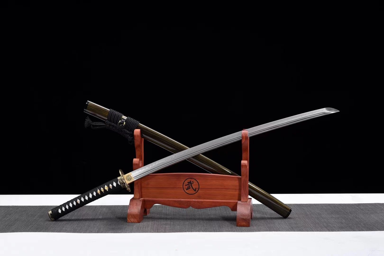 Su hoja de acero T10 revela un auténtico midare hamon obtenido mediante un templado diferencial, creando ondulaciones naturales que bailan a lo largo del filo como la luz de la luna reflejada en el agua. El bo-hi tallado en la hoja aligera el conjunto y produce ese característico silbido al cortar. La tsuba de latón tallada es una obra de arte en sí misma: en un lado presenta a un samurái en meditación y en el otro una calavera que nos recuerda la impermanencia de todas las cosas. La empuñadura (tsuka) combina auténtica piel de raya blanca (samegawa) con trenzado negro (tsuka-ito) en forma de rombos, mientras que los menuki dorados representan un dragón, símbolo de poder y sabiduría. Los elementos de latón martillado (fuchi y kashira) completan armoniosamente el conjunto, y el habaki, decorado con un kamon tradicional, garantiza un ajuste perfecto en la vaina. Su vaina de madera lacada transparente permite admirar el veteado natural de la madera, al tiempo que proporciona una protección óptima para la hoja.