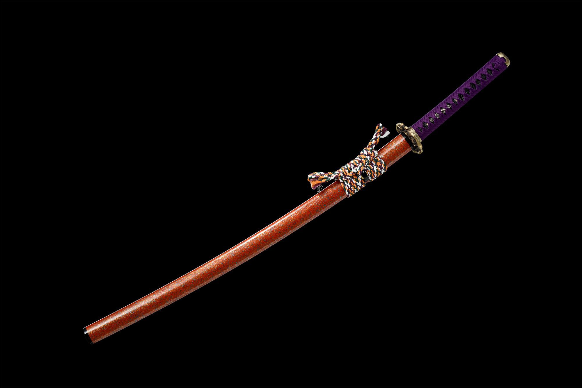 Su hoja de acero T10 revela un auténtico midare hamon con patrones de llamas danzantes, creado mediante un templado diferencial que confiere al acero sus excepcionales propiedades de corte y resistencia. La tsuba redondeada de latón presenta un dragón finamente cincelado, símbolo del poder y la sabiduría orientales, mientras que el fuchi y el kashira a juego llevan grabados que evocan las olas y el viento, elementos naturales que representan el movimiento perpetuo y la fuerza invisible. El mango combina auténtica piel de raya (samegawa) y madera maciza, envuelta en un trenzado púrpura (tsuka-ito) que contrasta elegantemente con los menuki dorados que representan dragones. La vaina naranja con reflejos granulados amarillos y azules crea una combinación de colores atrevida, complementada por un sageo multicolor naranja, verde, púrpura y blanco que añade un toque de refinamiento al conjunto.
