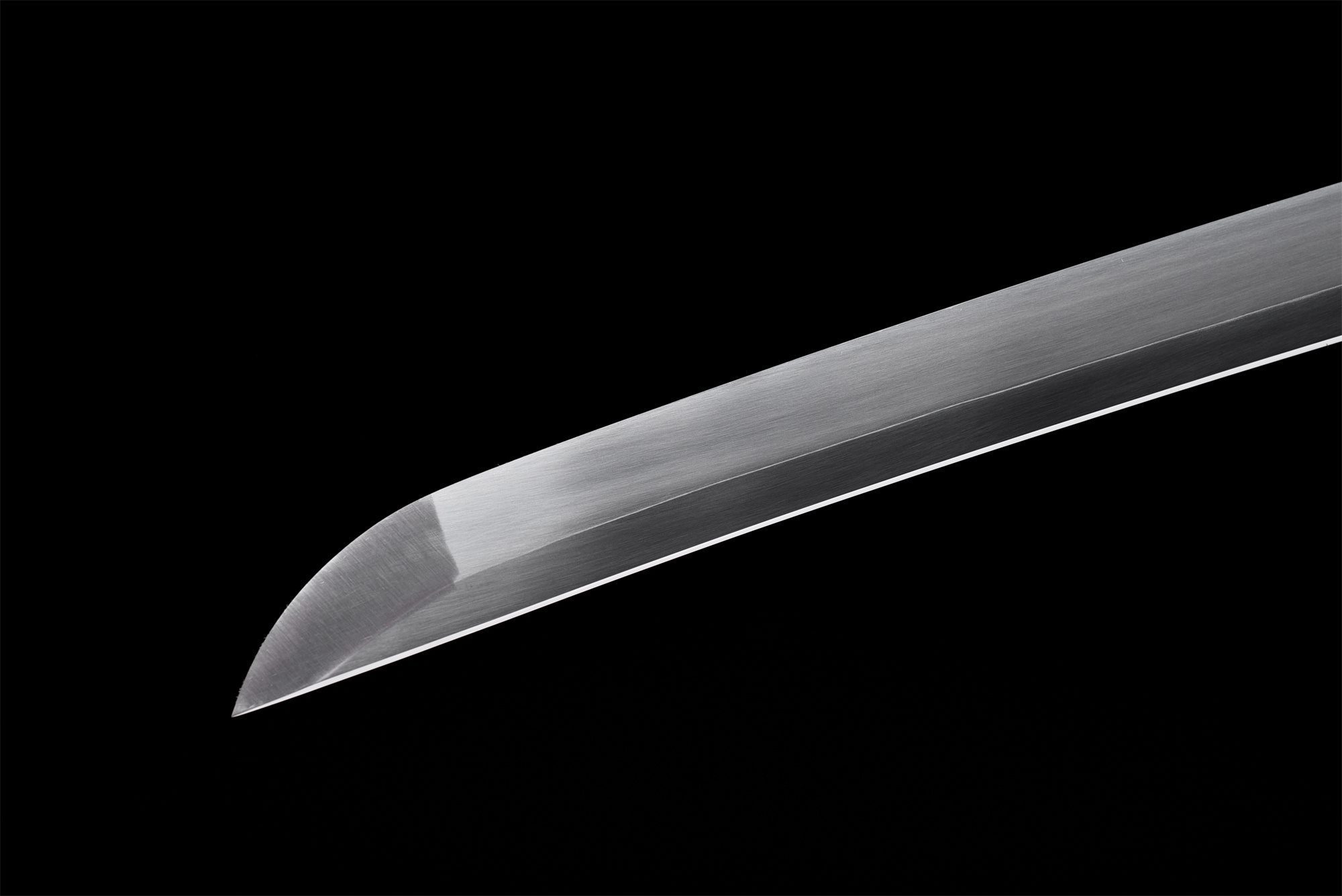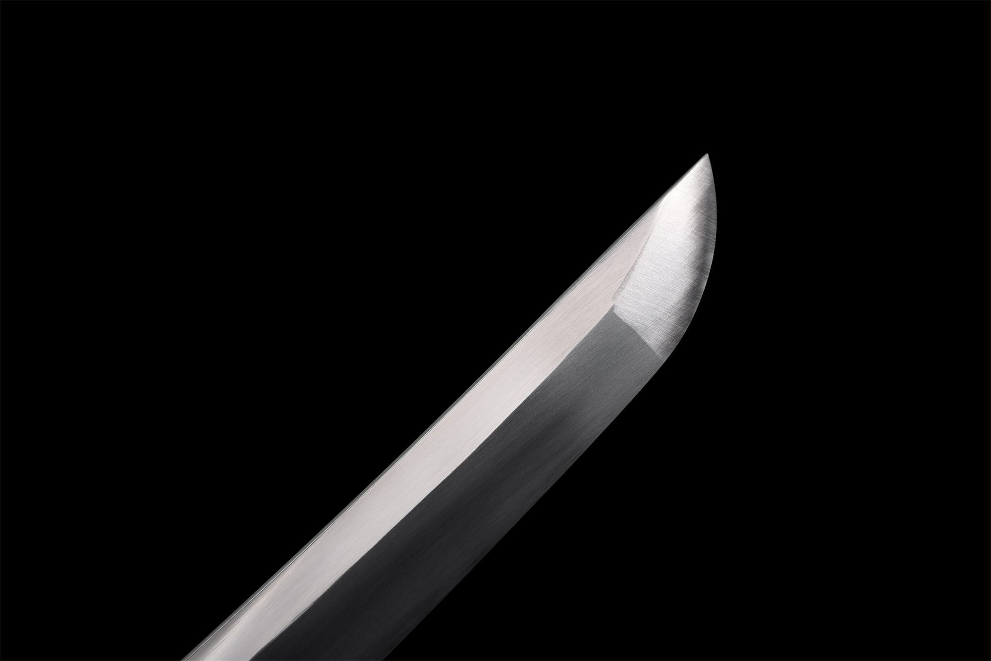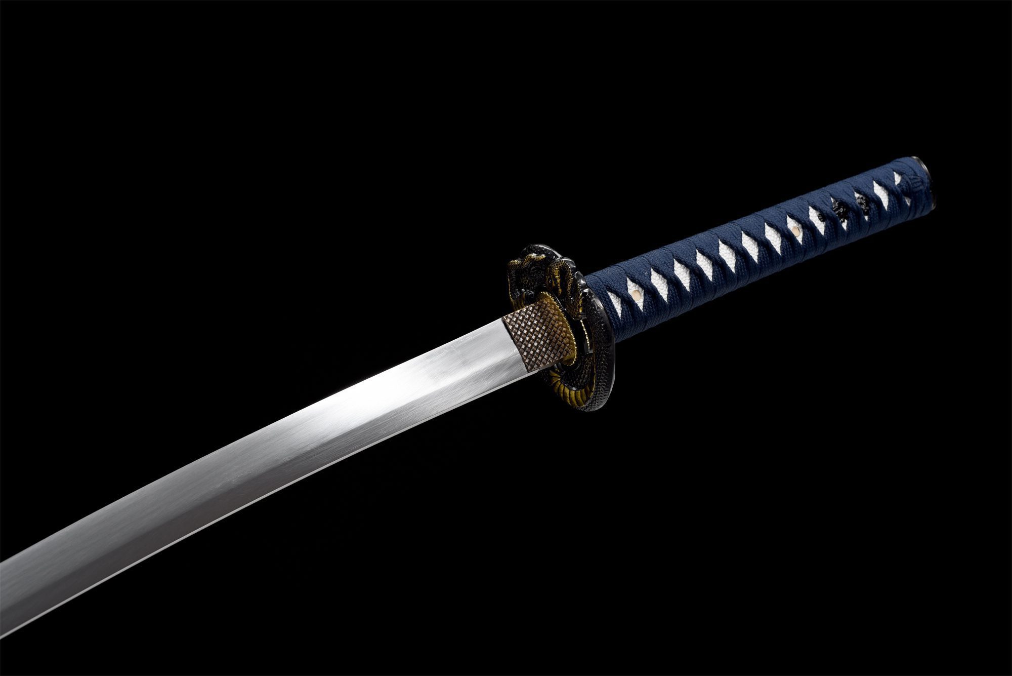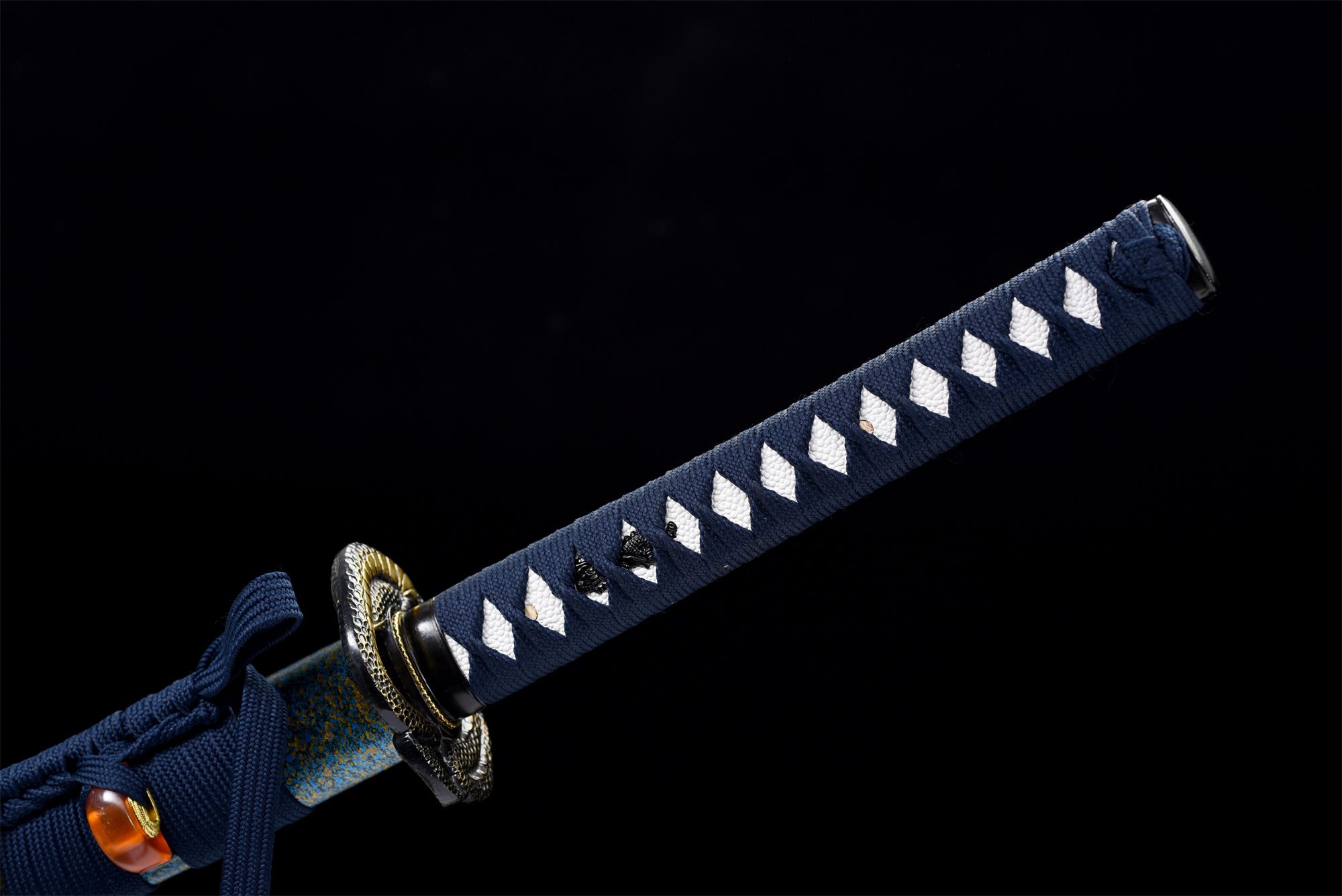 Su hoja de acero al manganeso tiene un color acero natural que capta sutilmente la luz, mientras que el habaki negro grabado con escamas de serpiente crea una transición armoniosa hacia la guarda. La tsuba redonda de aleación de cobre destaca por su representación artística de una serpiente marina enroscada, que muestra un notable trabajo de cincelado. La empuñadura combina elegantemente piel de raya blanca sintética y madera, realzada por un trenzado tsuka-ito azul en forma de rombos que evoca las olas del mar. Los menuki representan un dragón negro, creando un diálogo visual con el tema serpentino, mientras que el fuchi y el kashira, de aleación negra lisa, proporcionan un acabado refinado. La vaina de madera lacada presenta una pintura de grano azul cielo y dorado que captura la esencia de las profundidades del océano, complementada con un sageo azul con un accesorio naranja que recuerda los colores de la puesta de sol sobre el océano.