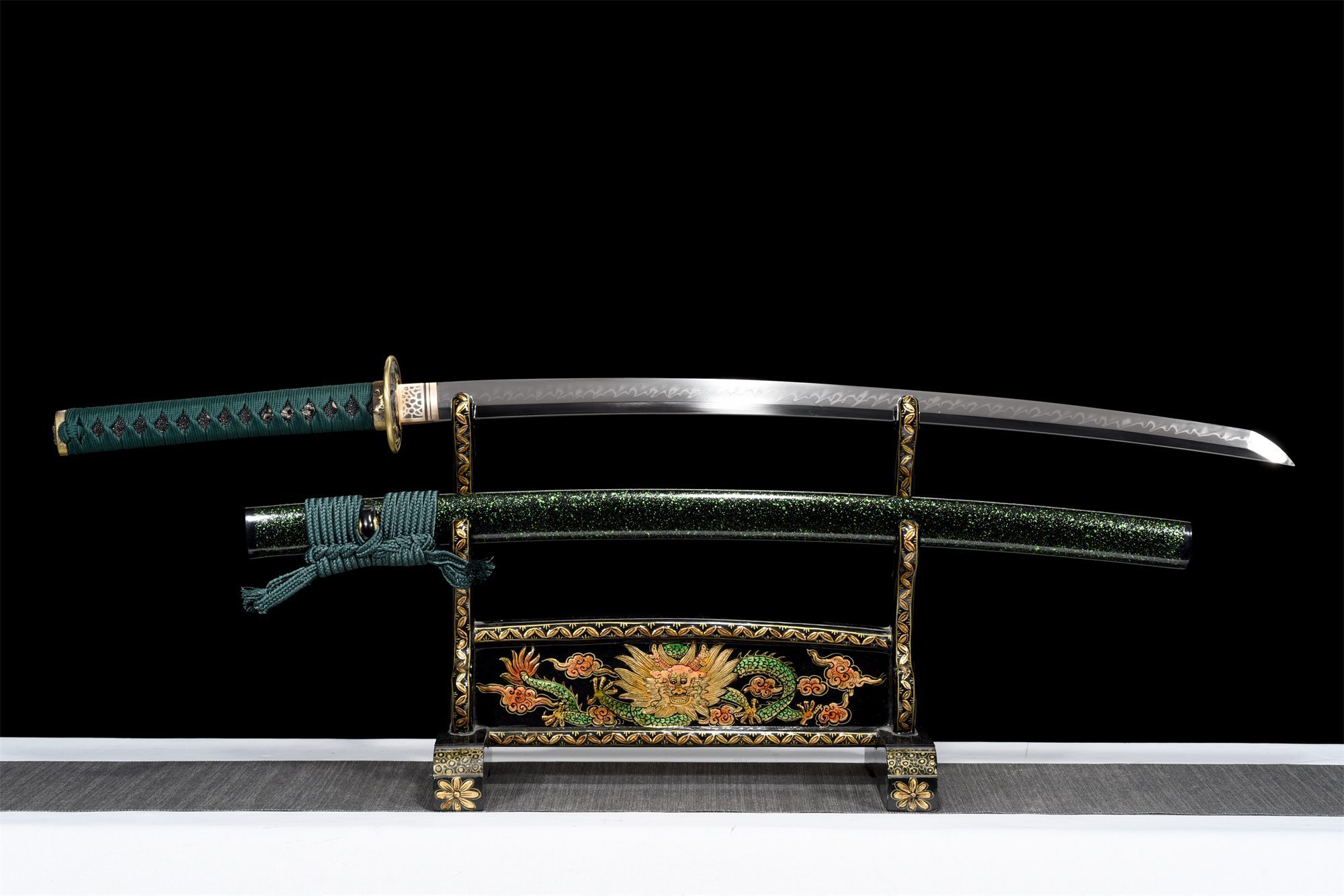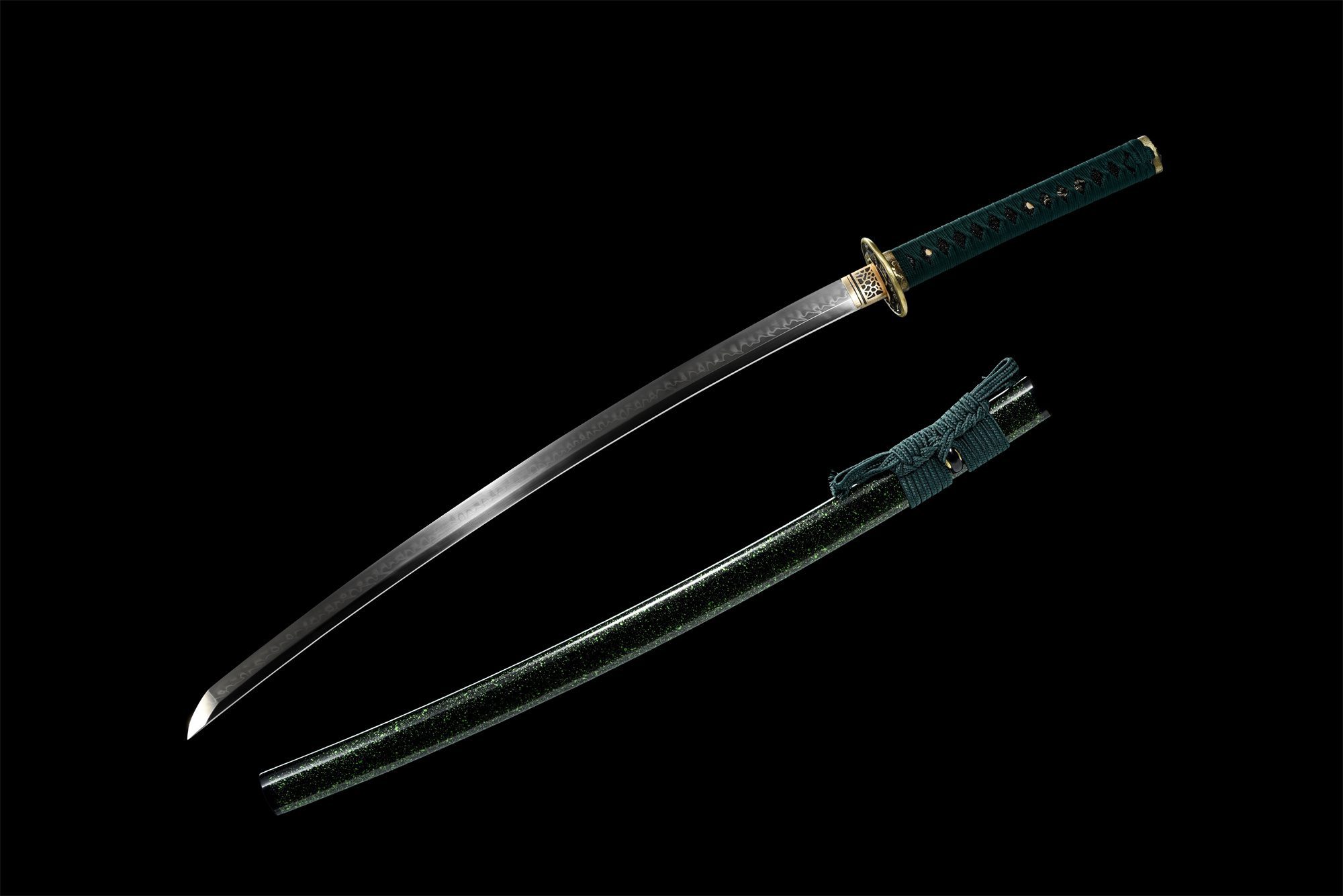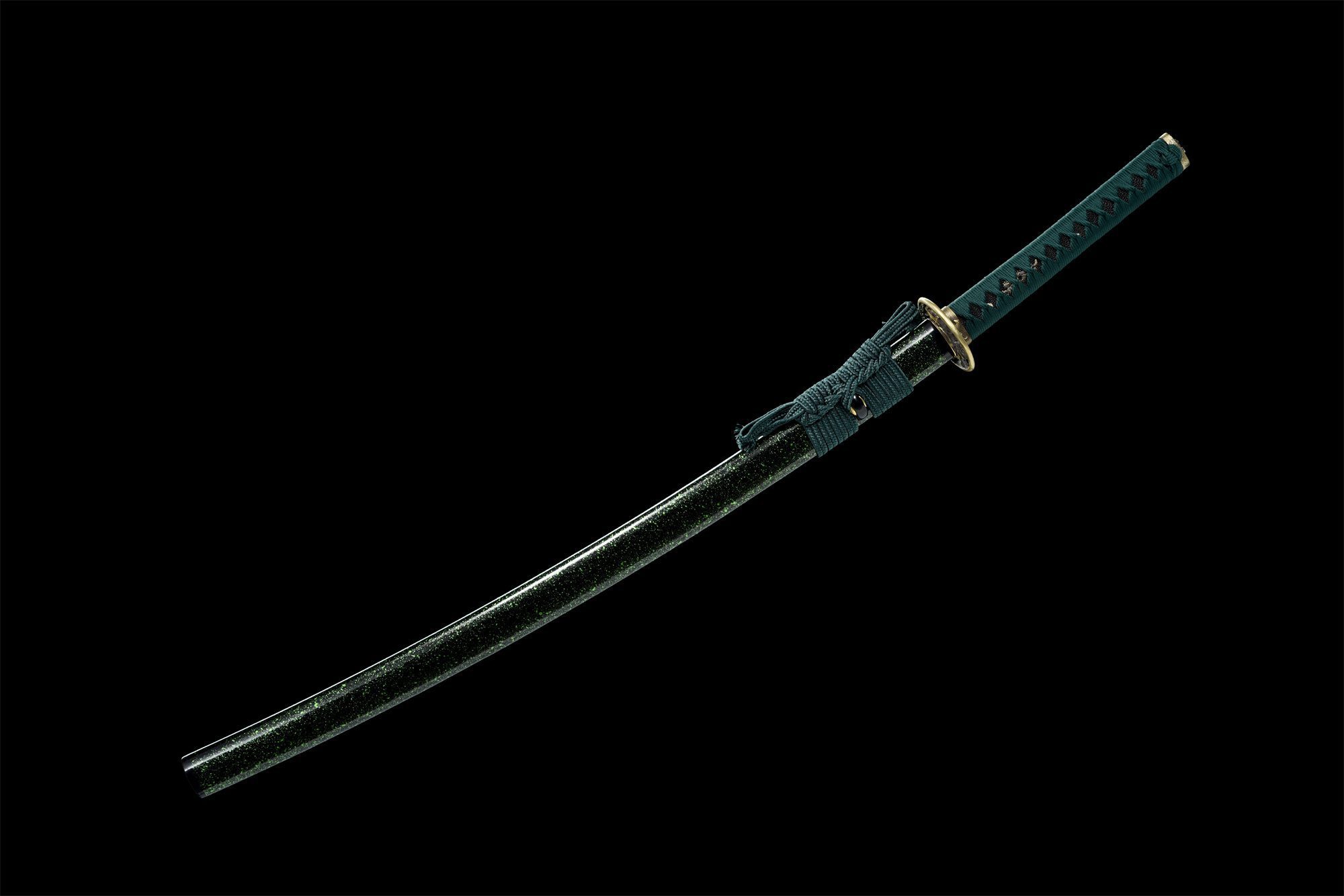 - Vaina (Saya 鞘): Madera lacada granulada en negro y verde, Koiguchi de cuerno auténtico.