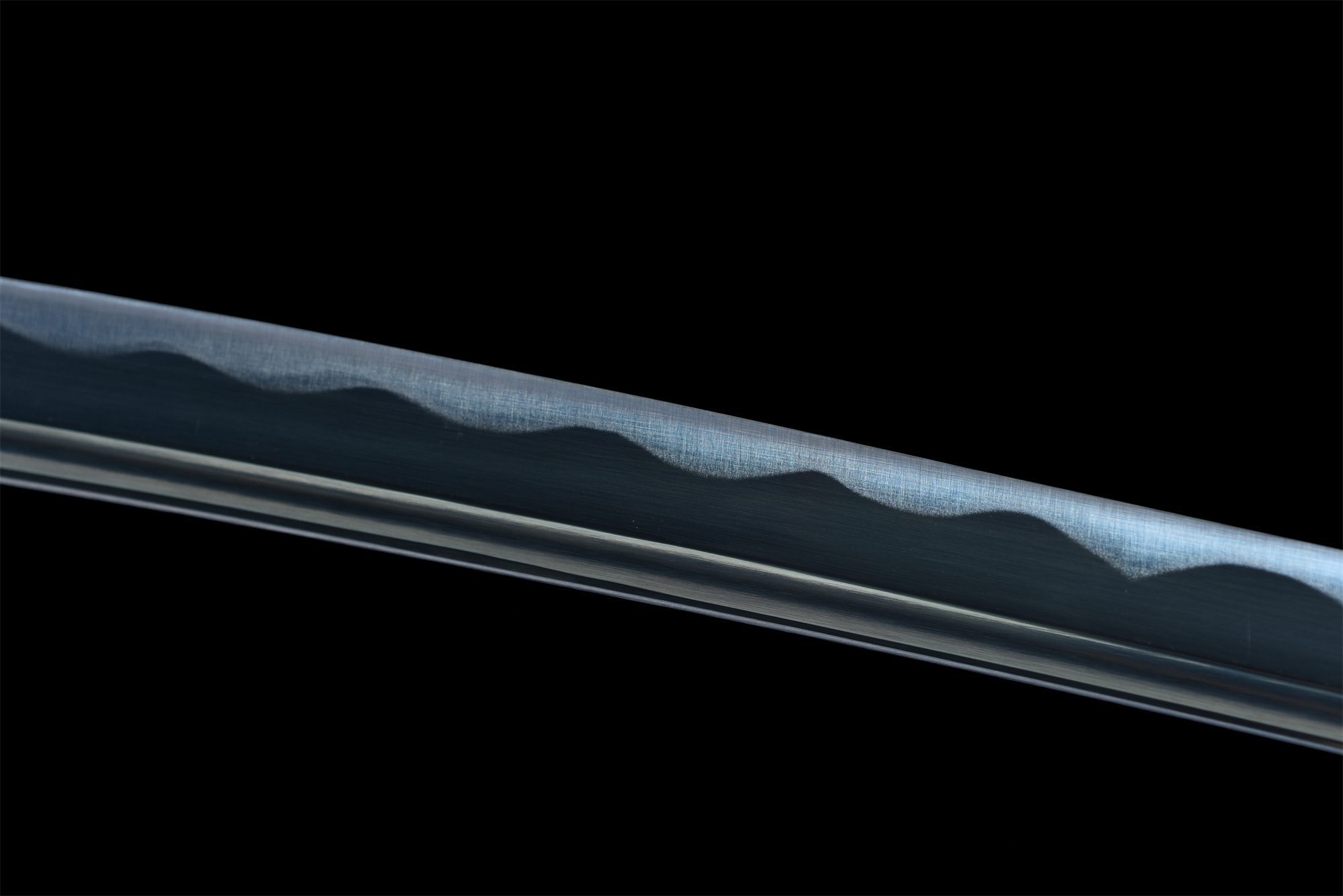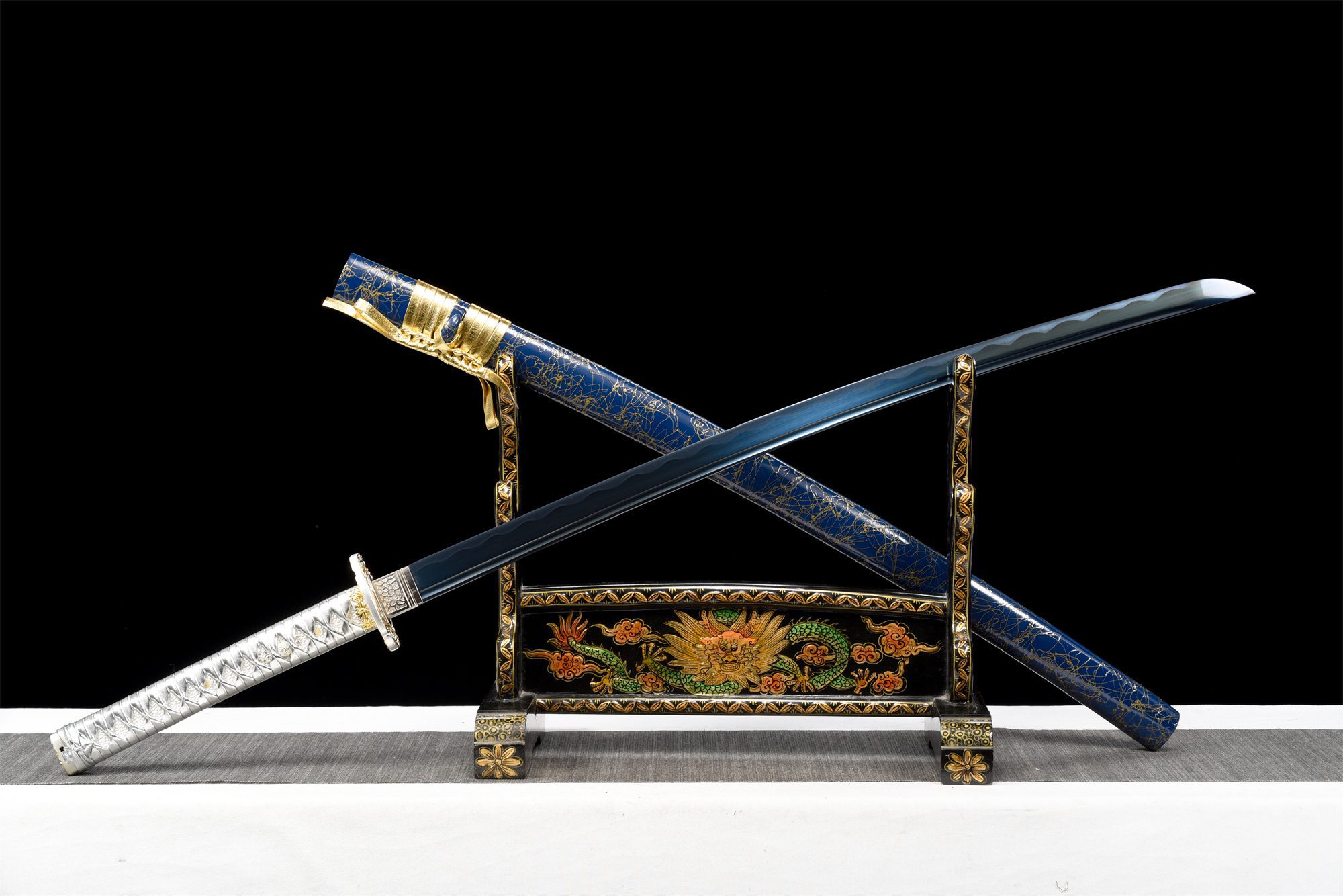 Su hoja de acero 1060 presenta un tono azul intenso que captura la luz con una intensidad notable, mientras que el auténtico notare hamon crea ondas cristalinas a lo largo del filo. El bo-hi ahueca elegantemente la parte posterior de la hoja, reduciendo su peso y conservando su rigidez estructural. La tsuba redondeada en forma de cruz, hecha de aleación de plata realzada con acabados dorados, evoca símbolos celestiales y terrestres. El mango combina la tradicional piel de raya blanca sintética con trenzado de cuero sintético gris que forma sofisticados patrones de diamantes, mientras que los menuki de plata acentúan el agarre con toques refinados. La vaina de madera lacada en azul y dorado armoniza perfectamente con la estética general, complementada por un sageo de cuero dorado que añade un toque de lujo.