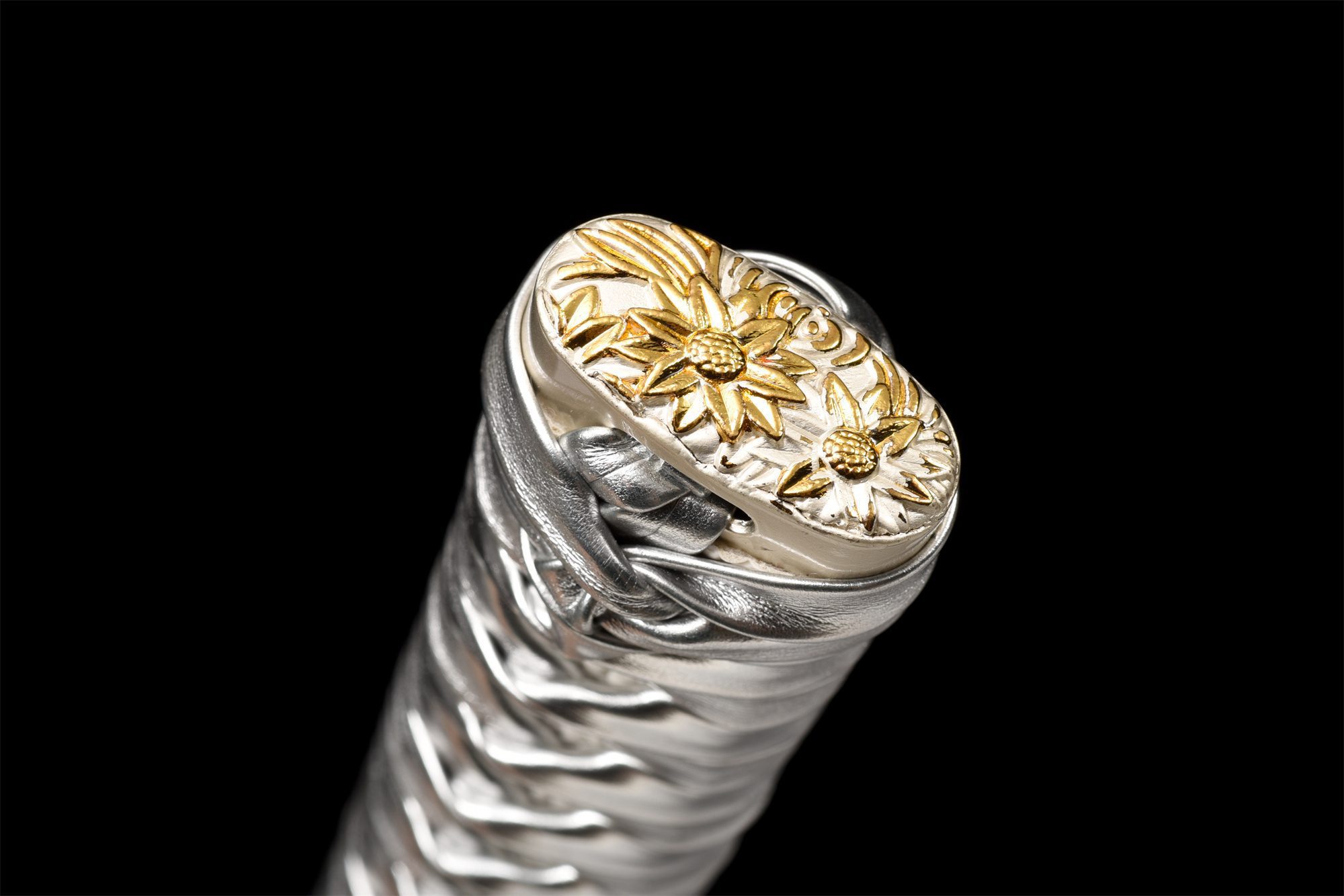 - Kashira (頭): Aleación de plata con acabados dorados y motivos florales.