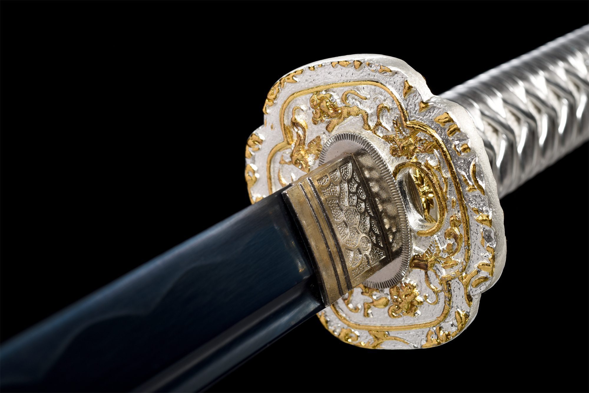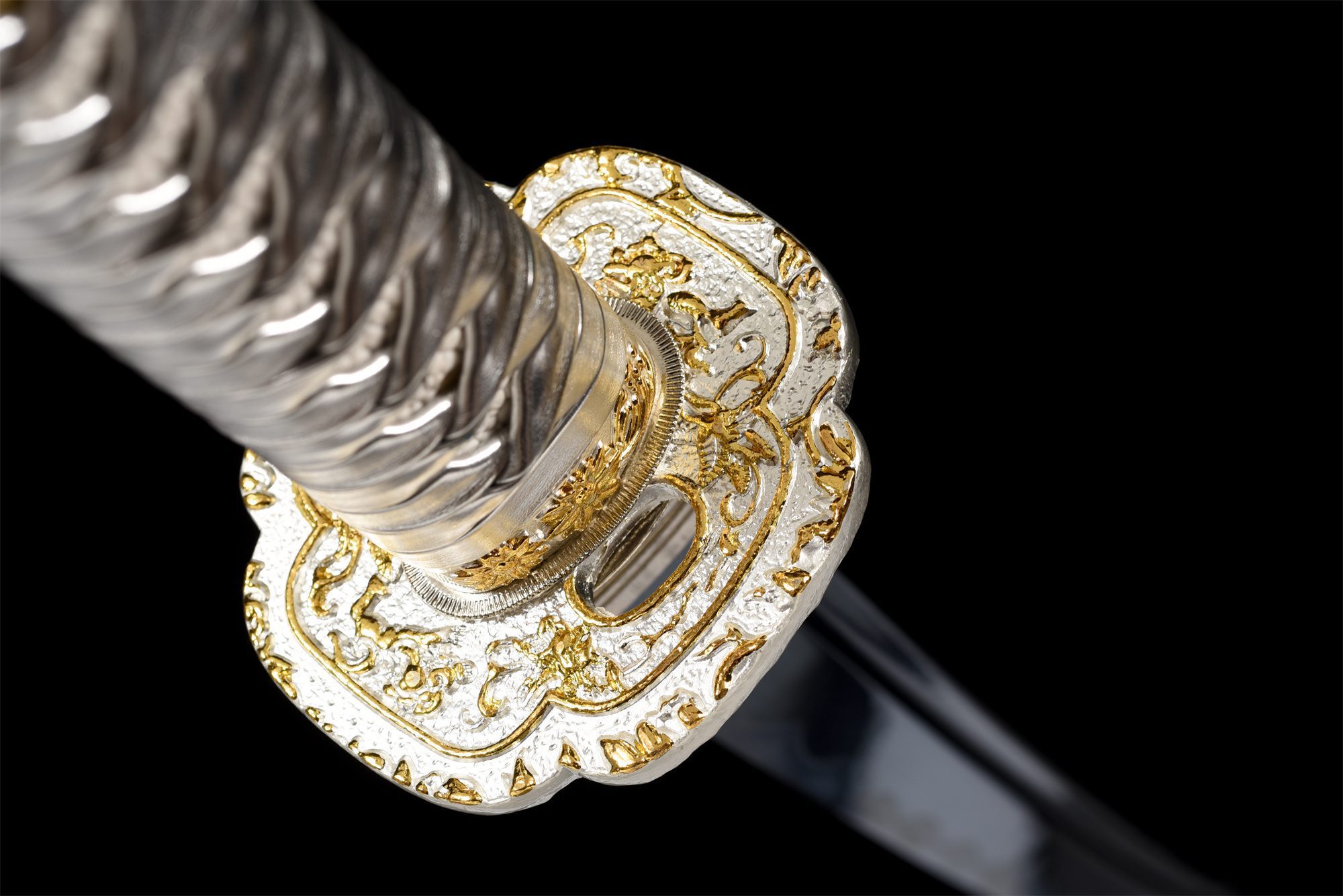 - Fuchi (縁): Aleación de plata con acabados dorados y motivos florales.