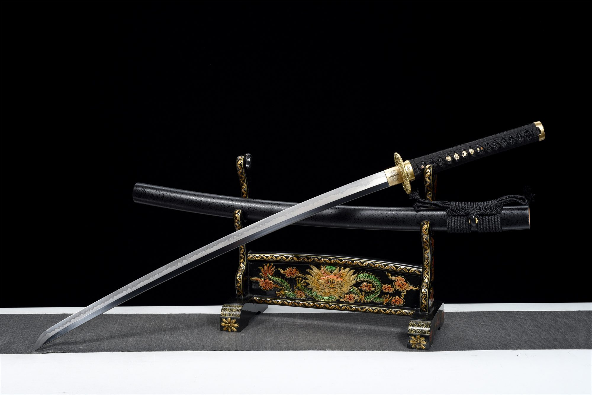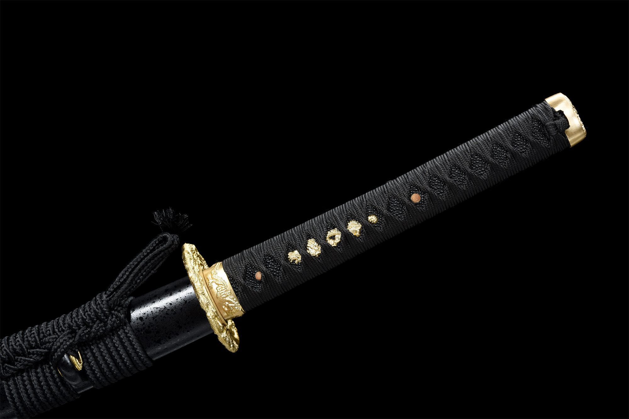 Su hoja de acero T10 presenta un acabado negro intenso que contrasta maravillosamente con el hamon visible, creando un llamativo juego de luces y sombras. La tsuba redondeada y dorada presenta un dragón finamente cincelado que se enrosca alrededor de la guarda, símbolo del poder y la sabiduría orientales. La empuñadura combina armoniosamente madera maciza y piel sintética de raya negra, mientras que el tsuka-ito negro forma patrones geométricos de rombos que garantizan un agarre firme y elegante. Los menuki representan dragones dorados que armonizan perfectamente con el fuchi y el kashira, también en oro, creando una notable unidad estética. La vaina de madera maciza lacada en negro completa este refinado conjunto, adornada con un sageo negro que respeta la sobriedad general del arma.