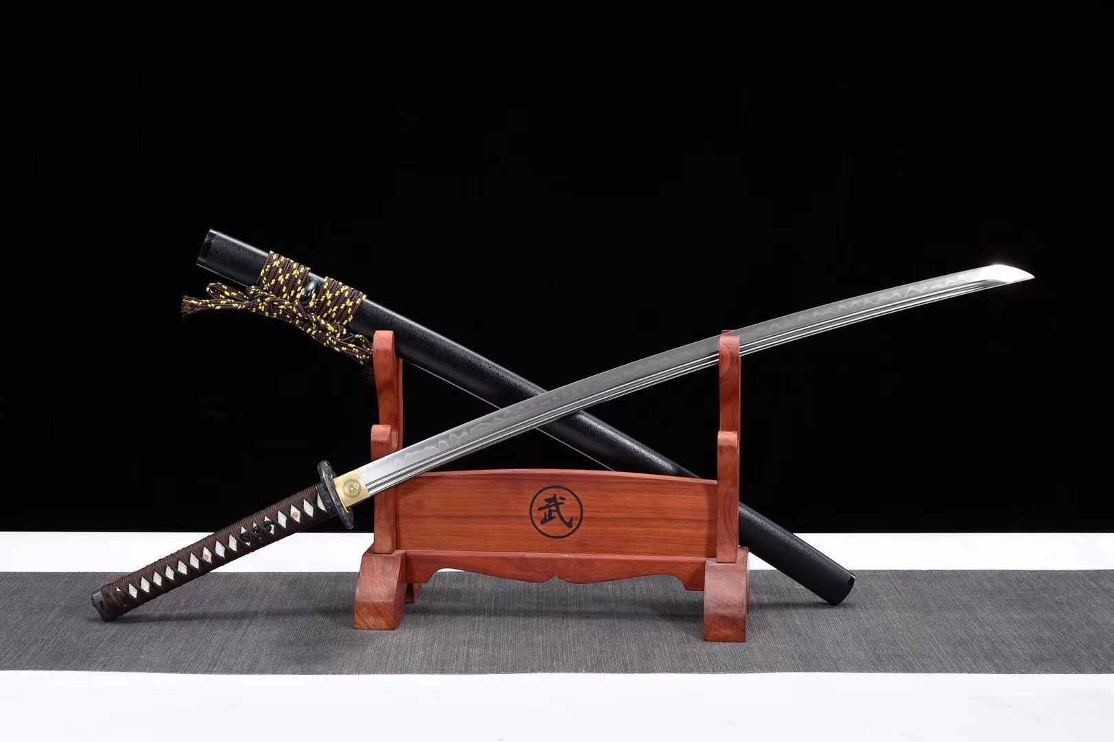 La hoja de acero T10 revela un auténtico gunome midare hamon, conseguido mediante un templado diferencial, que crea ondas irregulares a lo largo del filo como los contornos de una cordillera. El bo-hi esculpe una elegante ranura que aligera la hoja sin restarle resistencia. La tsuba redonda de aleación negra armoniza perfectamente con el fuchi y el kashira tallados en el mismo material, creando un conjunto coherente y refinado. El mango combina la noble textura de la piel de raya blanca con un trenzado marrón en forma de rombo, mientras que los menuki representan dragones negros que parecen elevarse hacia el cielo. El habaki de latón dorado, adornado con un kamon tradicional, contrasta sutilmente con la sobriedad general. La vaina de madera lacada en negro granulado evoca la textura rugosa de la roca volcánica, complementada por un sageo en tonos marrones y amarillos que recuerdan los colores otoñales de los bosques de montaña.