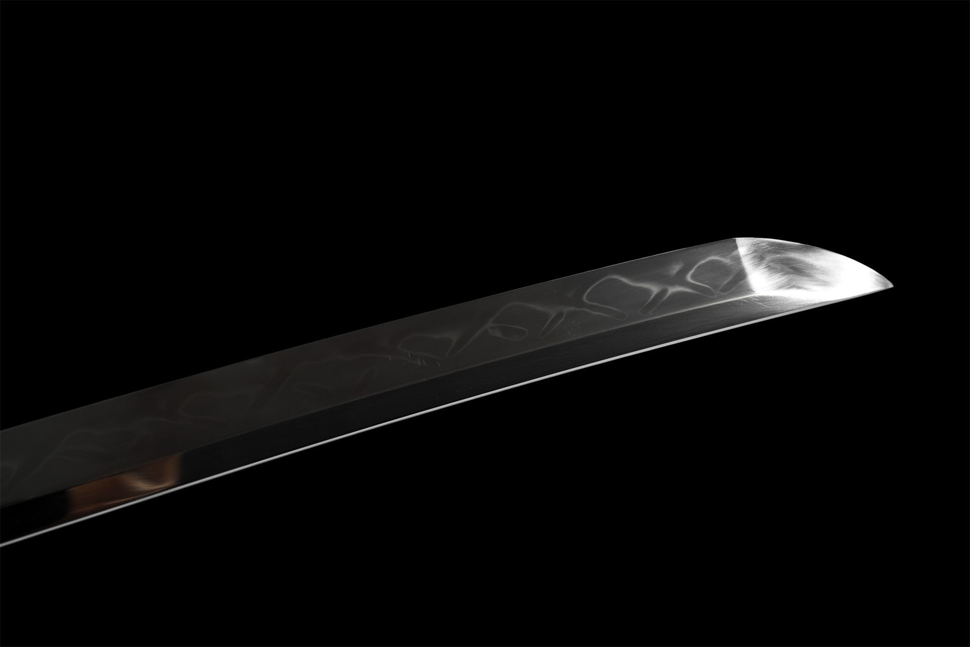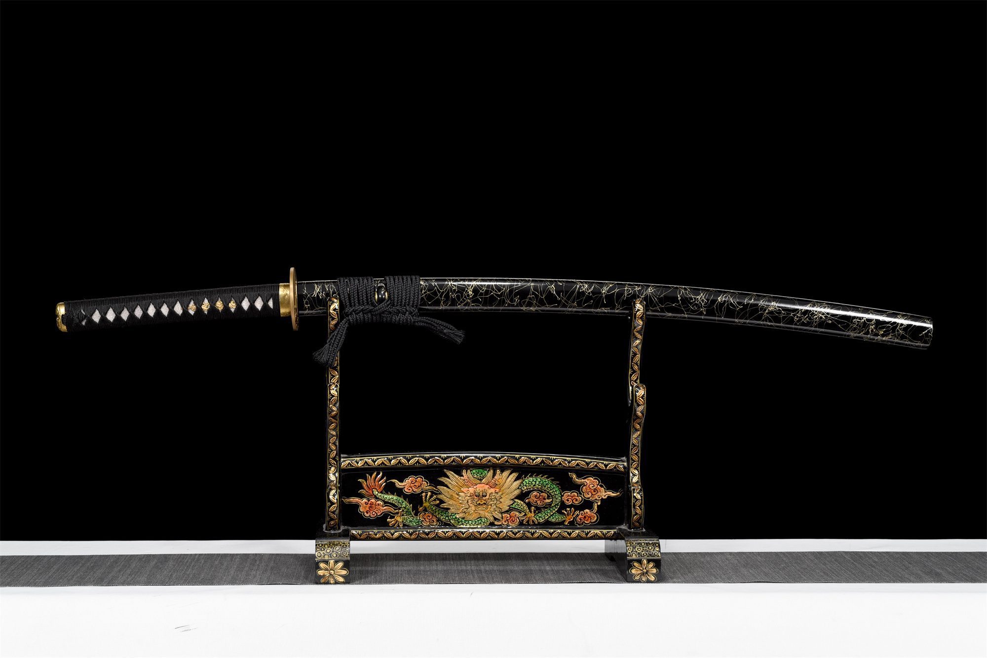 Su hoja de acero T10 tiene una superficie pulida a espejo que revela un auténtico choji hamon con elegantes ondulaciones, resultado de un templado diferencial controlado. Esta línea de templado serpenteante es testimonio de la artesanía ancestral y confiere a cada katana una firma única. La tsuba redondeada en cobre dorado presenta un meticuloso martilleado y grabado, complementado con un kozuka-hitsu que mejora su funcionalidad. La empuñadura combina auténtica piel de raya con un trenzado negro en forma de rombos, mientras que los menuki presentan dragones dorados finamente cincelados. El fuchi y el kashira en cobre dorado armonizan a la perfección, este último adornado con el símbolo tradicional de las olas. La vaina de madera lacada en negro está adornada con sutiles filamentos dorados, creando un llamativo contraste con el koiguchi en cuerno auténtico.