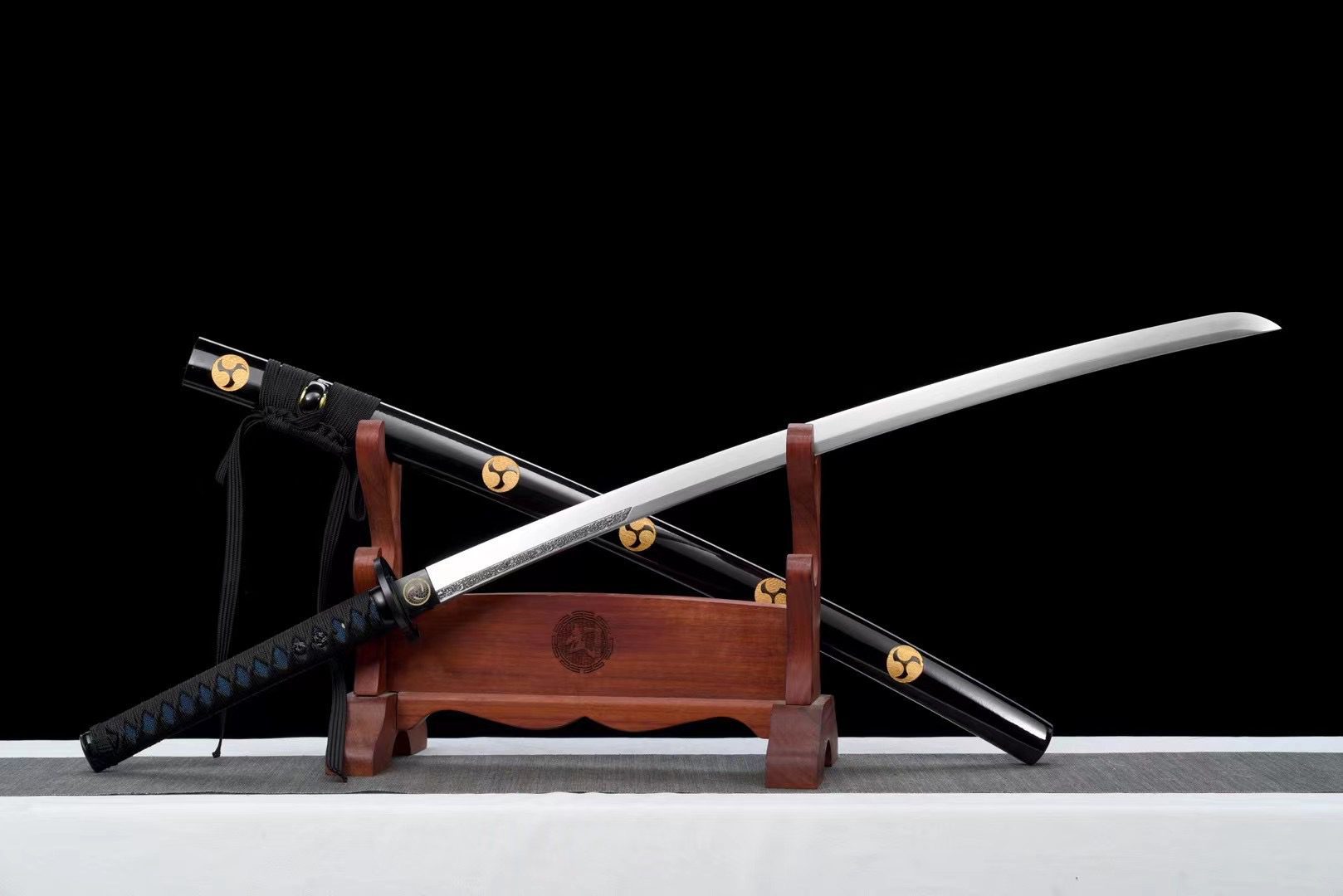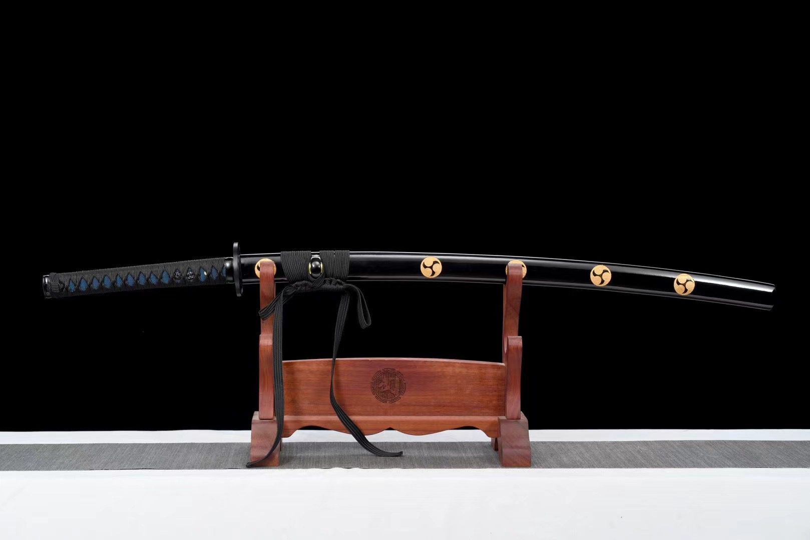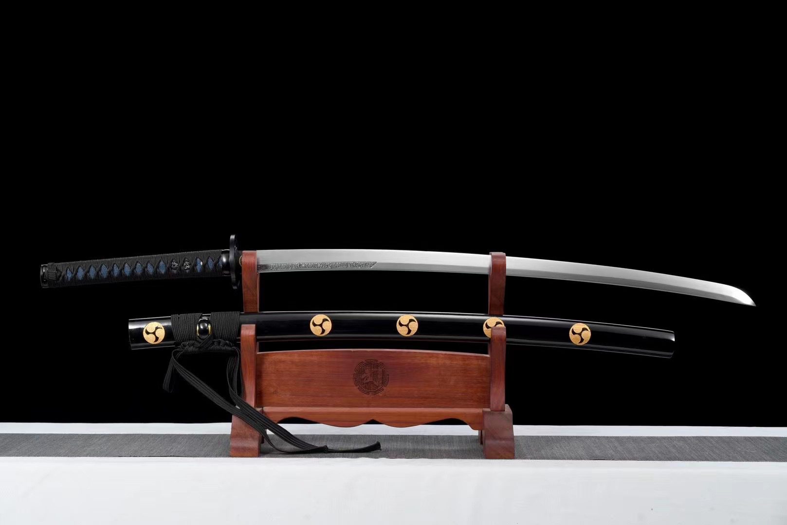 La hoja de acero T10 tiene un acabado natural que revela la belleza cruda del metal forjado, mientras que la guarda redonda de aleación negra (tsuba) evoca la forma de un shuriken. La empuñadura (tsuka) combina armoniosamente piel sintética de raya azul medianoche con trenzado negro (tsuka-ito) en forma de rombos, lo que proporciona un agarre firme y elegante. Los menuki representan un dragón negro, que simboliza el poder y la sabiduría, mientras que el fuchi y el kashira de aleación negra completan el conjunto con su acabado suave y refinado. El habaki negro también lleva un kamon en espiral que evoca el shuriken. La vaina de madera lacada en negro (saya) está decorada con un kamon negro en forma de shuriken, y sus extremos (kojiri y koiguchi) hacen eco de este tono profundo, acompañados de un discreto sageo negro.