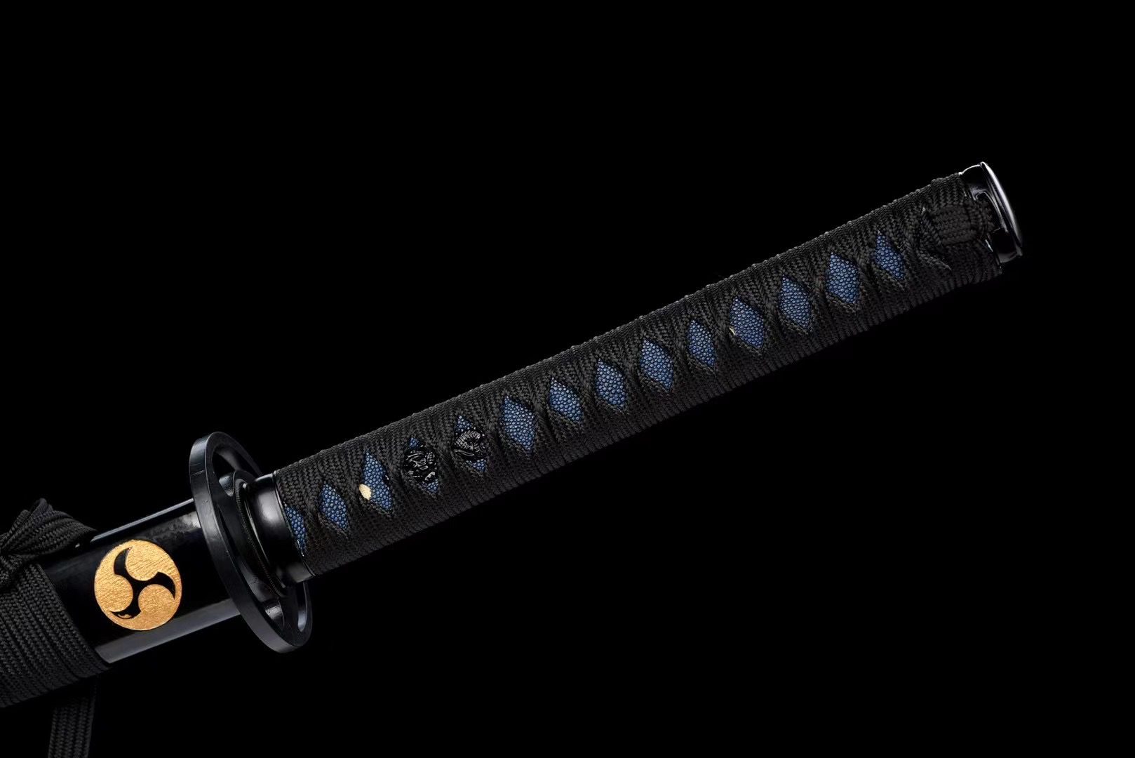 - Empuñadura (Tsuka 柄): de madera recubierta con piel de raya azul medianoche sintética.