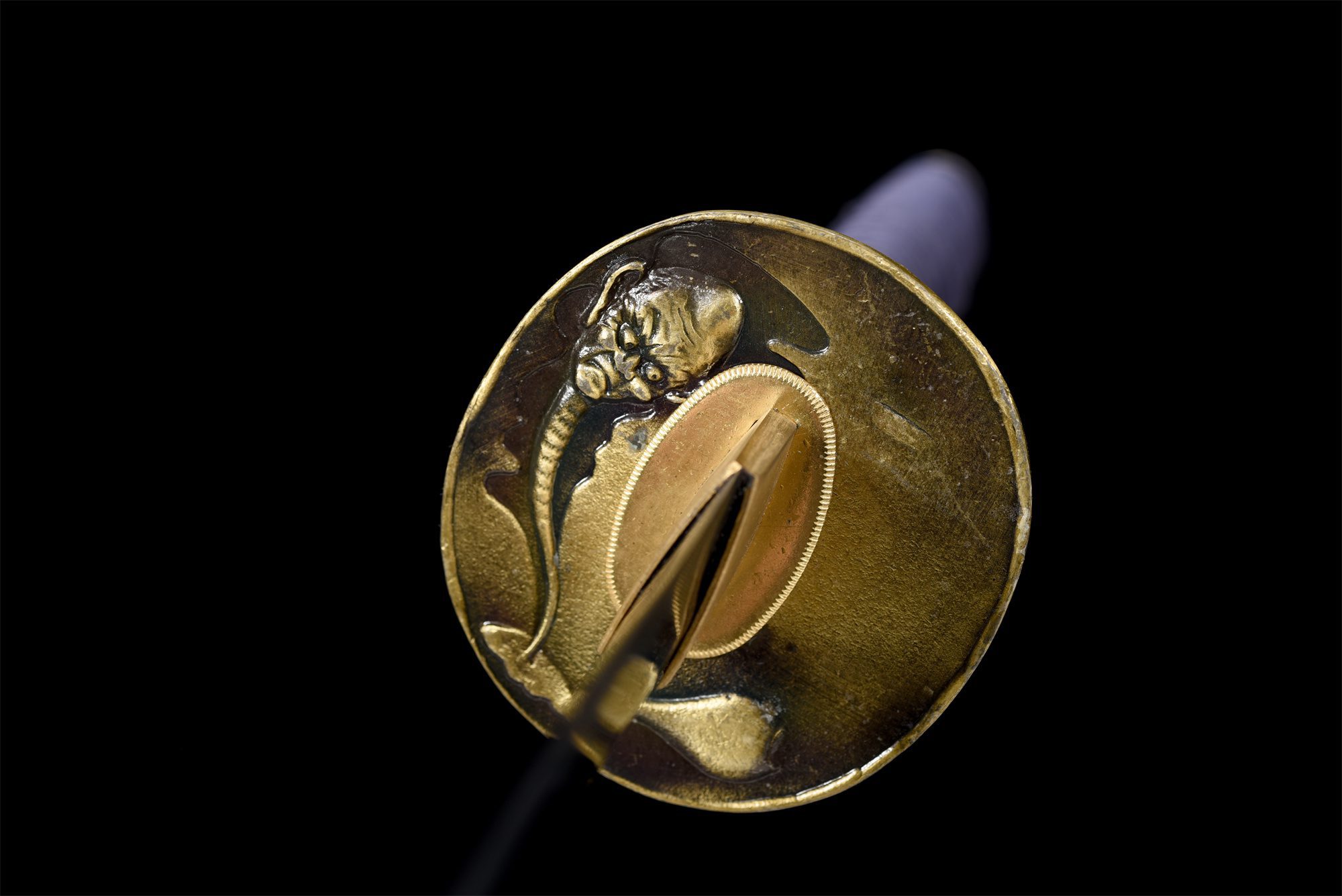 - Fuchi (縁): Dorado con una cabeza de demonio en relieve.