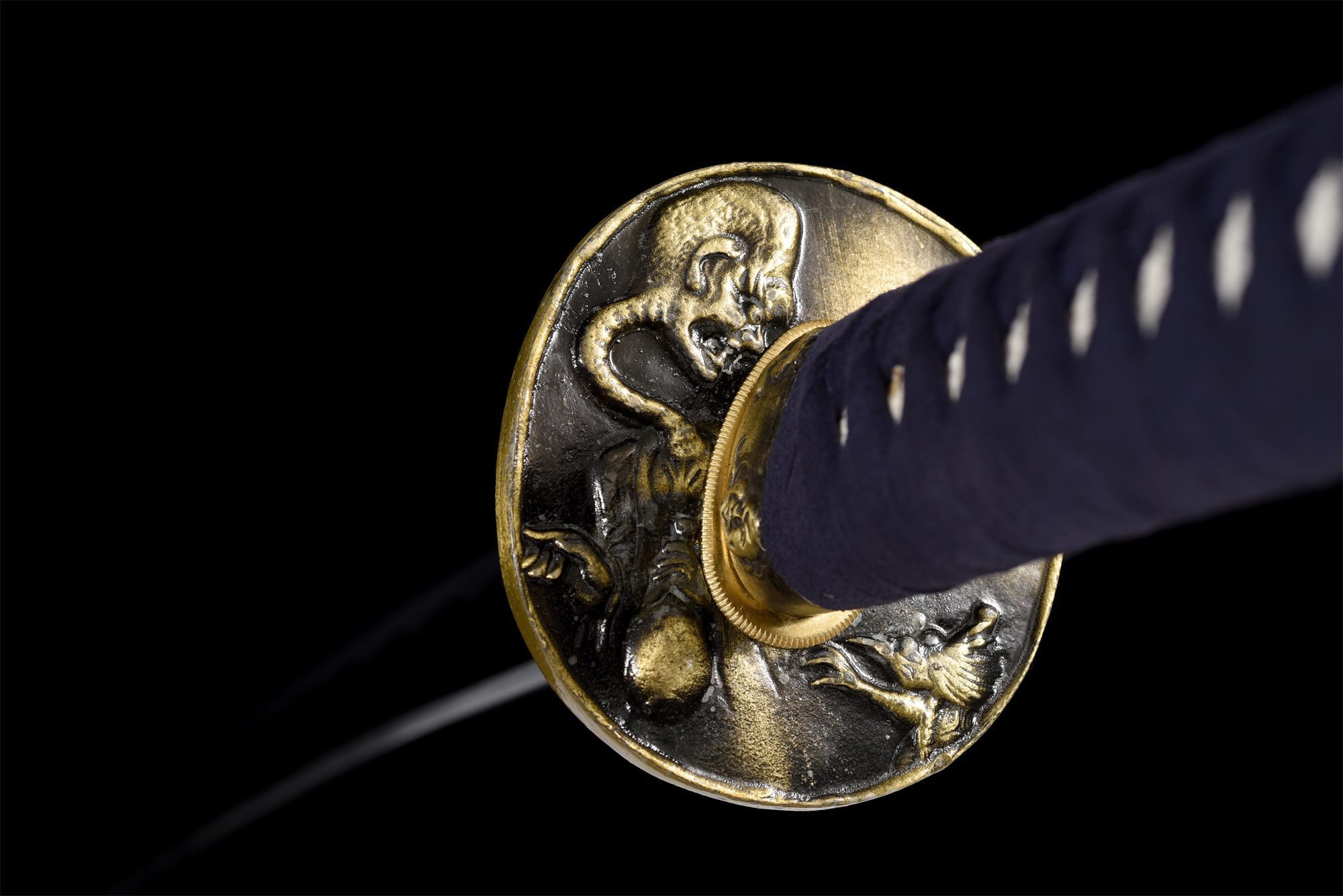 - Guarda (Tsuba 鍔): Redonda y dorada con una cabeza de demonio en relieve.