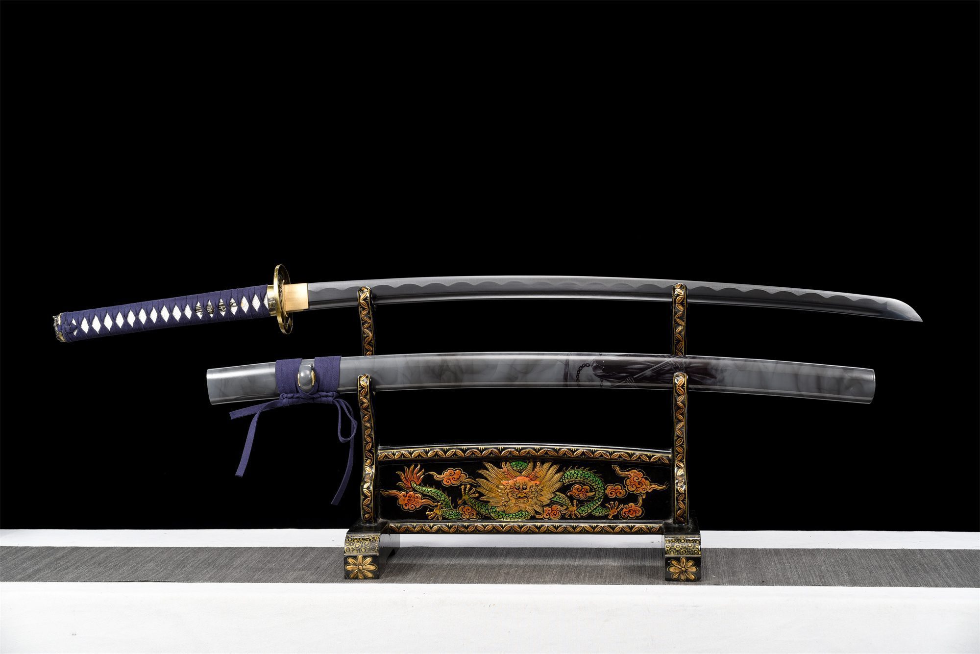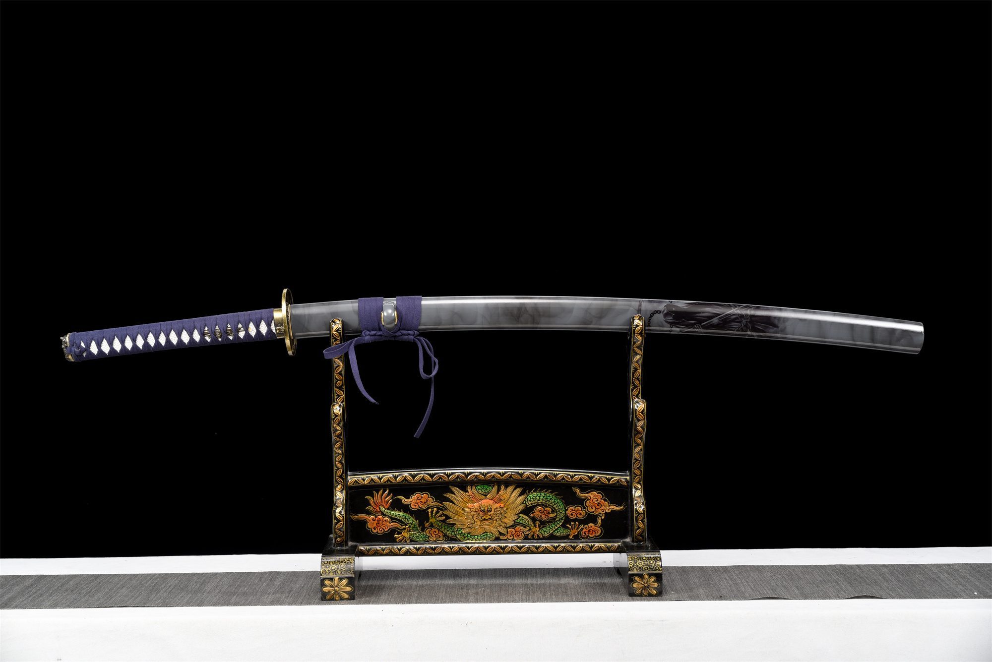 Su hoja de acero 1060 presenta un tono negro intenso que contrasta maravillosamente con el auténtico notare hamon conseguido mediante un templado diferencial. El bo-hi tallado en la hoja produce un característico silbido durante el movimiento, al tiempo que aligera el peso total. La tsuba redonda dorada presenta una llamativa cabeza de demonio en relieve, mientras que el fuchi se hace eco de este motivo demoníaco con notable delicadeza. La empuñadura combina la tradicional piel de raya blanca falsa con un trenzado tsuka-ito azul en forma de rombos, creando un elegante contraste visual. Los menuki dorados completan armoniosamente el conjunto, y el kashira dorado está adornado con motivos de olas y viento que evocan las fuerzas de la naturaleza desatadas. La vaina de madera lacada en gris y negro representa a la Parca, lo que refuerza la estética oscura y misteriosa de este artículo, complementada por un sageo azul que añade un sutil toque de color.