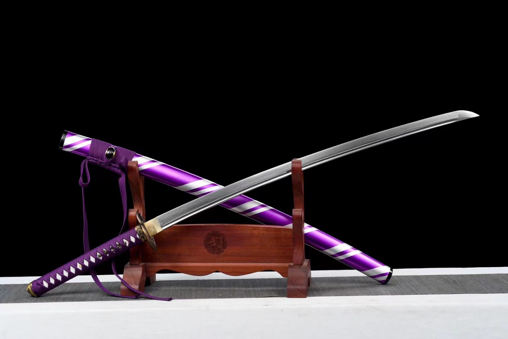 - Vaina (Saya 鞘): madera lacada con líneas alternas blancas y moradas, con Kojiri y Koiguchi negros.