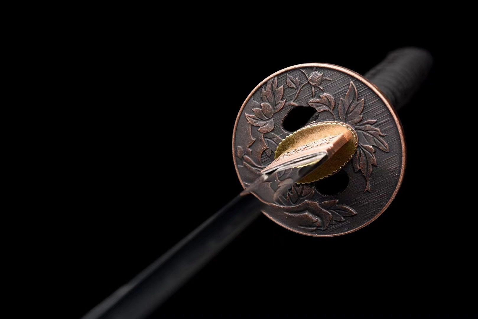 - Guarda (Tsuba 鍔): hermosa guarda redonda de cobre cepillado con flores grabadas.