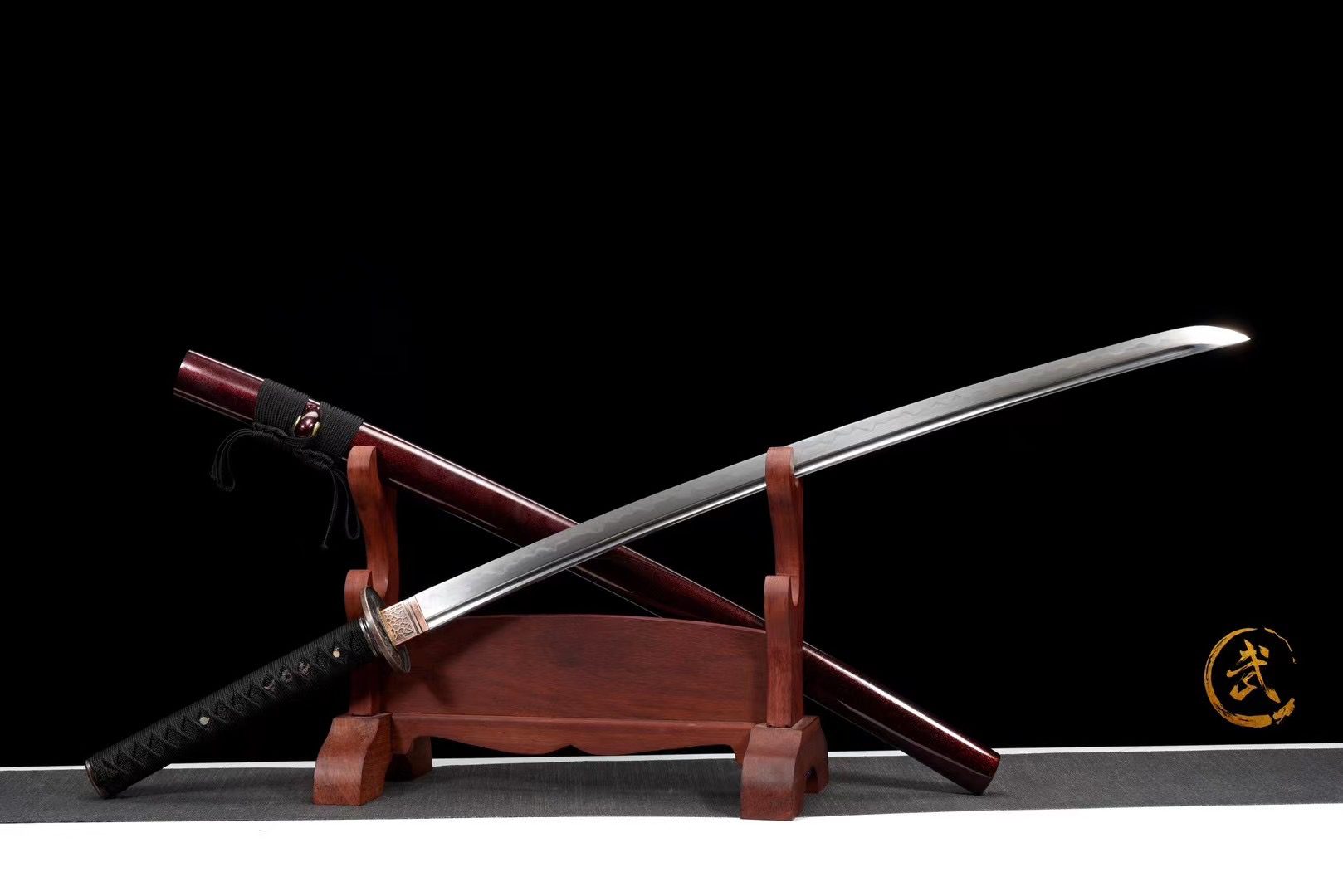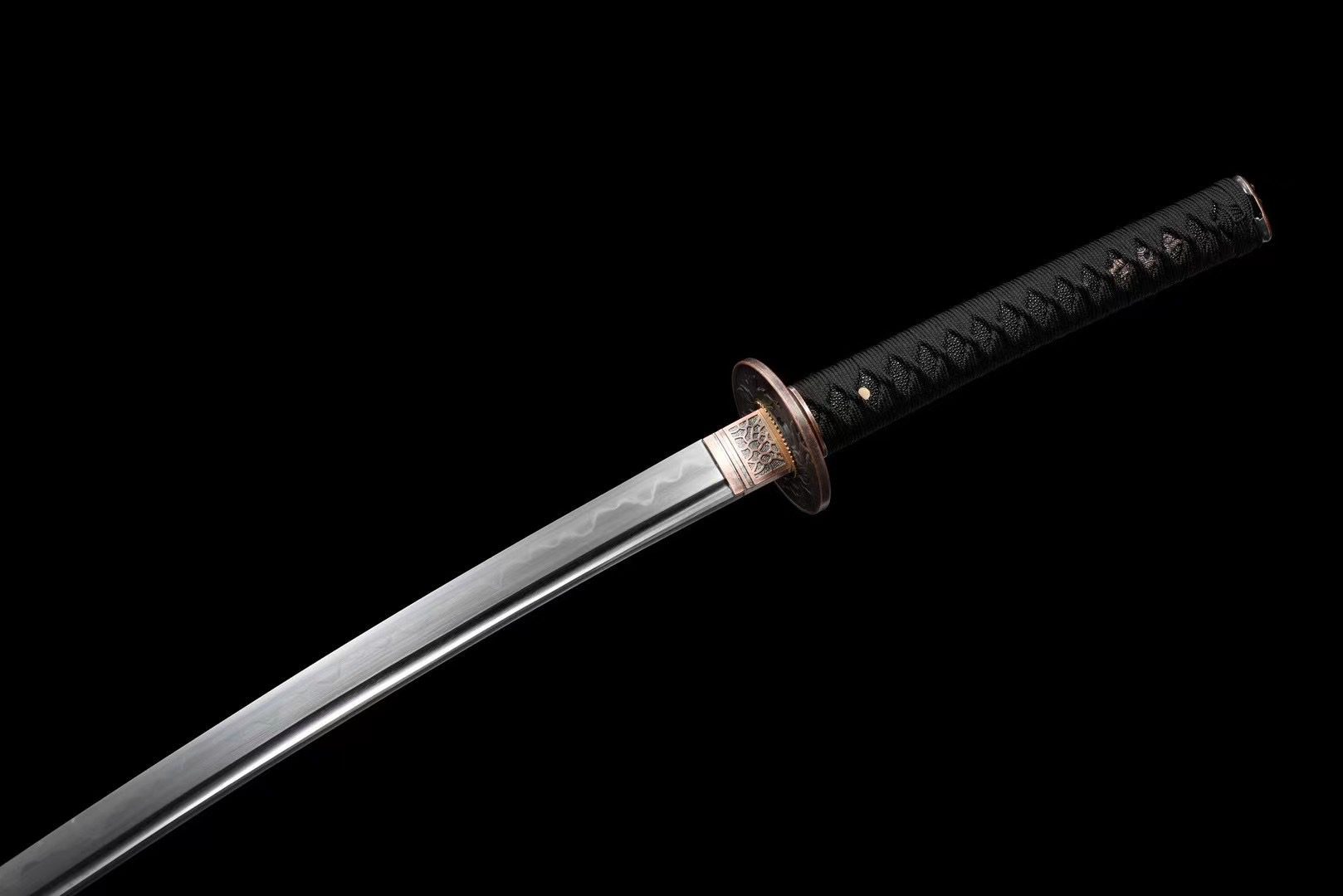 La hoja de acero T10 revela un magnífico hamon gunome midare obtenido mediante un templado diferencial, que crea ondulaciones irregulares que bailan a lo largo del filo como olas cristalinas. El bo-hi tallado en el acero aligera la hoja y produce una resonancia distintiva durante el movimiento. La tsuba redonda de cobre cepillado presenta delicados grabados florales que hacen eco del nombre de la katana, mientras que el habaki de cobre tallado garantiza un ajuste perfecto en la vaina. La empuñadura combina la textura rugosa de la piel sintética de raya negra con el trenzado tsuka-ito negro en forma de rombos, adornado con menuki que representan dragones de cobre. El kashira de cobre grabado con flores completa armoniosamente el conjunto. La vaina de madera lacada en color púrpura captura la esencia misma del nombre de esta katana, creando un llamativo contraste con el sageo negro.