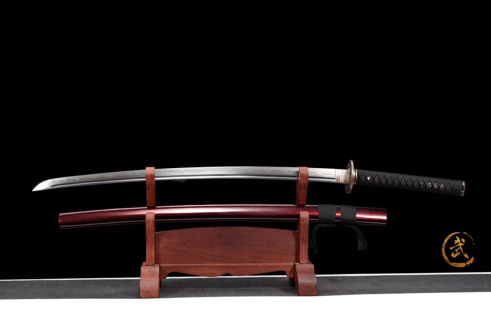 - Empuñadura (Tsuka 柄): piel de raya negra sintética sobre madera.