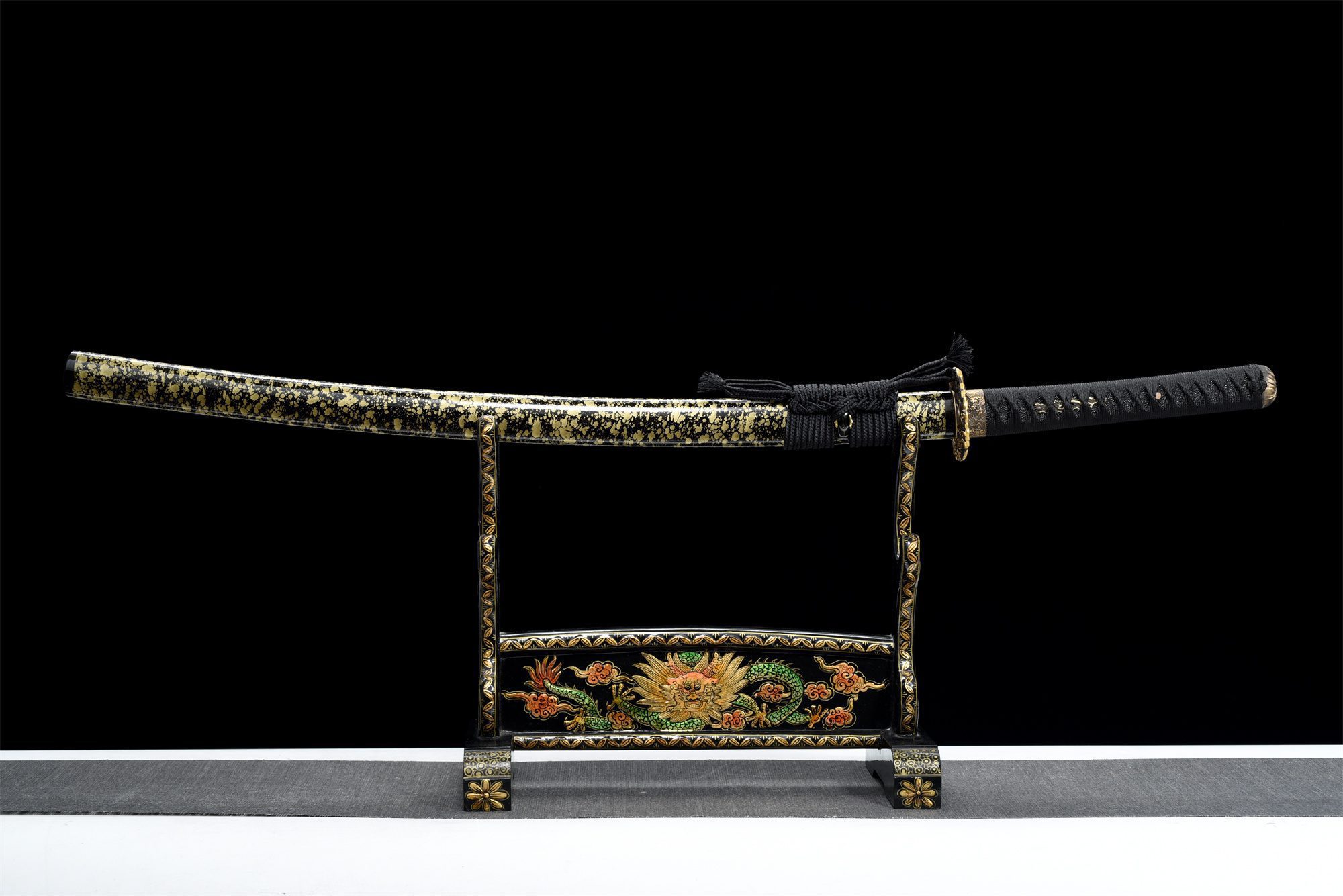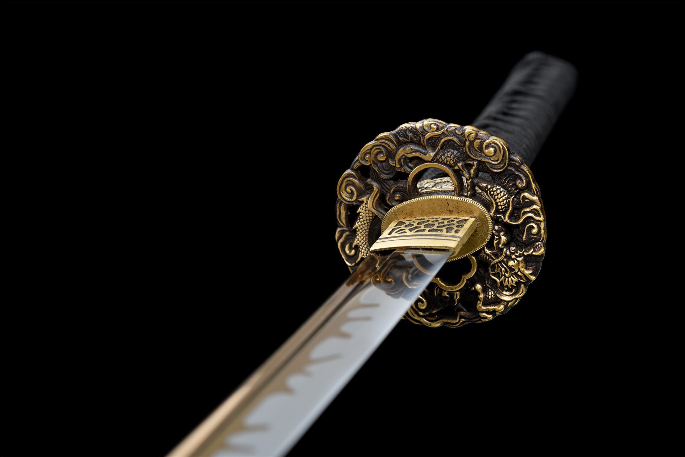 Su hoja de acero al manganeso presenta un llamativo acabado dorado que contrasta maravillosamente con el Hamon visible a lo largo del filo. Este tono dorado confiere al arma un aspecto suntuoso, al tiempo que conserva sus propiedades funcionales. La tsuba redondeada en oro y cobre negro presenta motivos que evocan el viento y las olas, simbolizando la fluidez del movimiento y la fuerza natural. La empuñadura de madera maciza recubierta de imitación de piel de raya negra proporciona un agarre estable, mientras que el tsuka-ito negro trenzado en forma de rombos mejora el agarre. Los menuki representan un dragón dorado, una criatura mítica asociada a la sabiduría y el poder, y el kashira tallado en forma de cabeza de dragón completa armoniosamente el conjunto. La vaina de madera maciza negra y dorada combina perfectamente con la estética general, creando un llamativo contraste que resalta cada detalle.