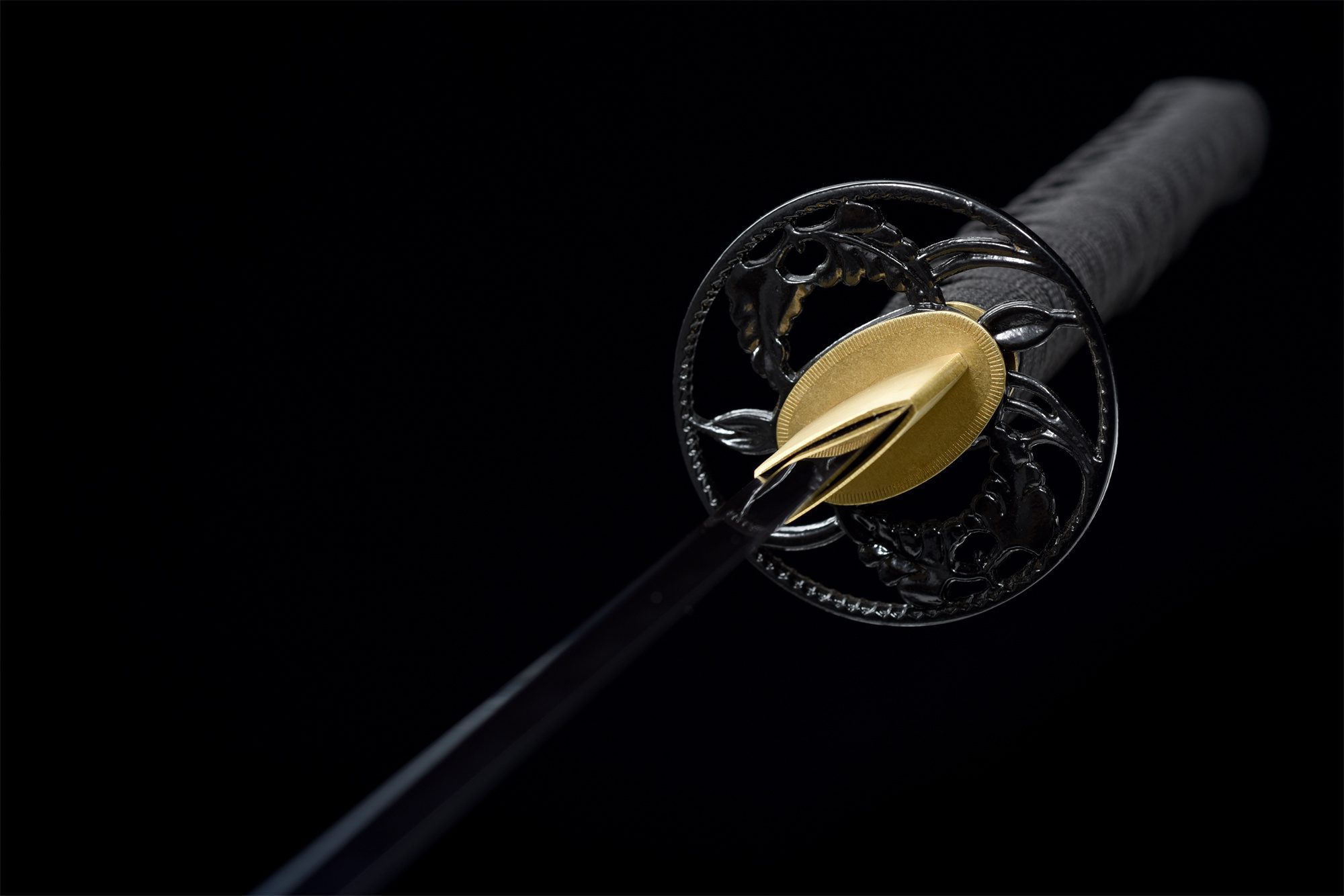 - Guarda (Tsuba 鍔): Forma redondeada y hueca en aleación negra, decorada con motivos de hojas.