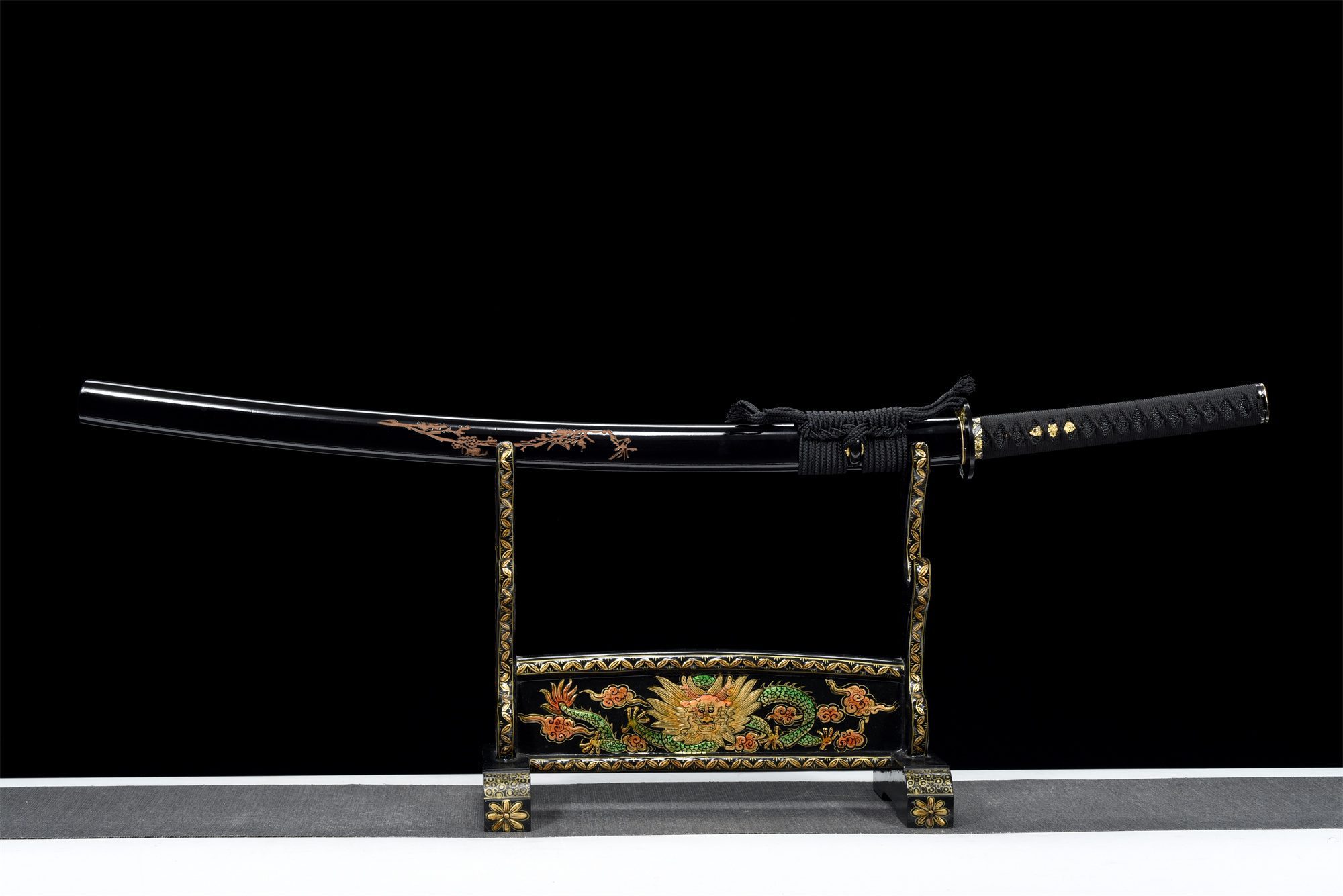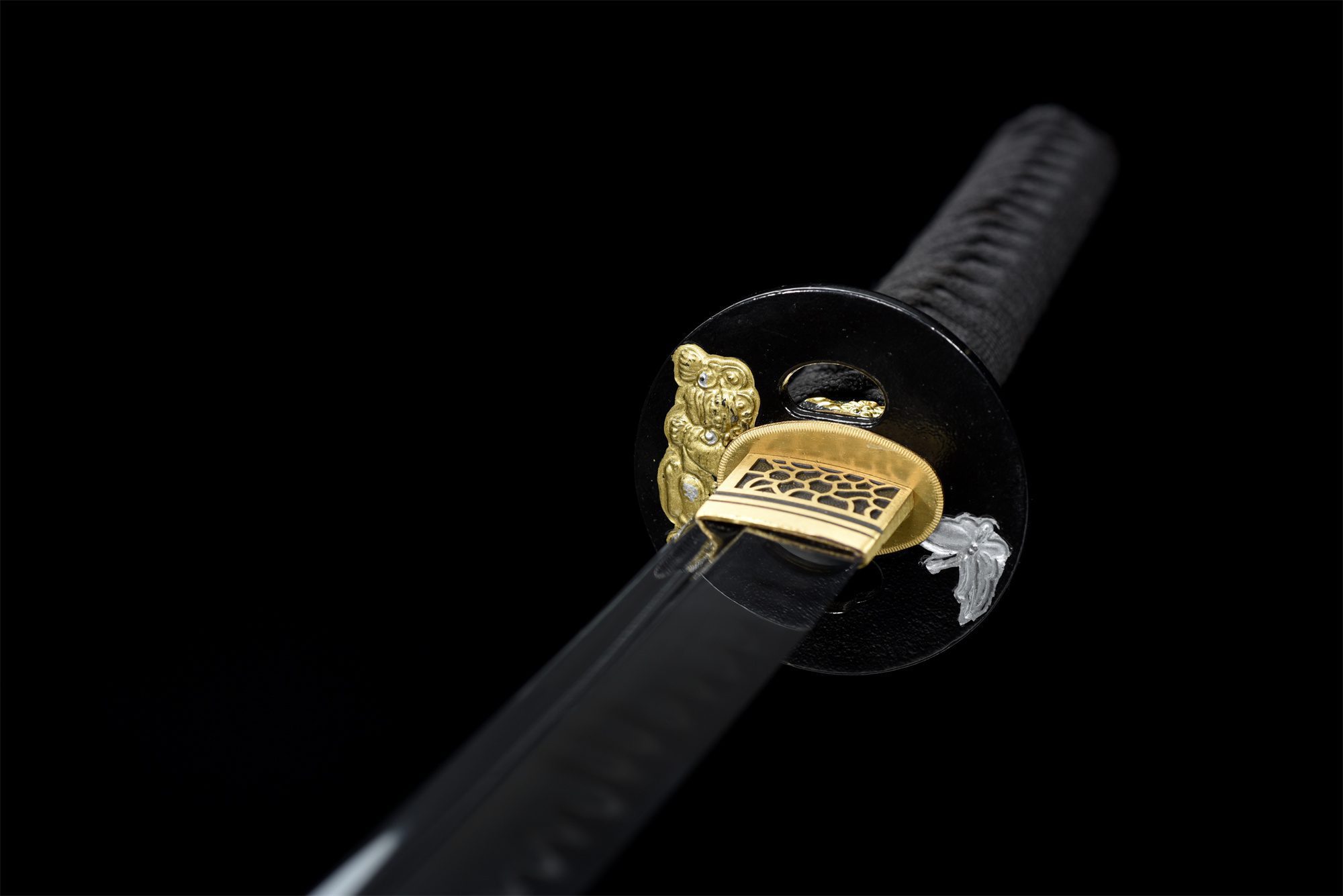 La hoja de acero T10 presenta un tono negro intenso que captura y absorbe la luz, creando un llamativo contraste con el hamon visible que ondula como una serpiente ardiente. La tsuba redondeada de aleación negra está adornada con una delicada flor dorada grabada, que simboliza la belleza que emerge de la oscuridad, mientras que el kozuka-hitsu refleja la funcionalidad tradicional. La empuñadura de madera maciza, recubierta de piel sintética de raya negra, ofrece un agarre firme y cómodo, realzado por el trenzado negro con patrón de diamantes del tsuka-ito. Los menuki representan un dragón dorado que se enrosca bajo los lazos, evocando una fuerza espiritual oculta. La saya de madera maciza lacada en negro completa armoniosamente el conjunto, creando una unidad estética perfecta con el sageo negro. Los motivos florales dorados del fuchi y el kashira nos recuerdan que, incluso en las profundidades más oscuras, la belleza siempre encuentra la manera de florecer. El Shin’en representa la dualidad fundamental de la existencia entre la oscuridad y la luz.