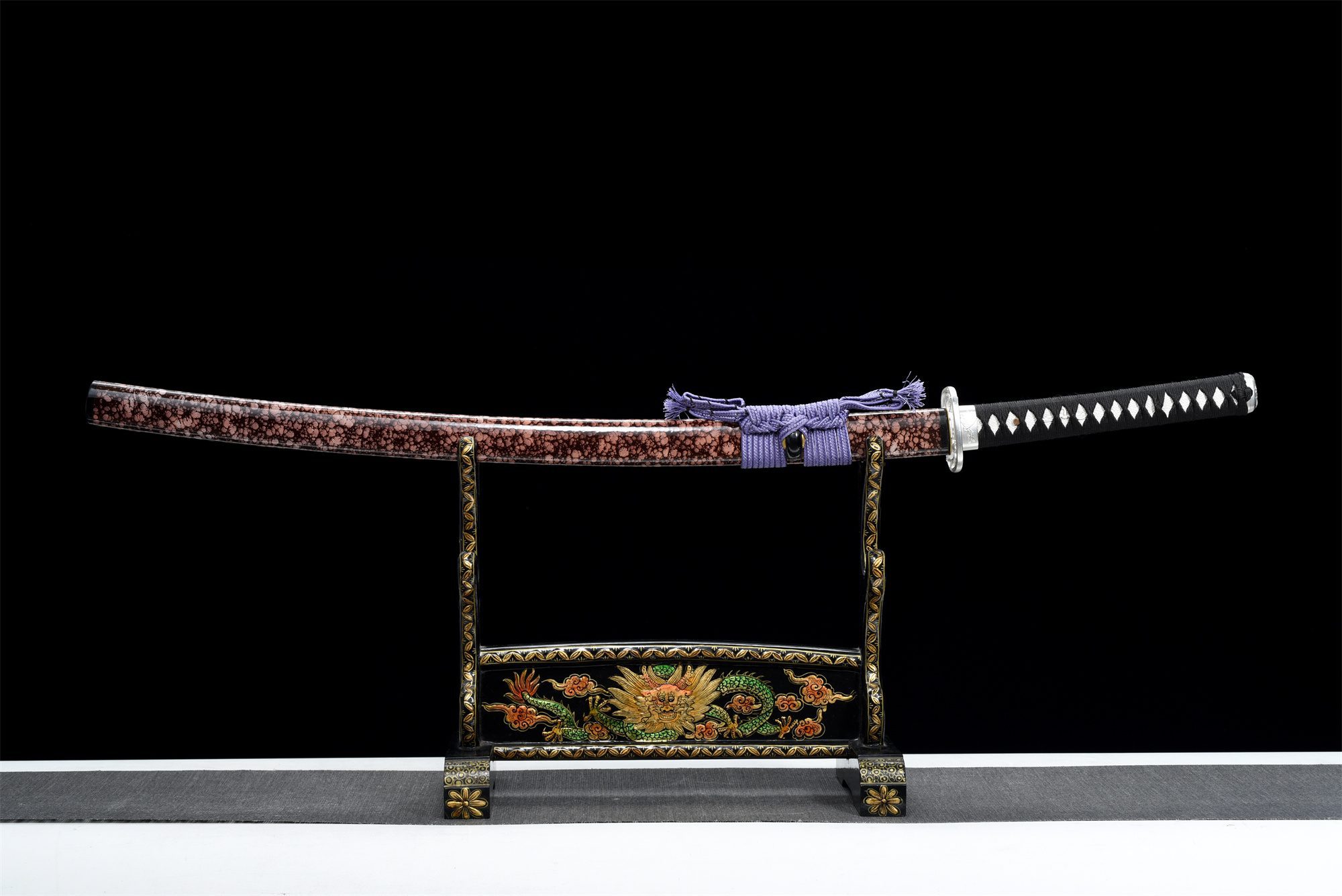 La hoja de acero al manganeso presenta un hipnótico tono azul que recuerda los reflejos cambiantes del fondo del océano, mientras que el sutil hamon evoca los movimientos fluidos de las corrientes submarinas. La tsuba cuadrada con bordes redondeados, finamente chapada en plata, revela delicados motivos de libélulas grabados, creando un poético contraste entre el elemento acuático y el insecto aéreo. El mango de madera maciza, recubierto de piel sintética de raya blanca, ofrece un agarre firme y cómodo, mientras que el trenzado negro con patrón de diamantes del tsuka-ito añade un refinado toque geométrico. Los menuki con un dragón blanco simbolizan el poder espiritual que yace dormido en las profundidades. La saya de madera maciza negra y rosa evoca el amanecer que se abre paso a través de la superficie de las aguas oscuras, complementada por un sageo púrpura que recuerda los tonos crepusculares del abismo.