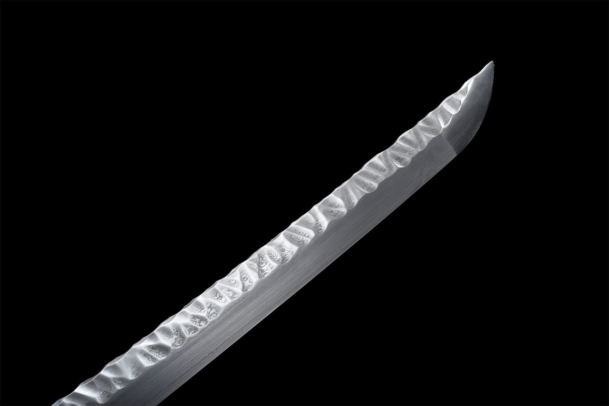 La hoja de acero de Damasco revela patrones ondulados que recuerdan a los relámpagos que atraviesan el cielo nocturno, mientras que su acabado de acero natural le confiere una elegancia sobria y formidable. La tsuba de aleación de cobre tiene forma de cruz con contornos dorados, y su interior negro martillado muestra con orgullo el símbolo mitsu tomoe, que representa el equilibrio de las fuerzas cósmicas. La empuñadura combina armoniosamente auténtica piel de raya blanca (samegawa) y madera dura, envuelta en un trenzado Tsuka-ITO negro con motivos de rombos que proporcionan un agarre firme y estético. Los menuki representan tres mitsu tomoe negros y dorados, un eco espiritual del motivo de la guarda. La vaina lacada en rojo sangre contrasta maravillosamente con los anillos negros del Kojiri y el Koiguchi, mientras que los motivos kamon en forma de loto evocan la pureza que emerge de las aguas turbulentas.