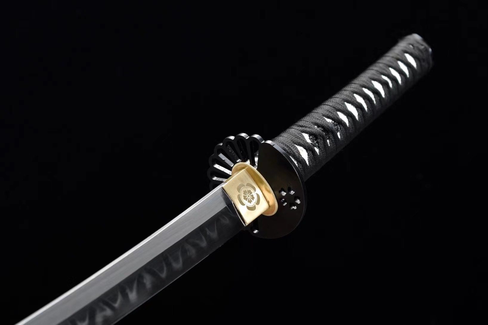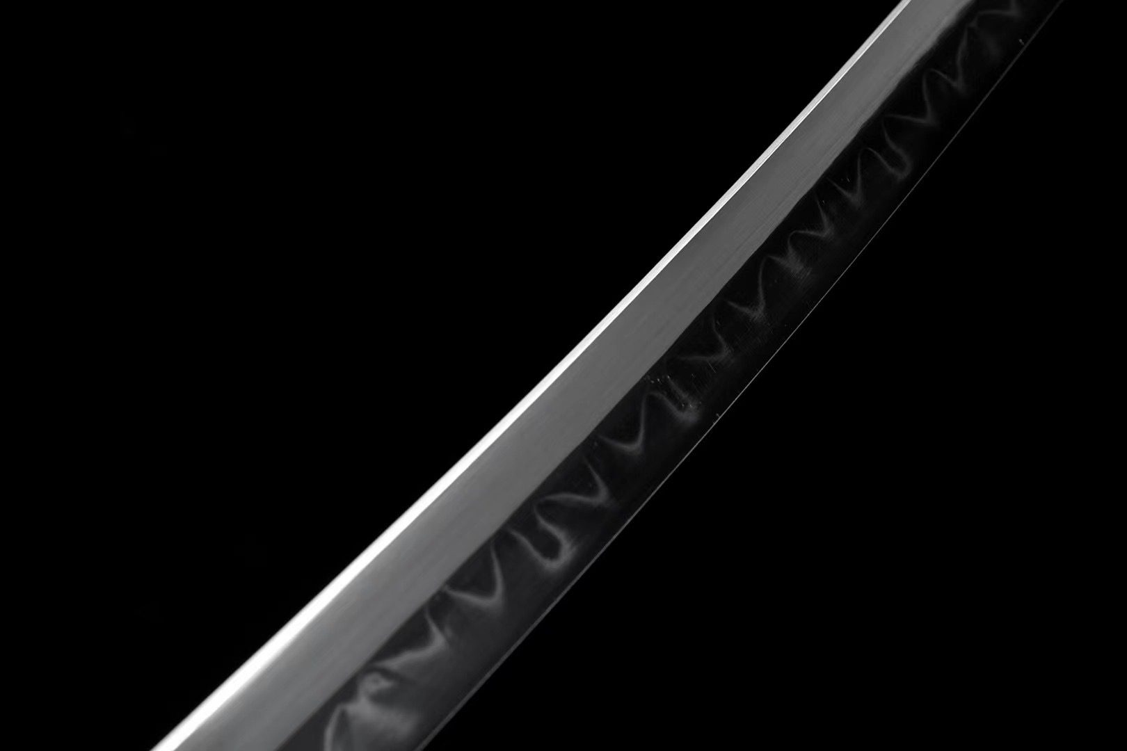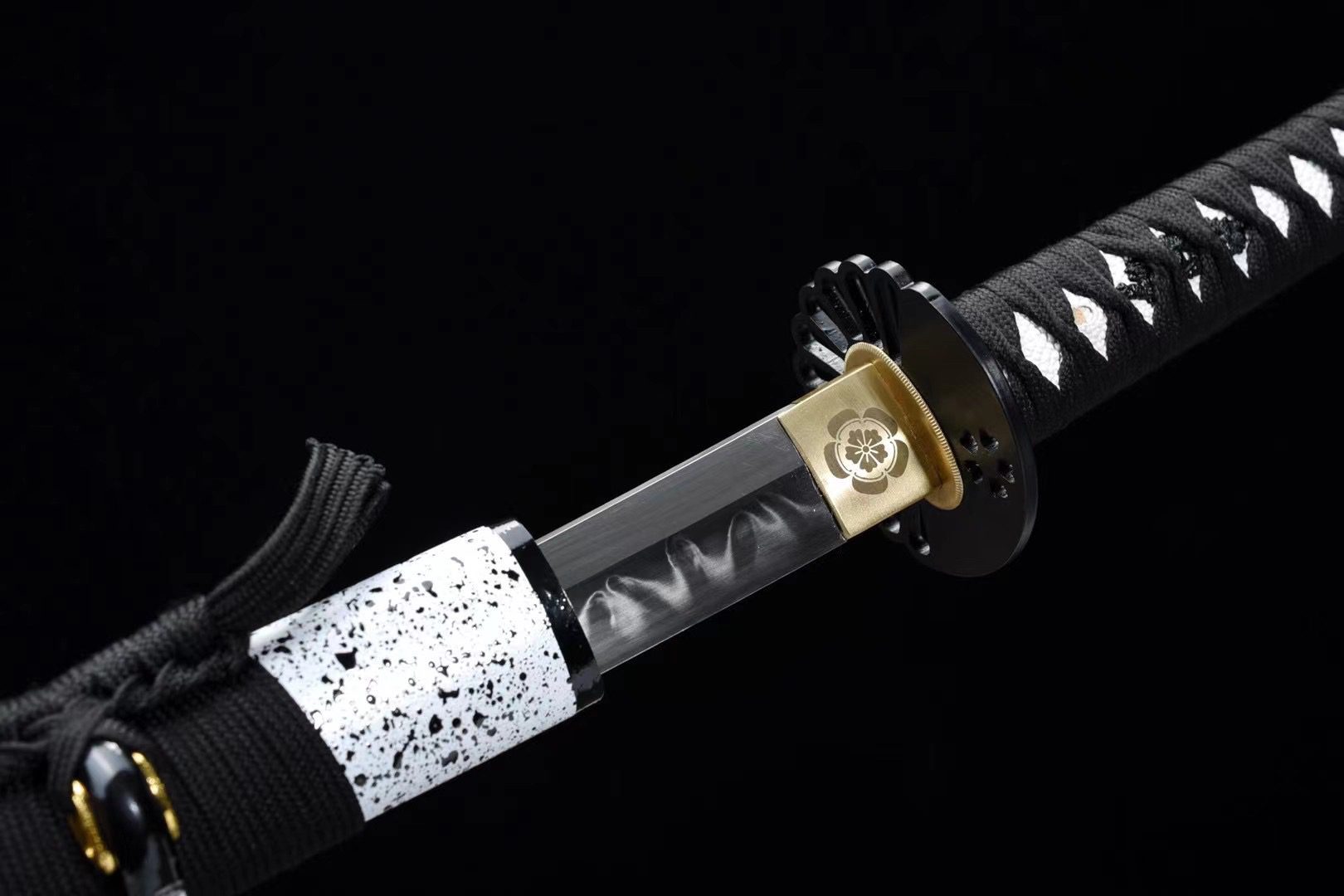 Su hoja de acero T10 tiene un acabado natural que resalta el auténtico chōji hamon obtenido mediante un templado diferencial, creando patrones ondulantes que recuerdan a los pétalos de una flor. La tsuba de aleación negra, redonda y 80 % sólida, se distingue por sus seis pétalos delicadamente tallados en el lado mune y una flor cincelada en el centro. La empuñadura combina auténtica piel de raya blanca (samegawa) con trenzado Tsuka-ITO negro en forma de rombos, mientras que los menuki representan un dragón negro que simboliza la protección. La vaina (saya) de madera lacada en blanco salpicada de puntos negros crea un llamativo contraste con los extremos negros del Kojiri y el Koiguchi, complementados con un sageo negro.