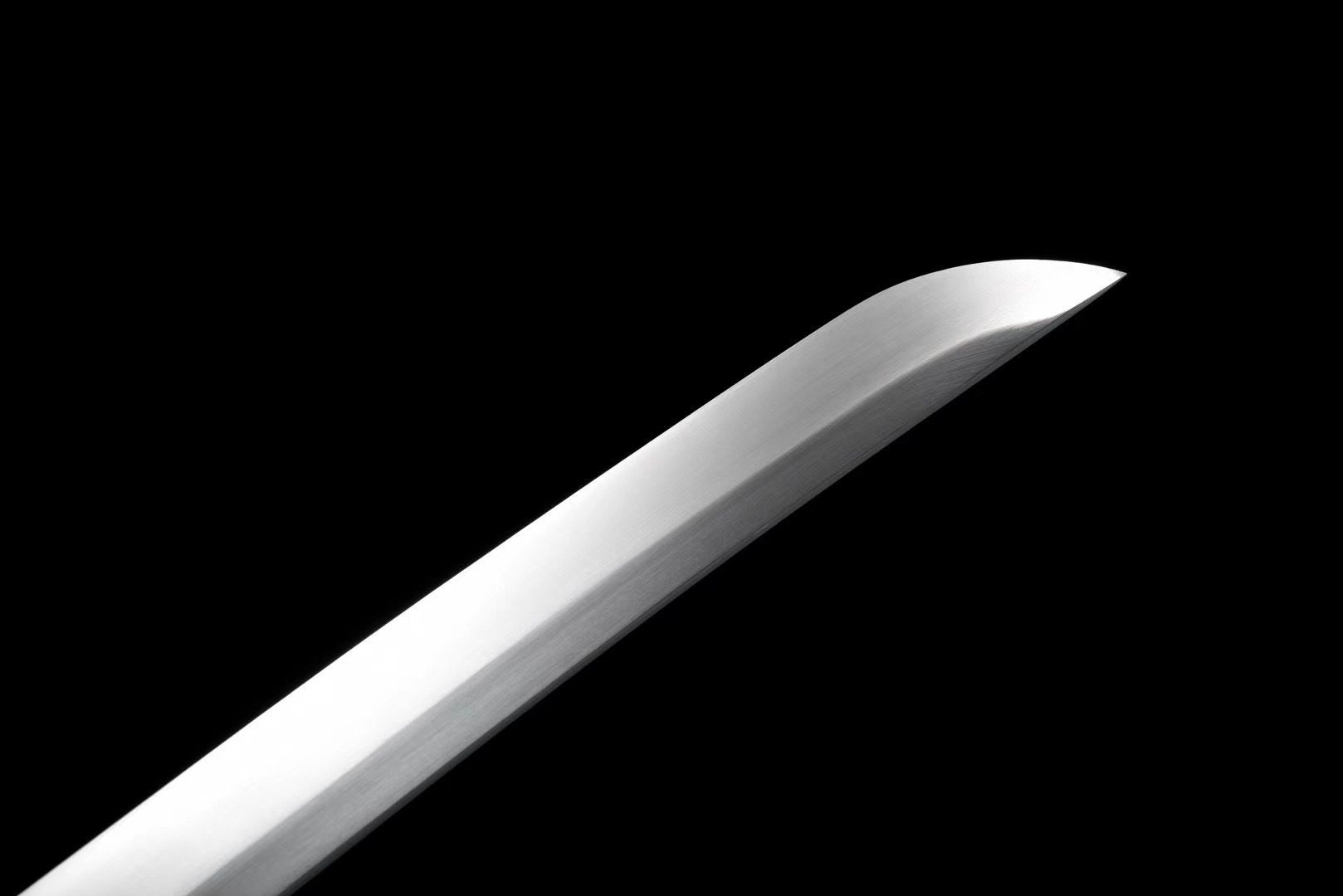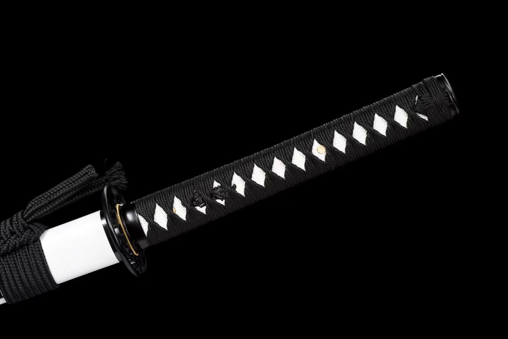 La hoja de acero T10 presenta un acabado natural que revela la belleza cruda del metal forjado, contrastando armonosamente con el habaki de cobre finamente grabado que garantiza un ajuste perfecto en la vaina. La tsuba redonda de aleación negra presenta motivos florales delicadamente tallados que filtran la luz con elegancia. La empuñadura combina la textura auténtica de la piel de raya blanca sintética con un trenzado negro con patrón de diamantes, creando un llamativo equilibrio visual realzado por menuki tallados que representan dragones negros. La vaina de madera lacada en blanco inmaculado está adornada con detalles negros en el kojiri y el koiguchi, recordando la armonía de los opuestos que encarna el propio nombre de esta hoja.