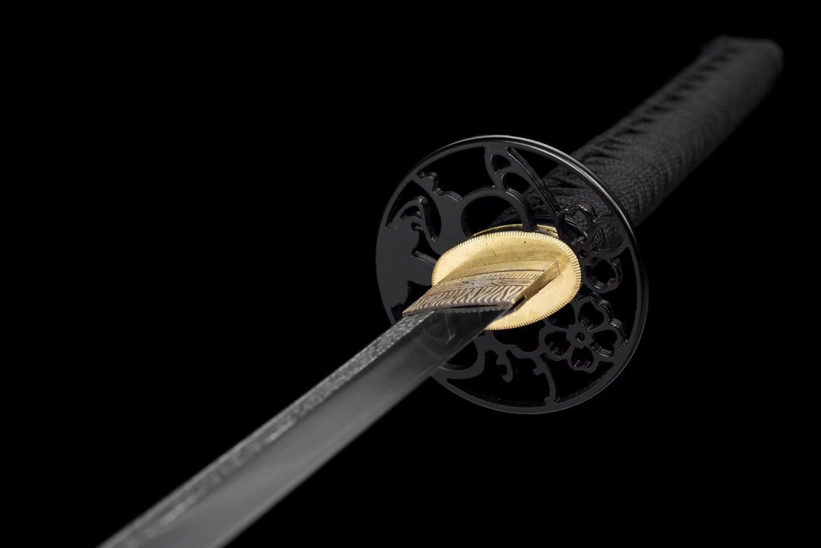 - Guarda (Tsuba 鍔): de aleación negra, decorada con motivos florales tallados.