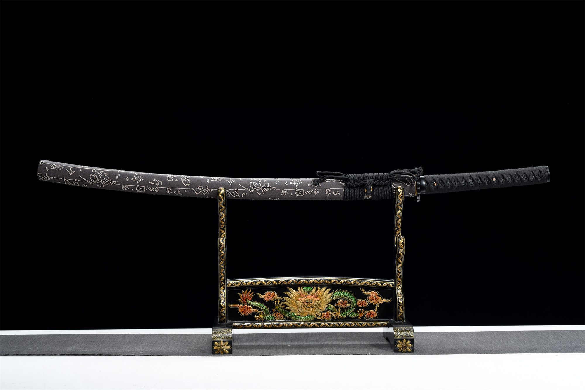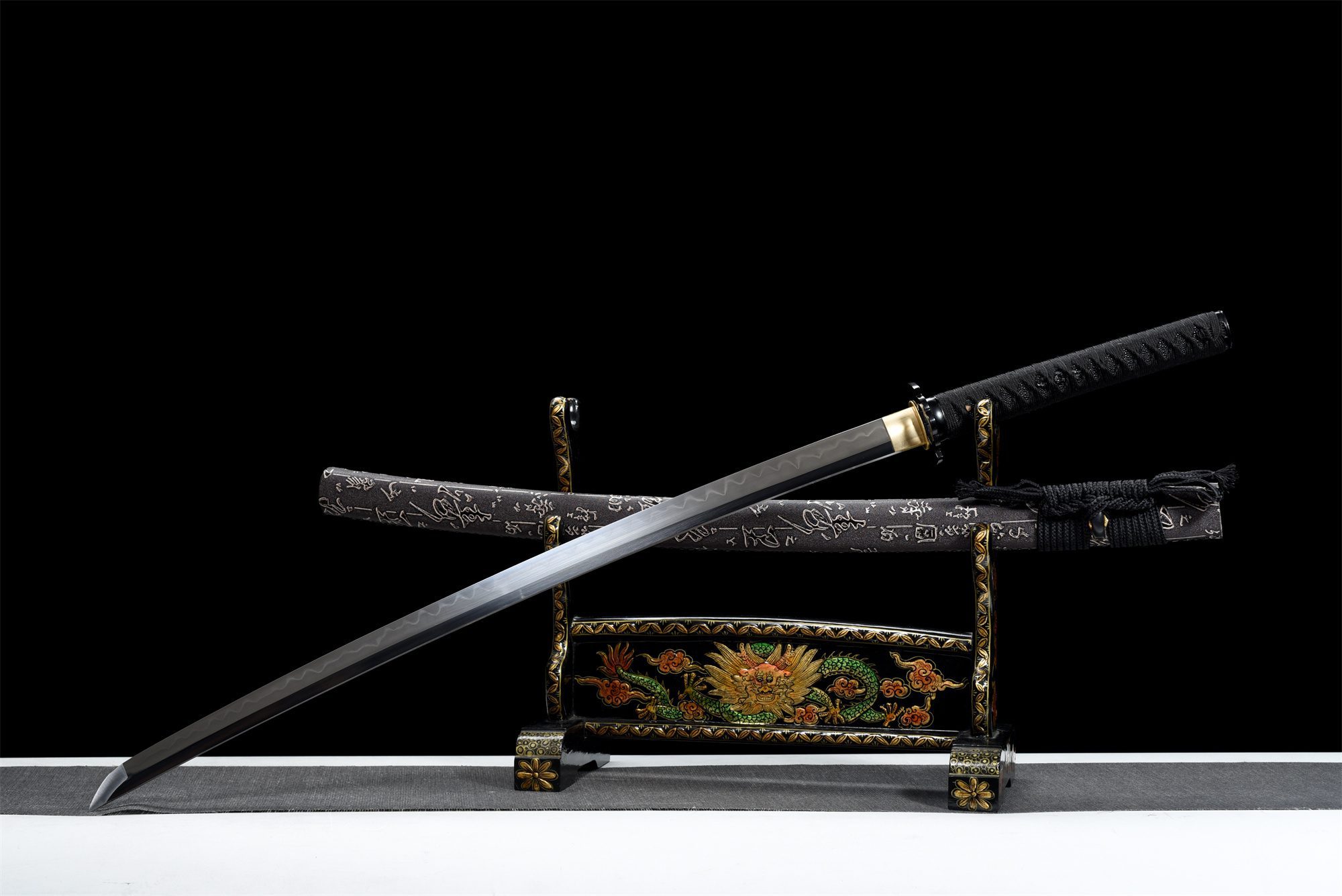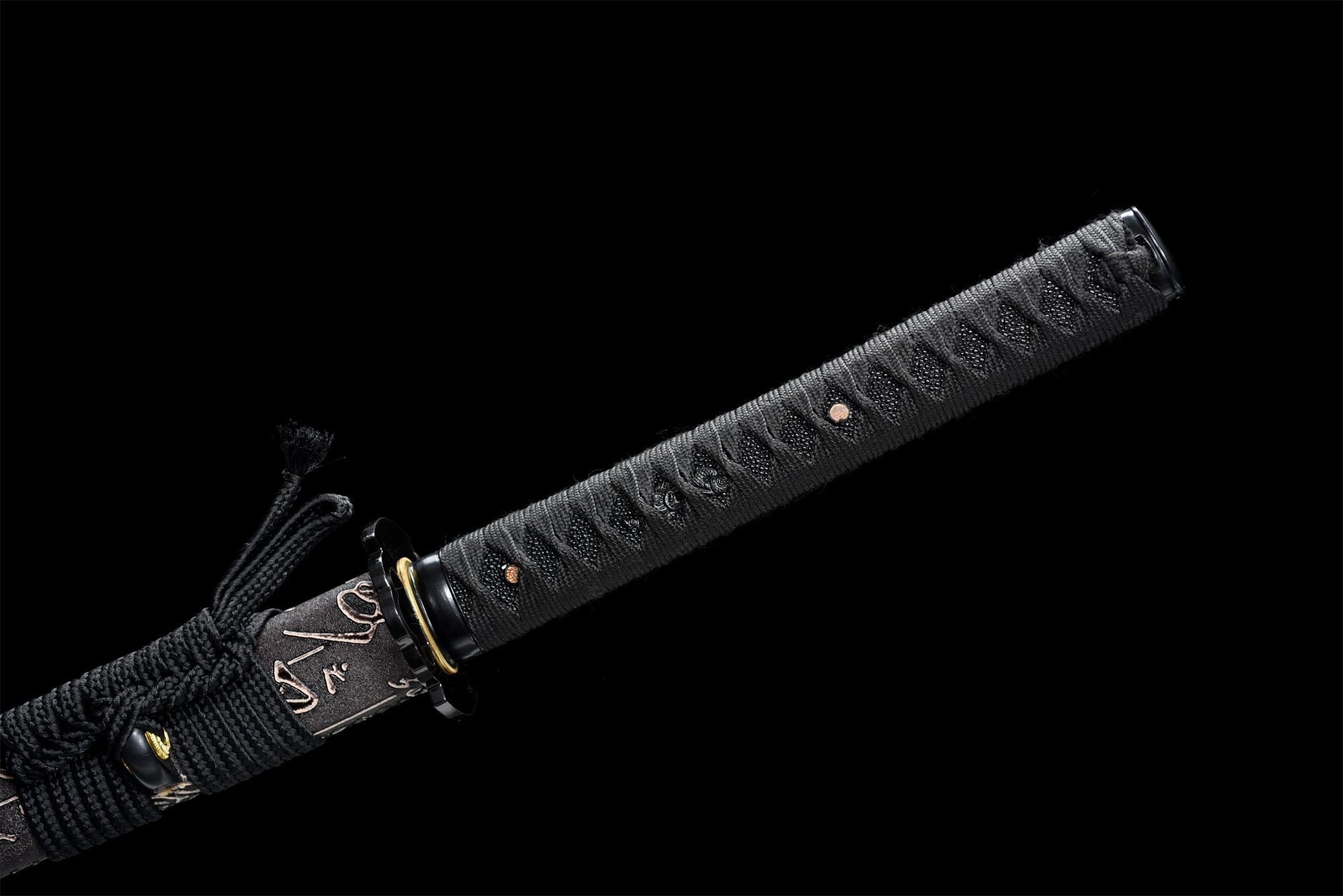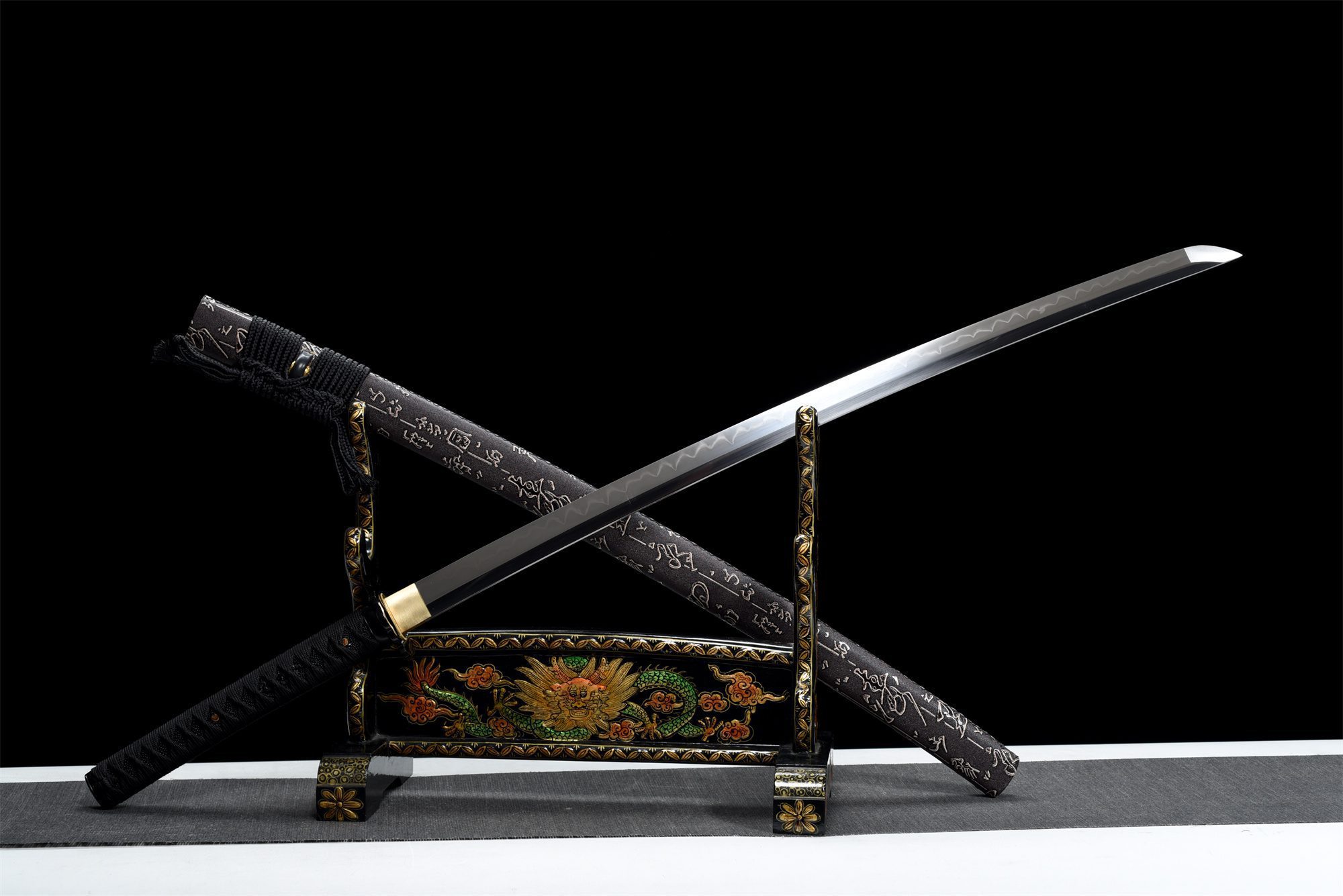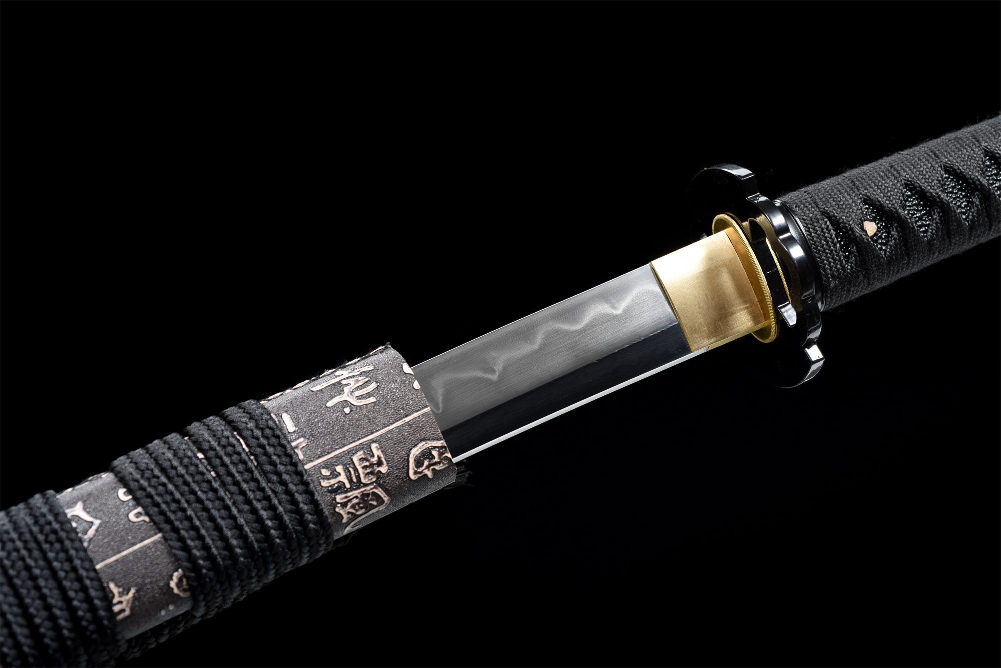 Su hoja de acero T10 presenta una superficie pulida que refleja la luz con elegancia natural, mientras que el hamon visible da fe del proceso tradicional de templado diferencial. La tsuba redondeada de aleación negra armoniza perfectamente con todo el montaje, creando una continuidad visual muy apreciada. La empuñadura (tsuka) combina la resistencia de la madera maciza con la textura auténtica de la piel de raya negra sintética, realzada por el trenzado tsuka-ito negro en forma de rombos que garantiza un agarre firme y estético. Los menuki de dragón negro añaden una poderosa dimensión simbólica, mientras que el fuchi y el kashira de aleación negra completan la armonía cromática. La vaina (saya) de madera maciza cubierta de cuero negro se distingue por sus delicados símbolos blancos, que crean un llamativo contraste con el sageo negro.