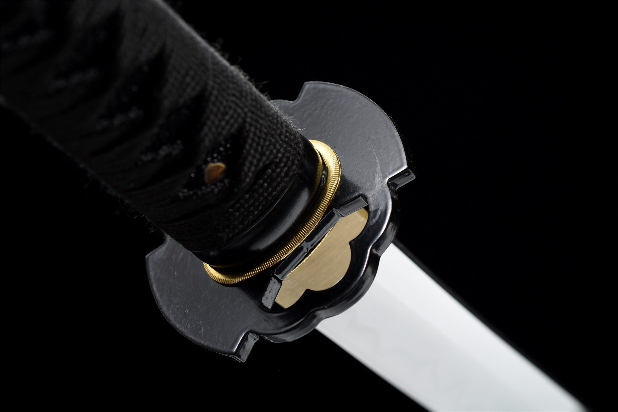- Tsuka-ITO (柄糸): Trenza negra con patrón de diamantes sobre el mango.