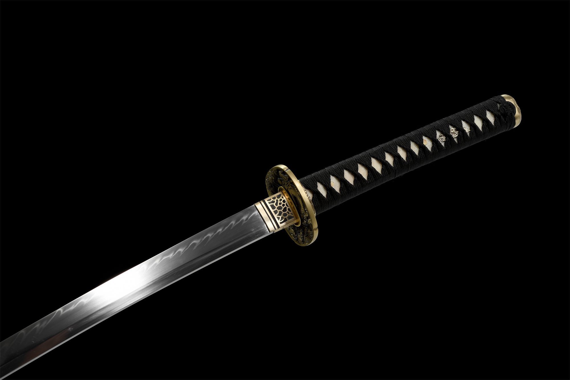 - Tsuka-ITO (柄糸): Negro trenzado sobre la empuñadura en forma de rombos.