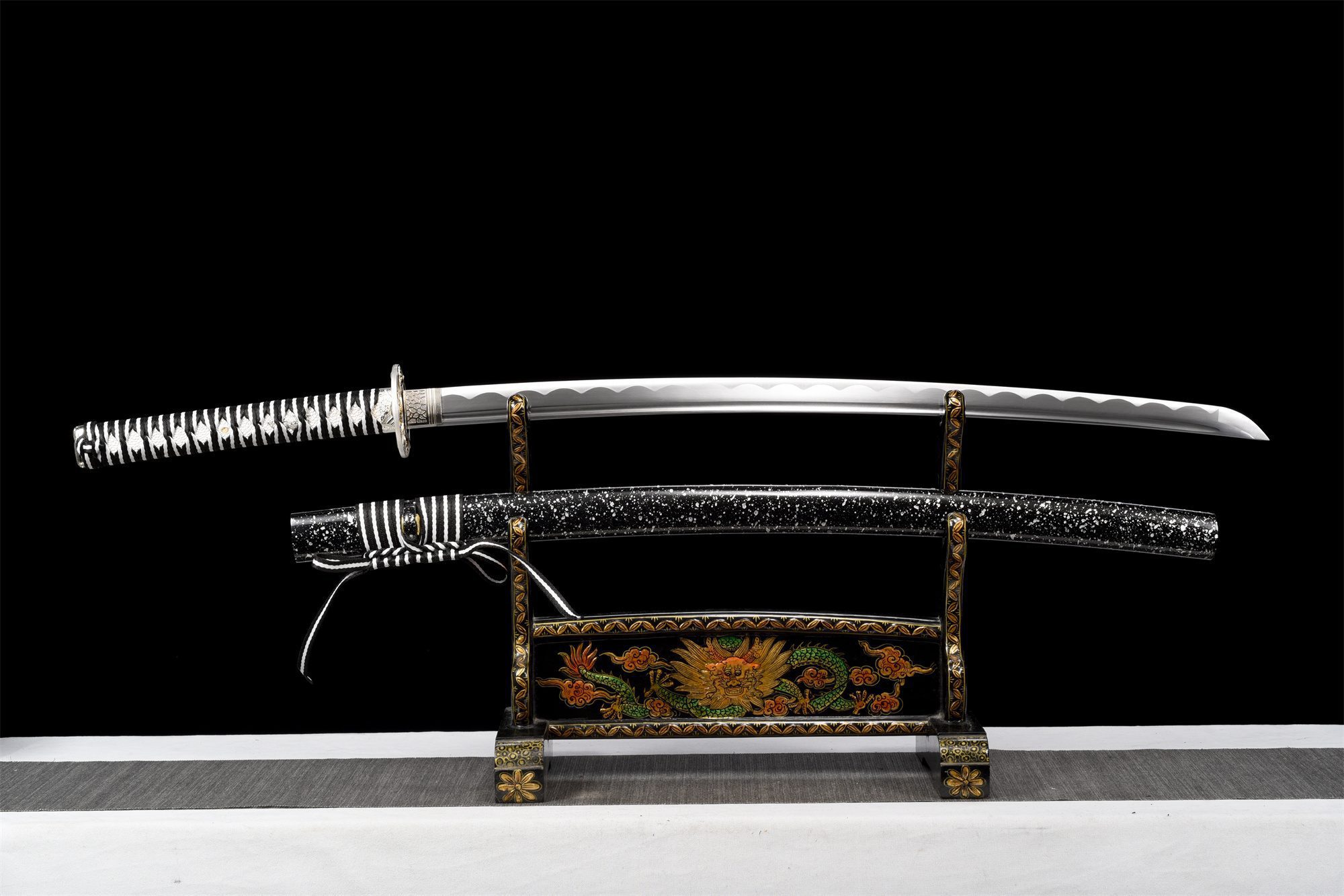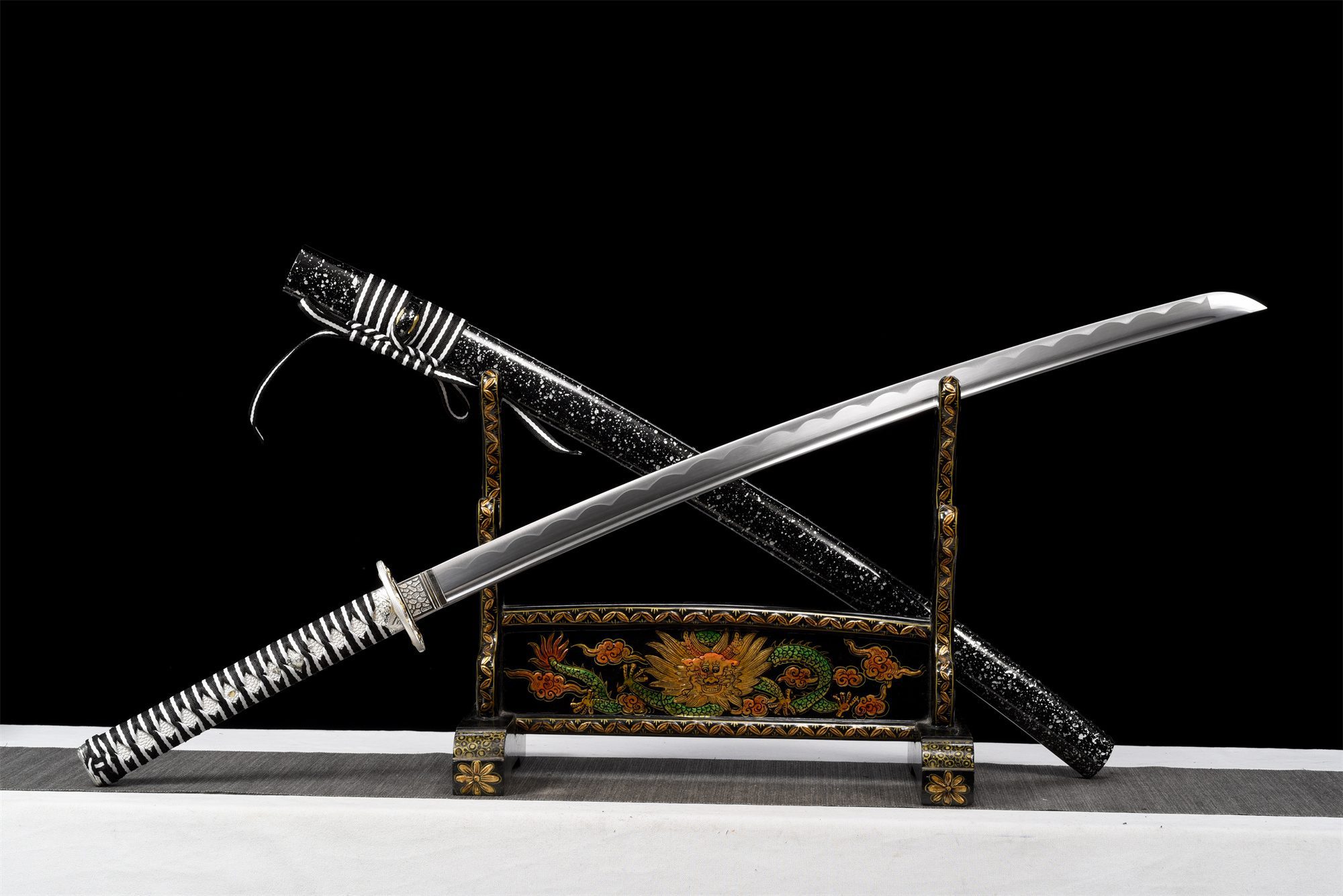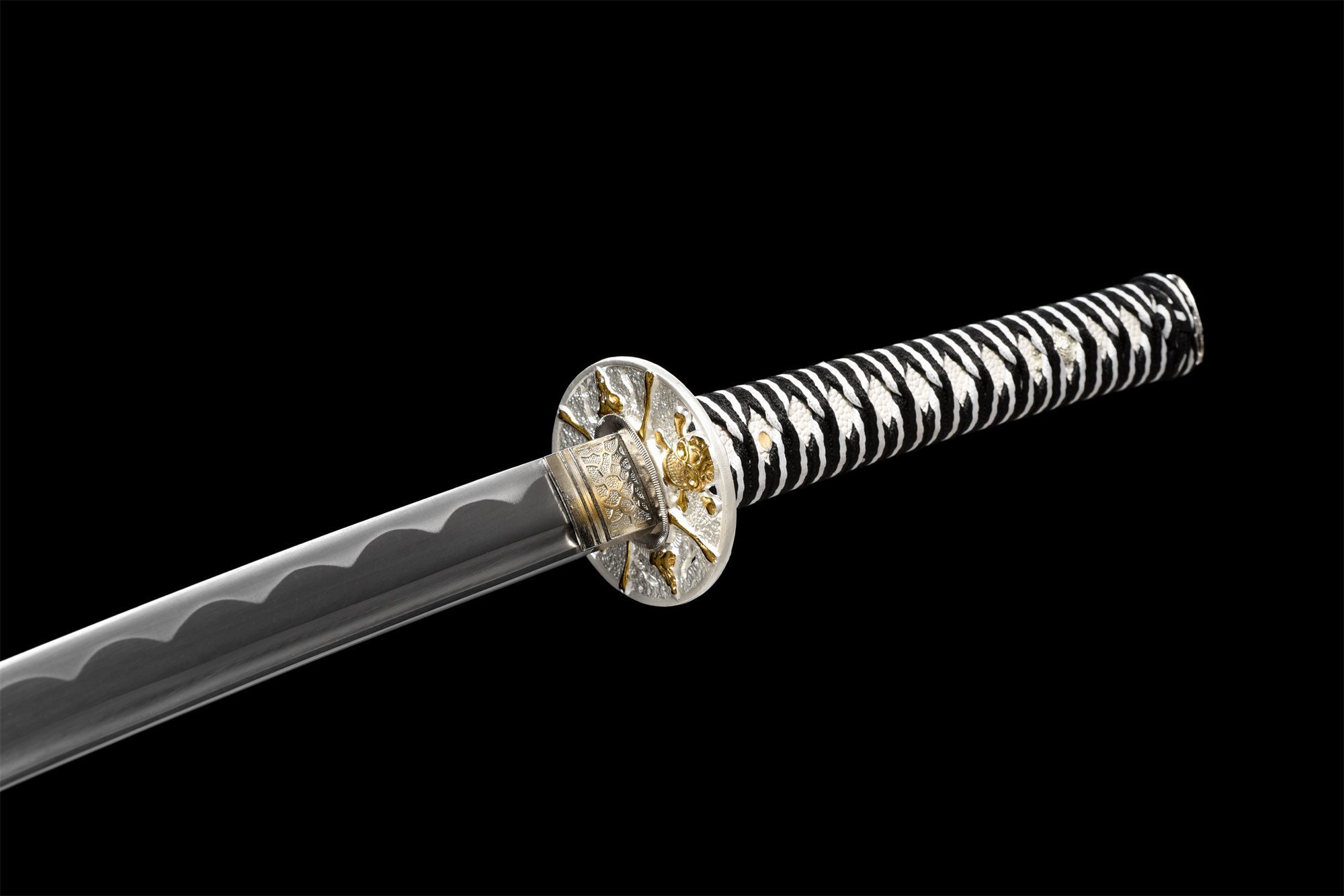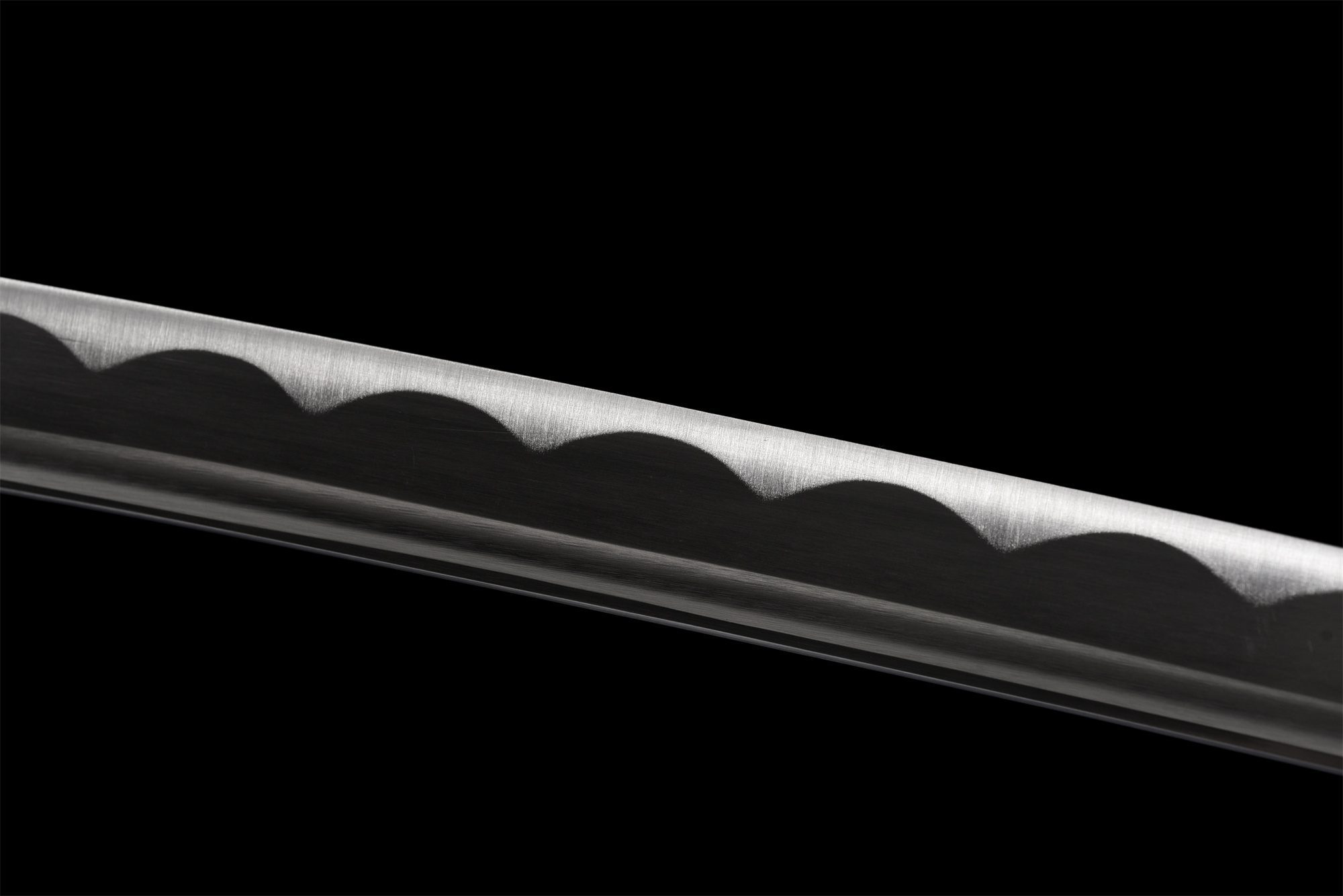 Su hoja de acero 1060 presenta un acabado negro intenso que recuerda las noches sin luna en las que los piratas surcaban los mares, mientras que el auténtico notare hamon, obtenido mediante un templado diferencial, crea ondas plateadas a lo largo del filo. El bo-hi ahuella la hoja para aligerar el peso total y produce un característico silbido cuando se mueve. La tsuba redondeada de plata está adornada con calaveras doradas, un símbolo icónico de la piratería, enmarcadas por fuchi y kashira de plata con refinados motivos florales. La empuñadura combina la tradicional piel de raya blanca con un trenzado tsuka-ito en blanco y negro con diseño de rombos, creando un llamativo contraste realzado por los menuki plateados. La vaina de madera lacada en negro está adornada con gotas de agua plateadas que evocan el rocío del mar, complementadas con un sageo blanco y negro.