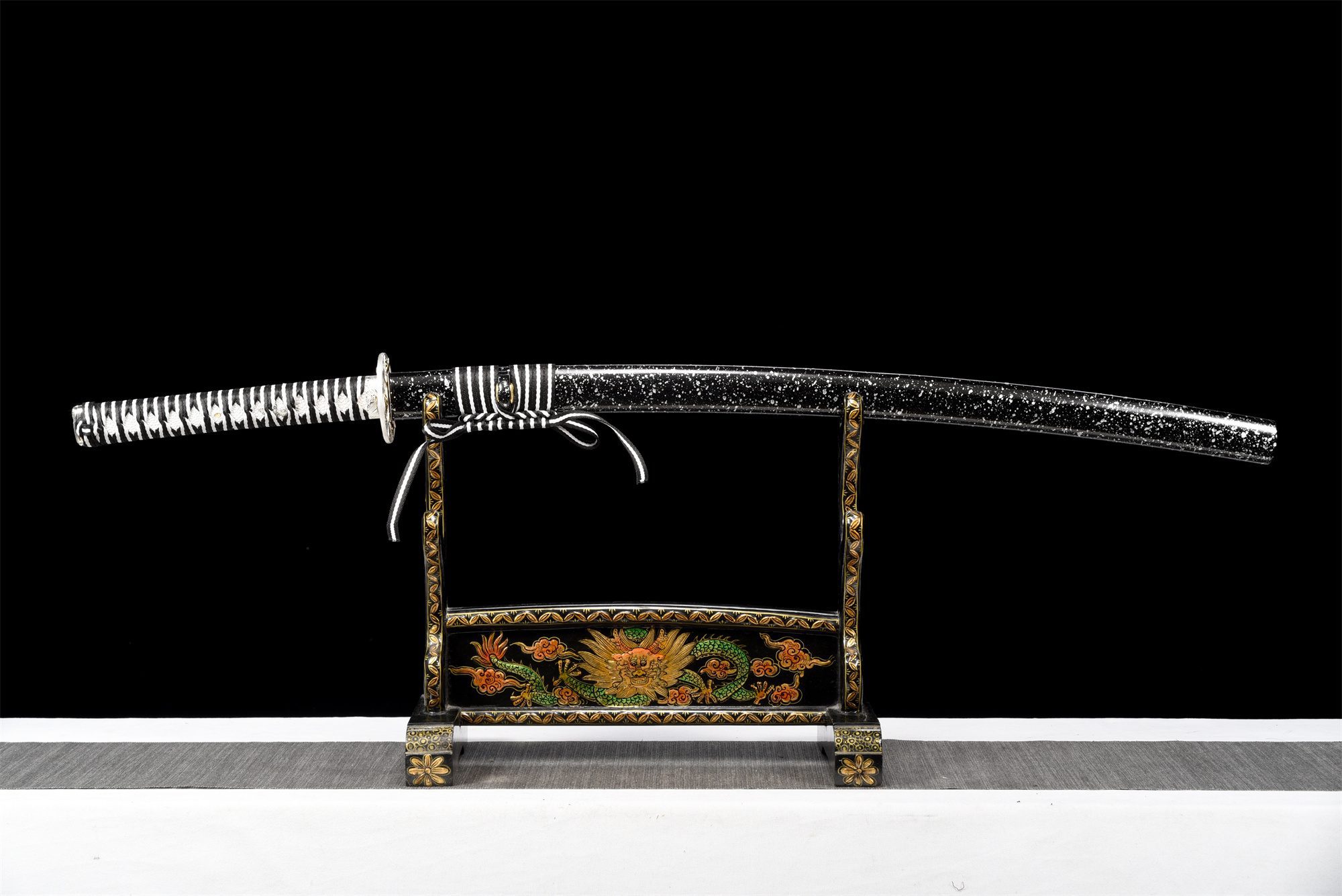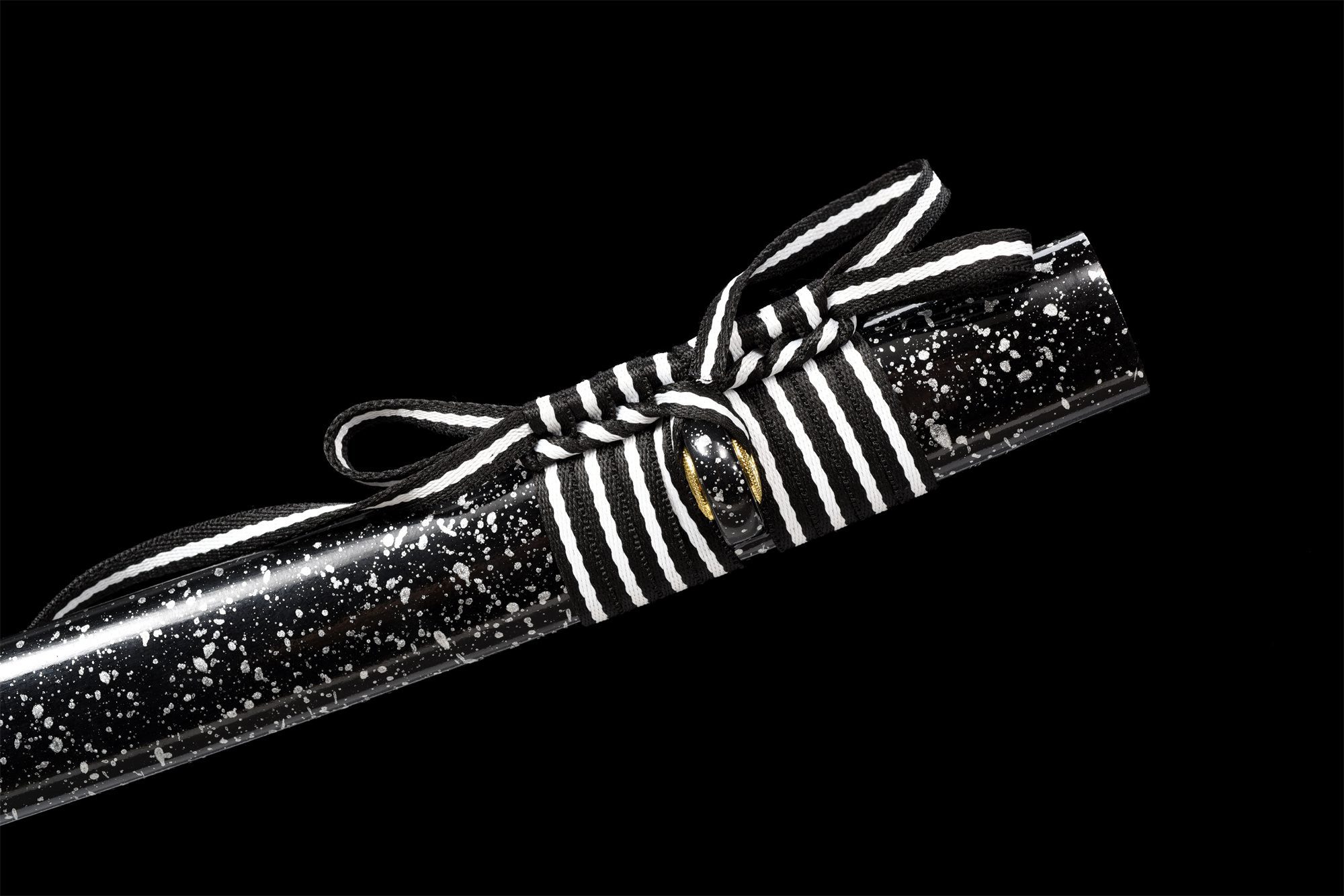 - Vaina (Saya 鞘): Madera lacada en negro con gotas de agua plateadas.