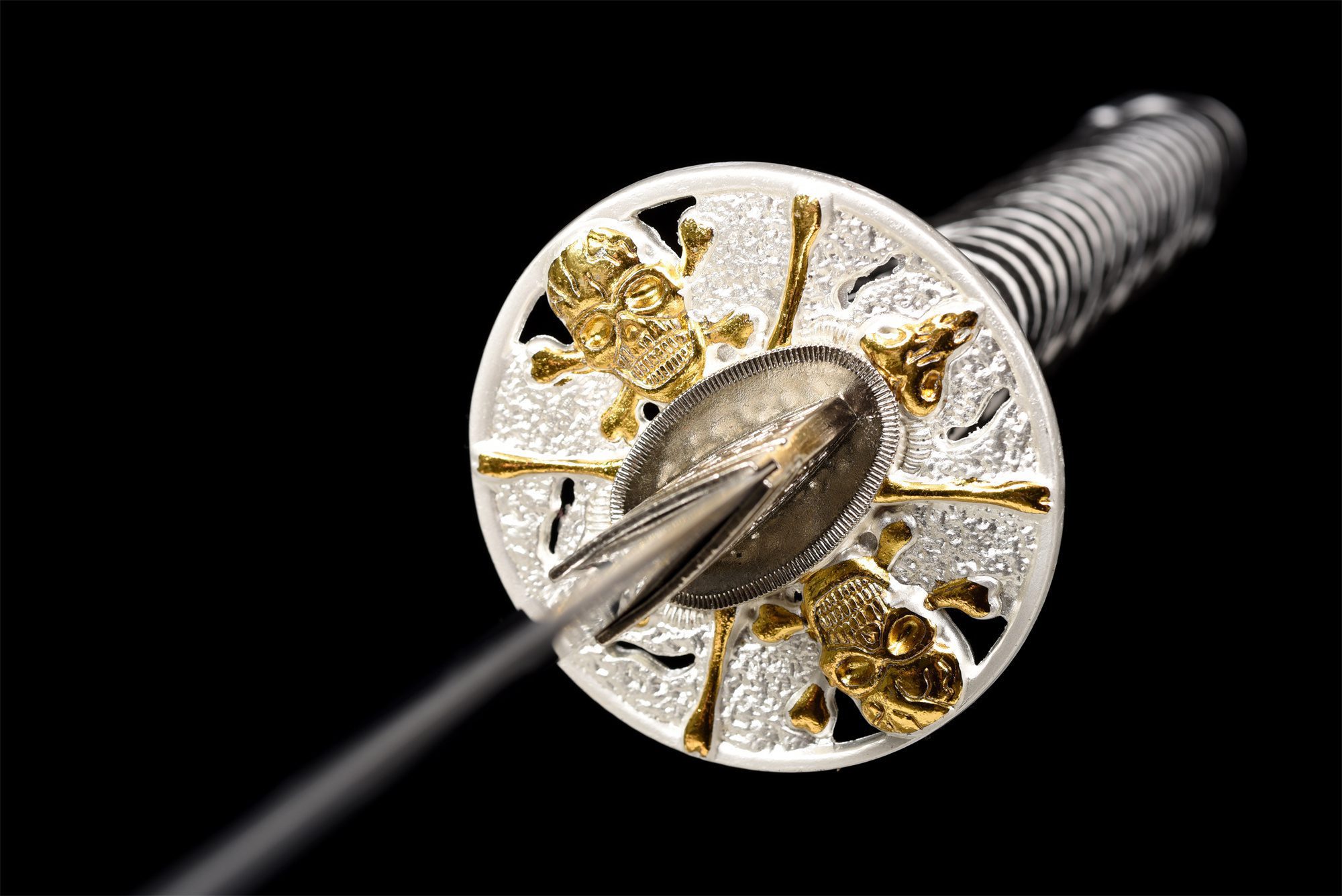- Guarda (Tsuba 鍔): Redondeada y plateada con calaveras doradas.