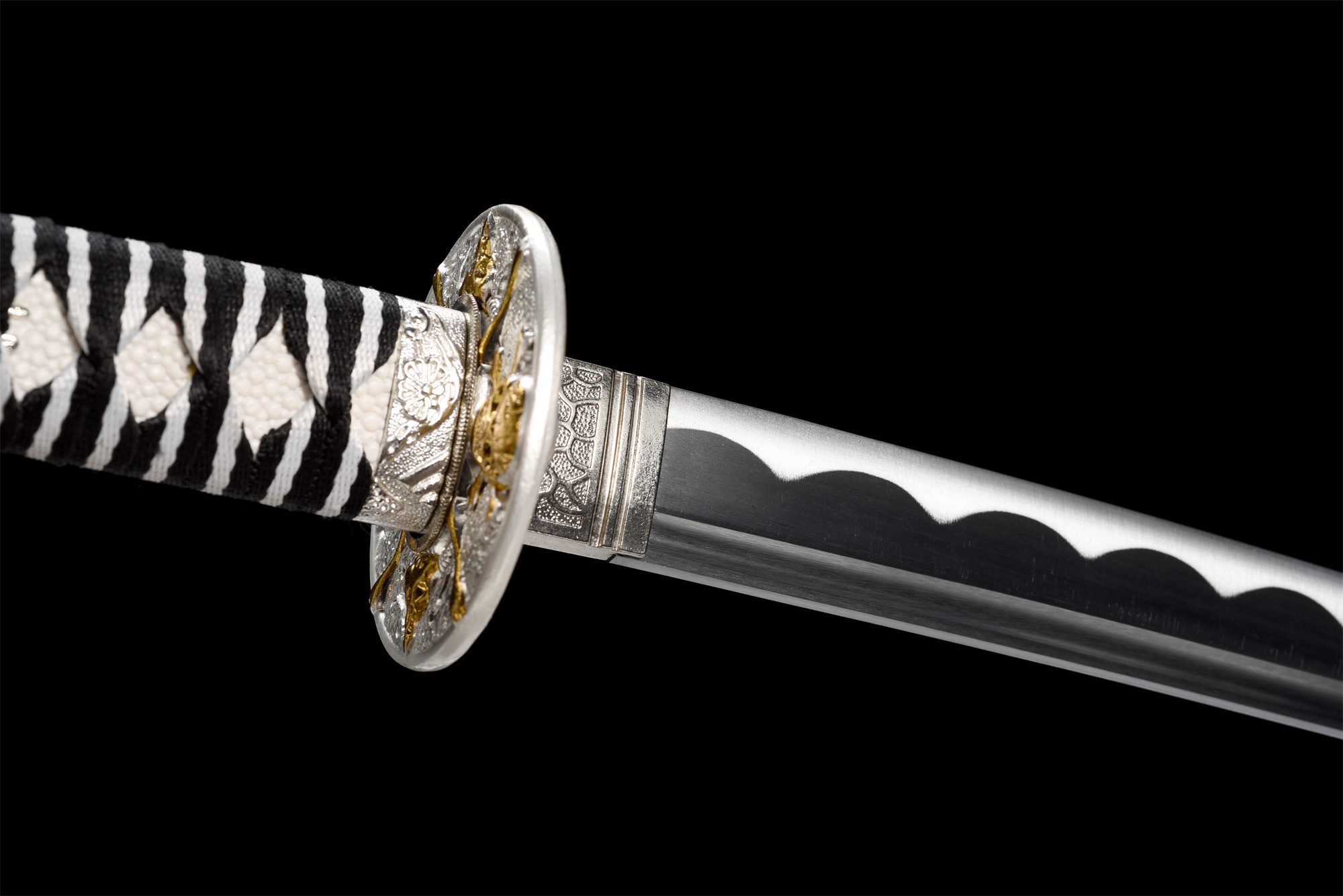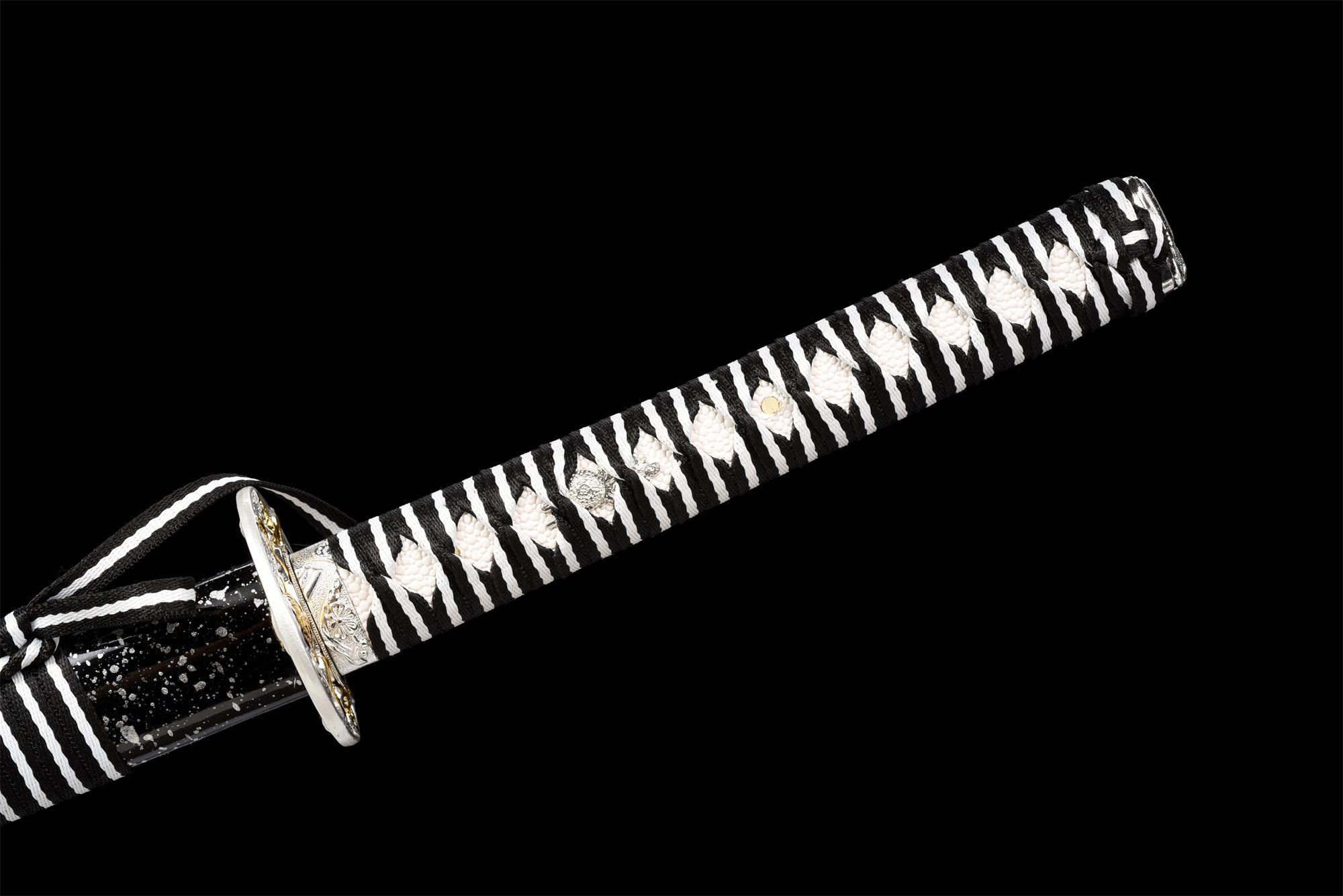 - Tsuka-ITO (柄糸): Negro y blanco trenzado sobre la empuñadura en forma de rombos.