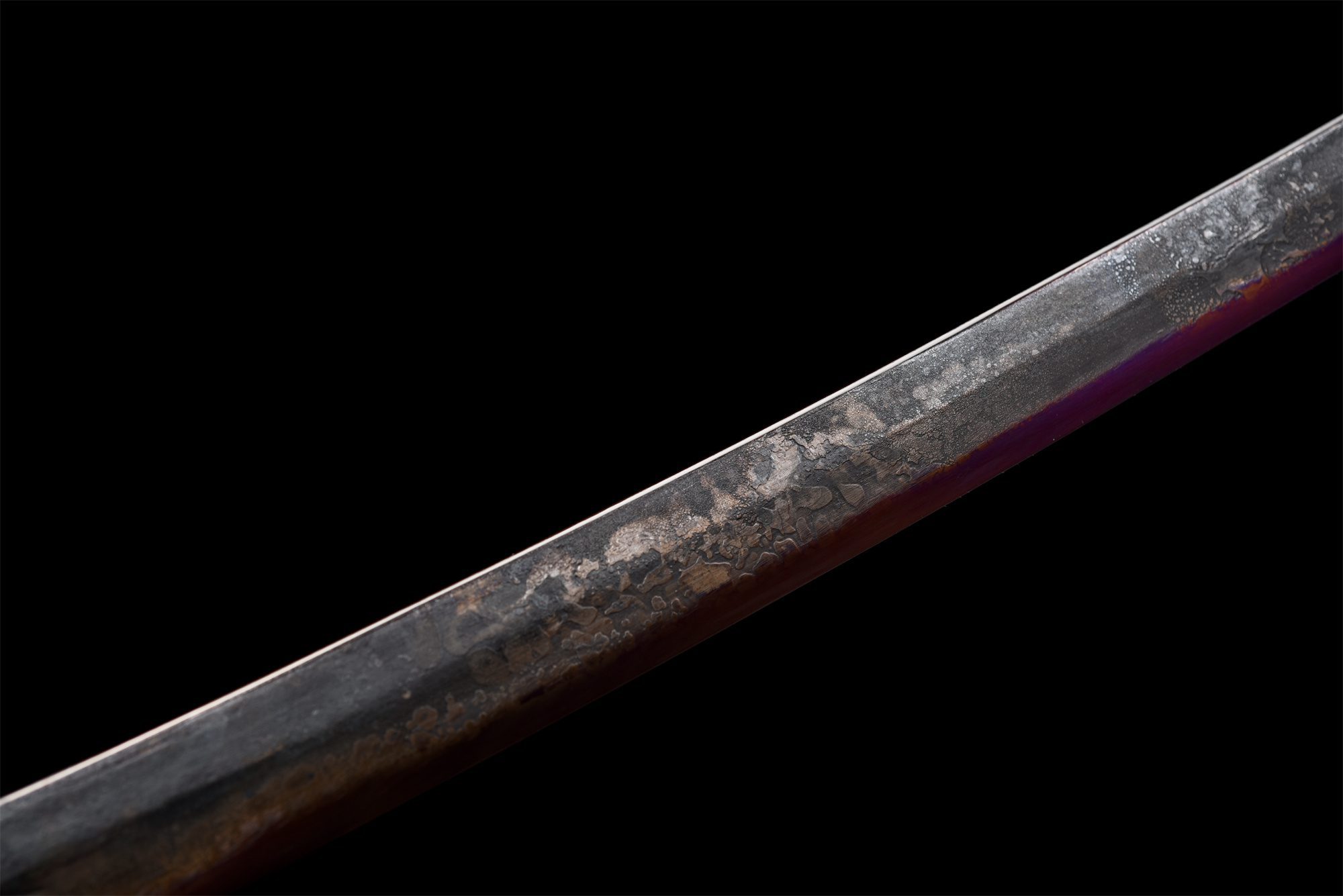 - Hoja de acero al manganeso con pátina azul y reflejos plateados, morados y rojos, afilada o sin afilar, a elección, con espiga completa.