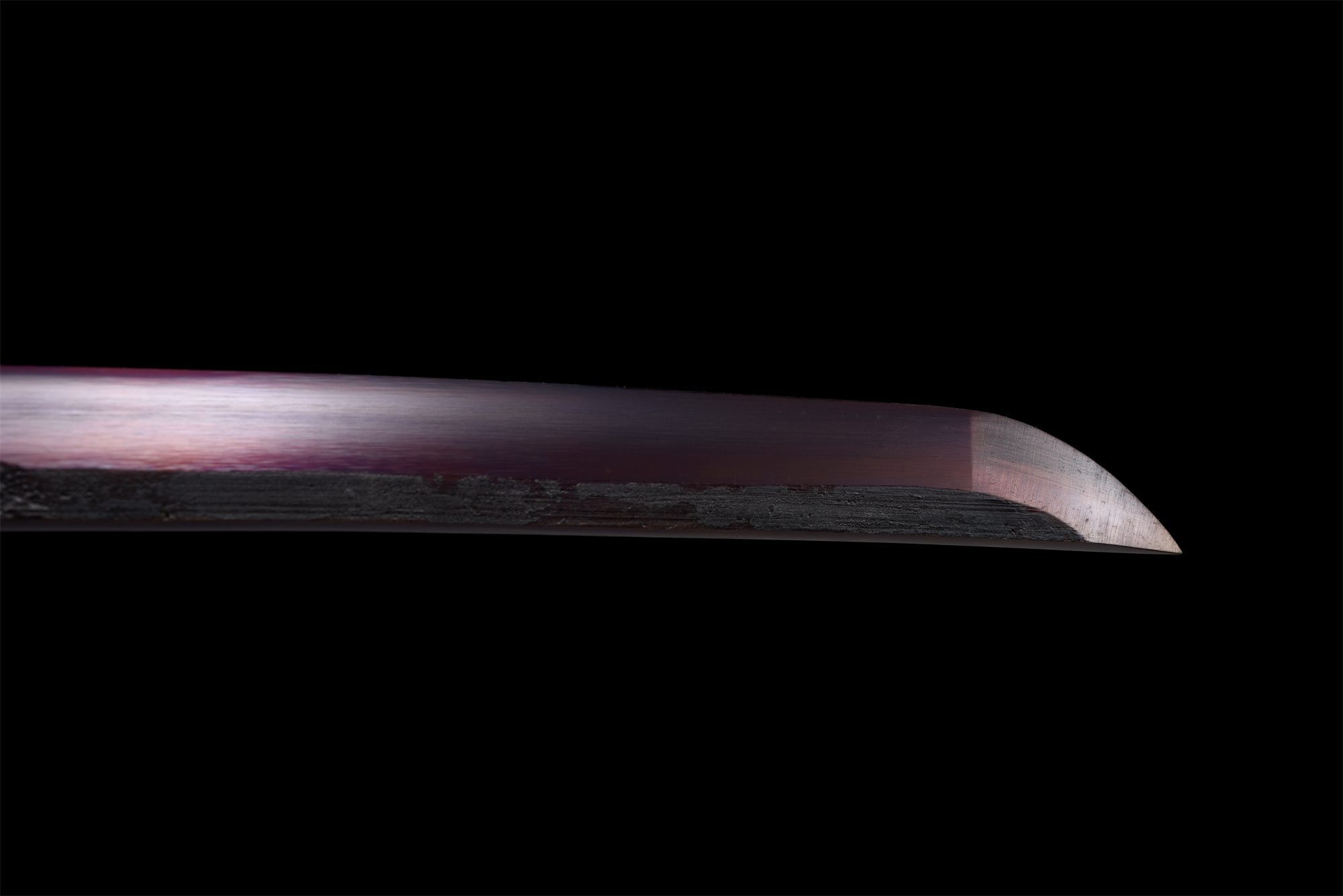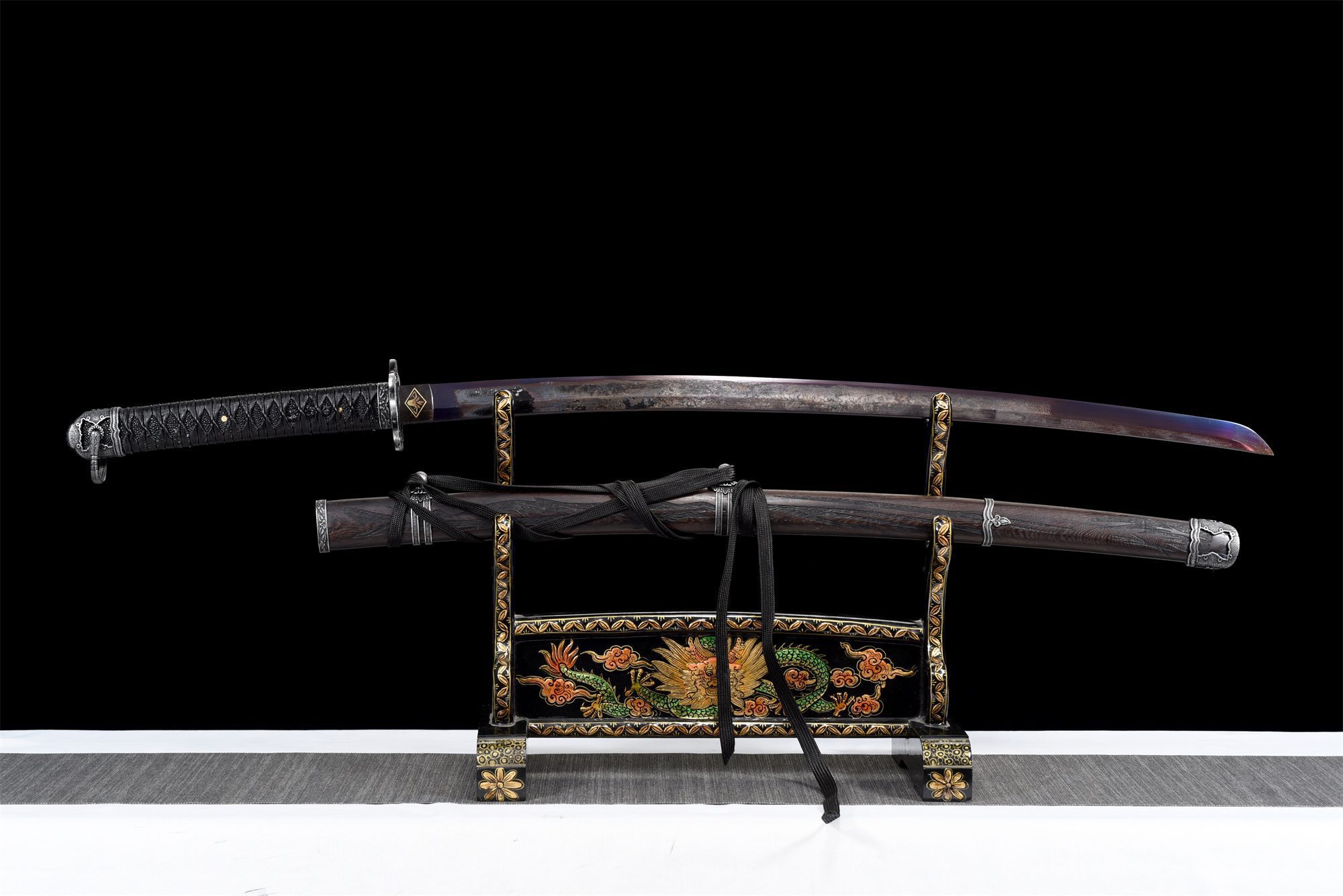 La hoja de acero al manganeso de esta réplica se distingue por su acabado de pátina azul con reflejos plateados, morados y rojos, que evocan la esencia mística de esta espada divina. Este colorido único simboliza la naturaleza sobrenatural de la Espada Mortal y su capacidad para cortar los lazos de la inmortalidad. La guarda (tsuba) de aleación de hierro chapada en plata tiene la forma de una flor de loto, símbolo budista de la pureza espiritual y el renacimiento, mientras que el habaki de latón negro se hace eco de este mismo motivo floral. La empuñadura (tsuka) combina armoniosamente piel de raya negra y palisandro, envuelta en un trenzado negro (tsuka-ito) con un patrón de rombos que garantiza un agarre firme y elegante. Los menuki representan un dragón negro, una criatura mítica asociada a la sabiduría y al poder divino. La vaina (saya) de noble palisandro está adornada con refinados detalles, como un koiguchi plateado rodeado de metal y un kojiri ornamentado, mientras que las dos presillas metálicas para el cinturón permiten un auténtico transporte militar.