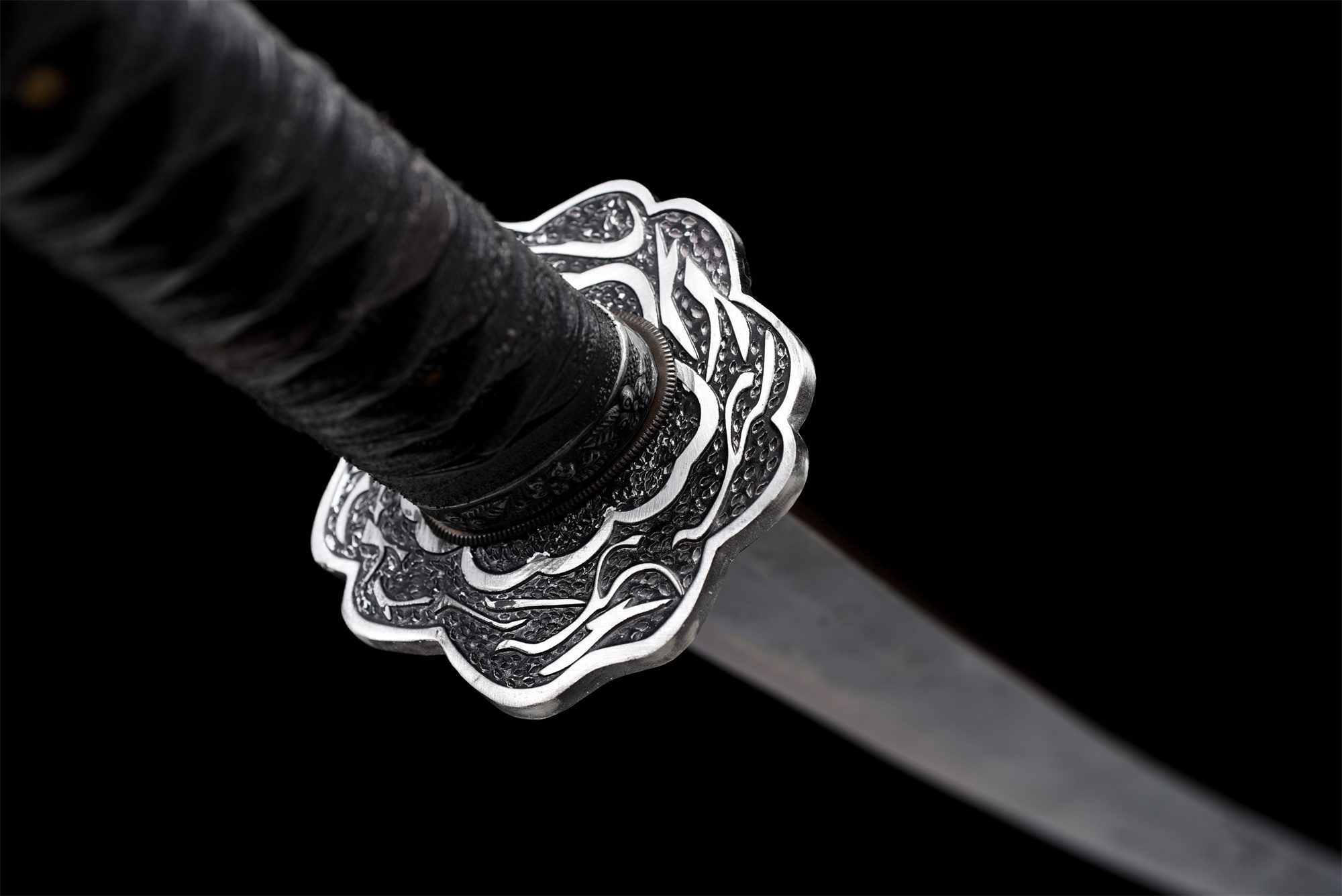 - Guarda (Tsuba 鍔): Aleación de hierro chapada en plata con forma de flor de loto.
