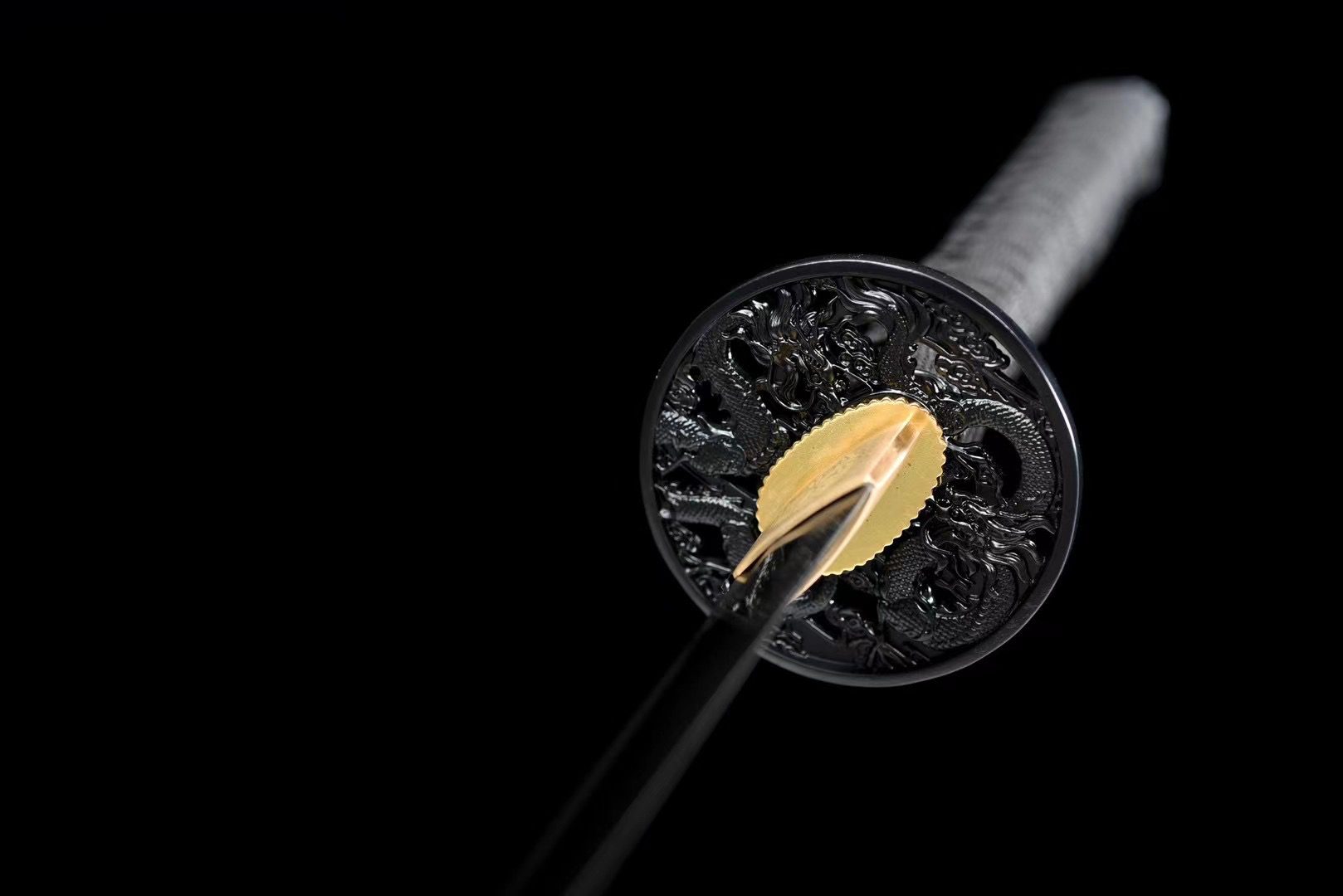 - Guarda (Tsuba 鍔): aleación negra redonda con un dragón tallado en la guarda.