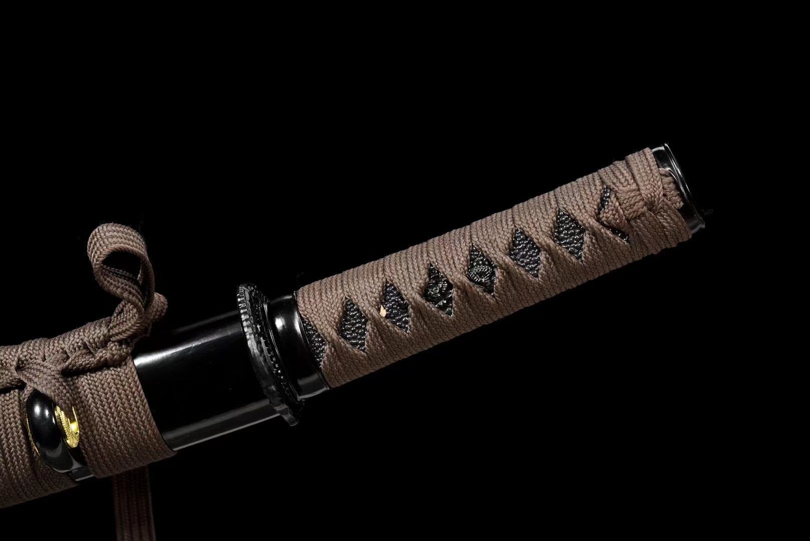 La hoja de acero T10 revela un auténtico notare hamon, resultado del templado diferencial tradicional que crea ondulaciones naturales a lo largo del filo. Esta antigua técnica confiere a la hoja una resistencia excepcional, al tiempo que preserva su flexibilidad. La tsuba representa un dragón enroscado en aleación de hierro negro, cuyas curvas fluidas complementan a la perfección la estética oscura del conjunto. El mango combina armoniosamente madera y piel sintética de raya negra, mientras que el trenzado marrón con patrón de rombos (tsuka-ito) añade un toque contrastante de calidez. Los menuki presentan dragones negros en miniatura que parecen vigilar la mano de quien lo lleva. La vaina lacada en negro está adornada con un dragón dorado pintado, una criatura celestial que se eleva majestuosamente desde la superficie oscura, simbolizando el equilibrio entre la sombra y la luz.